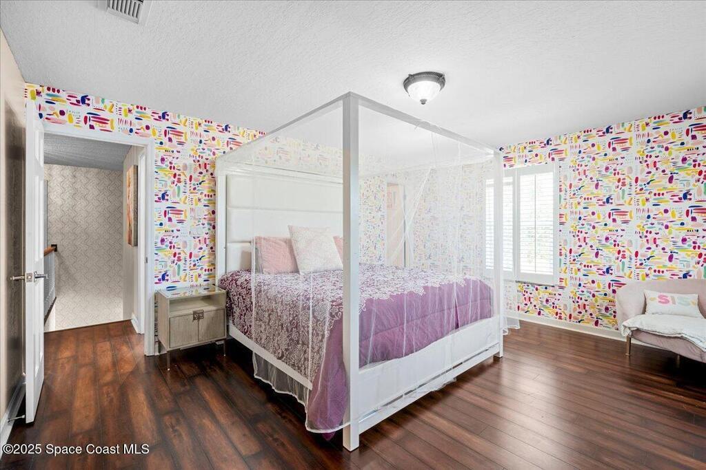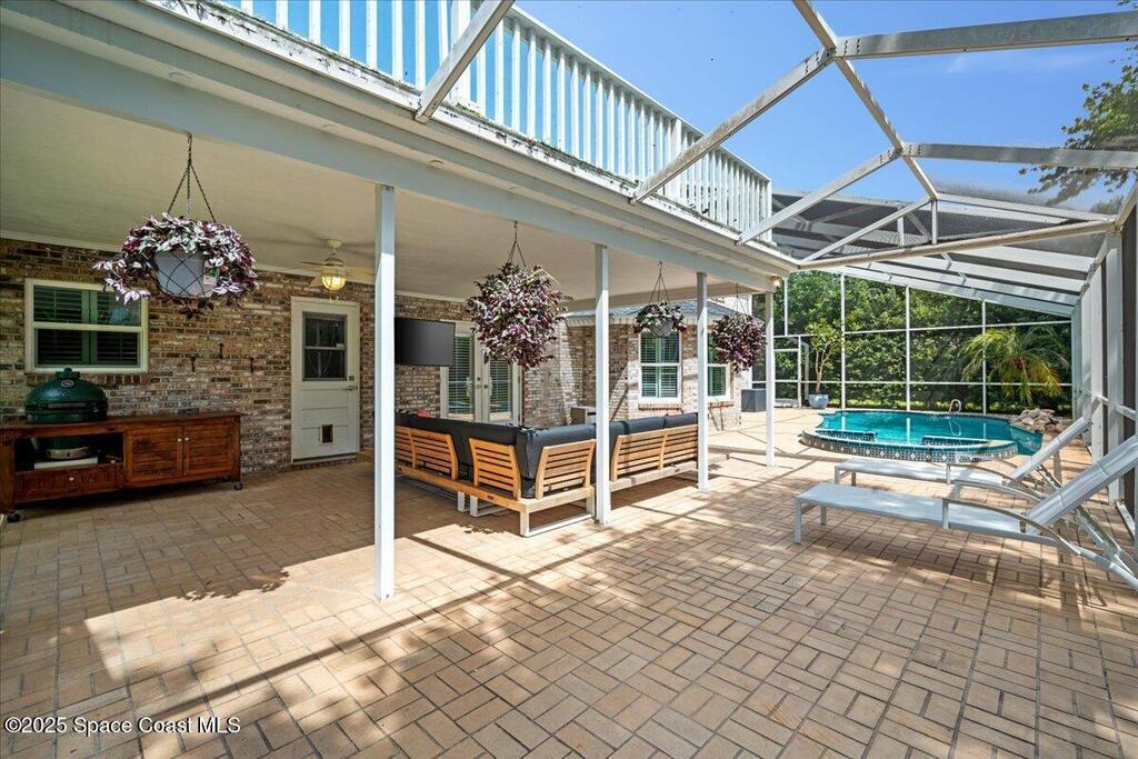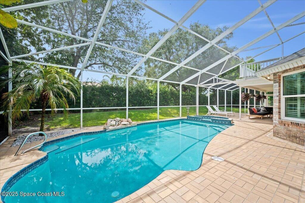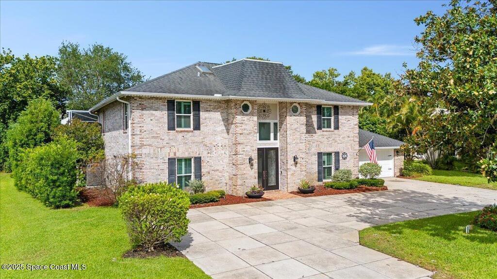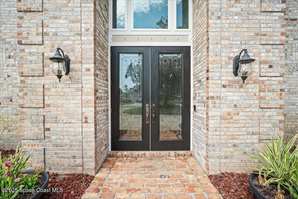 Welcome to Woodbridge, one of Suntree's most exclusive communities, known for its charming covered bridge entrance and custom estates. This unique 2-story French Provincial brick home features a circular drive with large concrete pavers and a mature magnolia, leading to an oversized 2-car garage with golf cart space. Inside, 8' French doors open to hardwood floors, travertine tile, and a chef's kitchen with solid wood cabinetry, quartz counters, induction cooktop, double ovens, and center island. Entertaining is easy with a 200-bottle wine fridge and built-in kegerator. Upstairs, the primary suite offers 4 custom closets, a beautifully updated bath with walk-in shower, dual vanities, and private turf-covered balcony overlooking the heated pool, spa, and waterfall. Enjoy the spacious lanai with covered seating and grill area. Roof 2015, HVACs 2020/2010, WH 2016, impact windows 2018, foam attic insulation, hurricane shutters, and Vivint security system.