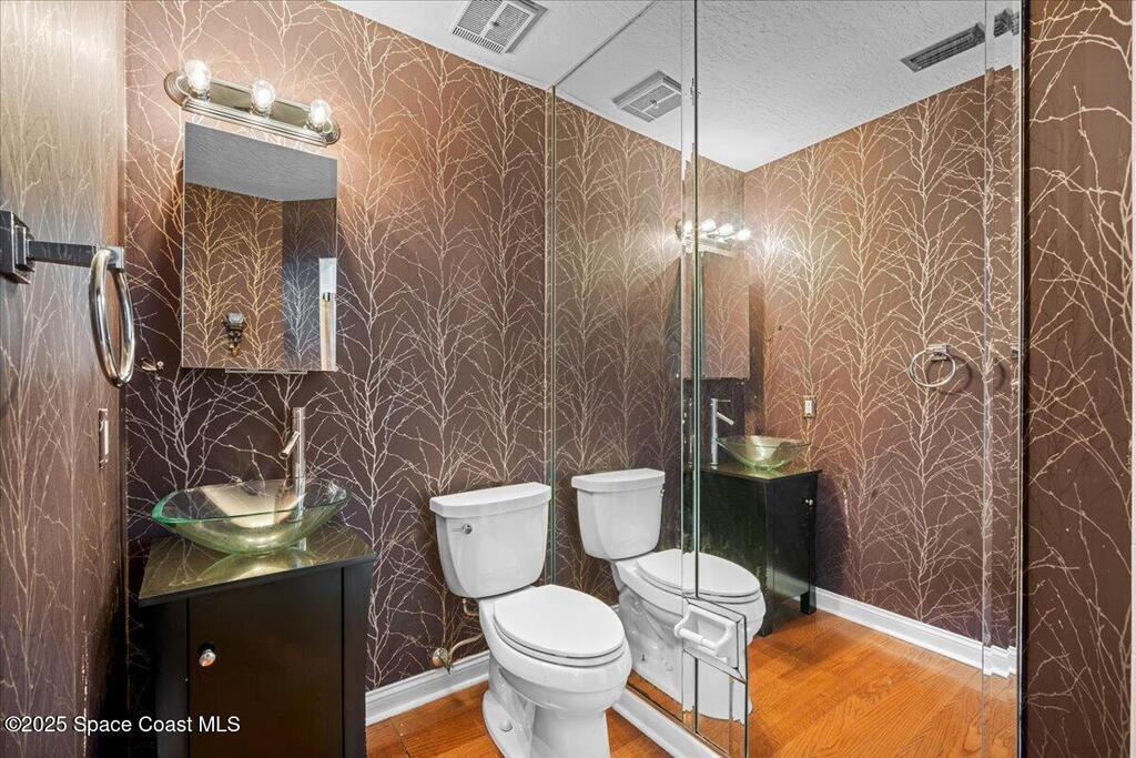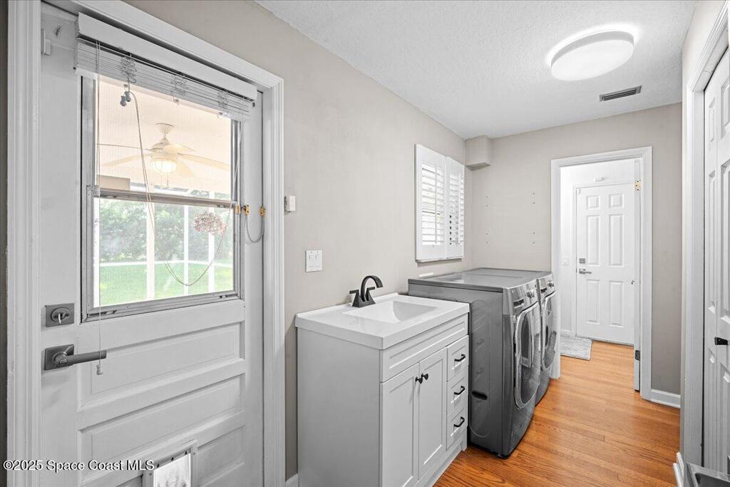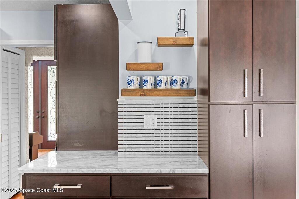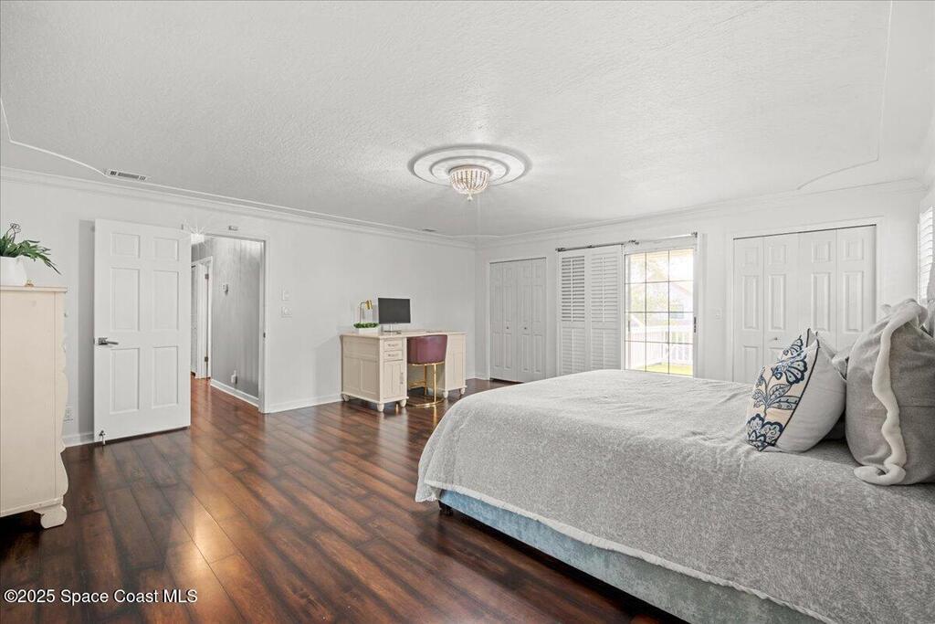 Welcome to Woodbridge, one of Suntree's most exclusive communities, known for its charming covered bridge entrance and custom estates. This unique 2-story French Provincial brick home features a circular drive with large concrete pavers and a mature magnolia, leading to an oversized 2-car garage with golf cart space. Inside, 8' French doors open to hardwood floors, travertine tile, and a chef's kitchen with solid wood cabinetry, quartz counters, induction cooktop, double ovens, and center island. Entertaining is easy with a 200-bottle wine fridge and built-in kegerator. Upstairs, the primary suite offers 4 custom closets, a beautifully updated bath with walk-in shower, dual vanities, and private turf-covered balcony overlooking the heated pool, spa, and waterfall. Enjoy the spacious lanai with covered seating and grill area. Roof 2015, HVACs 2020/2010, WH 2016, impact windows 2018, foam attic insulation, hurricane shutters, and Vivint security system.