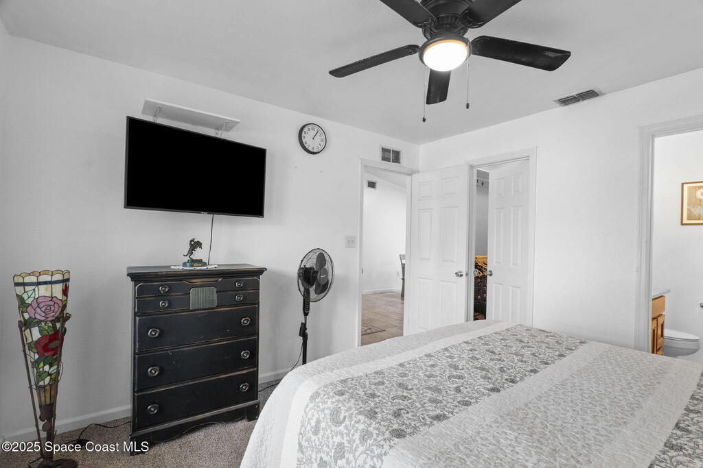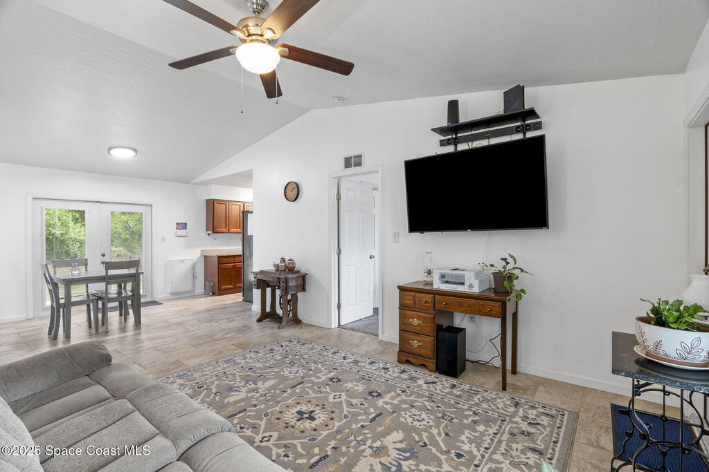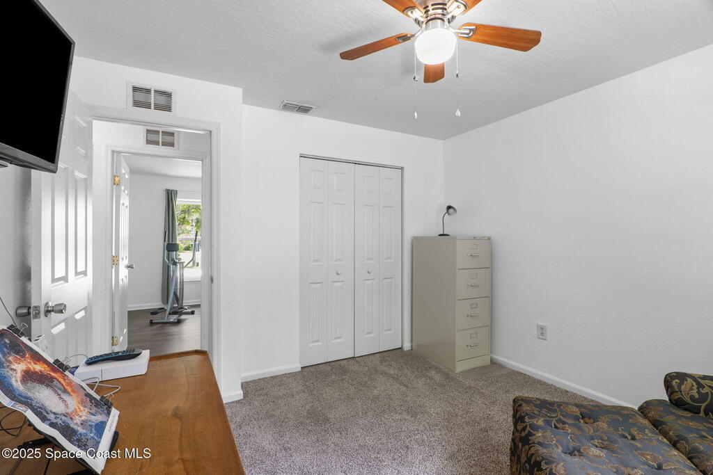 Wanting to live in the Space Coast? This MOVE IN READY home offers new windows in 2023 Updated kitchen features solid wood cabinets, granite countertops and newer appliances. The main areas have ceramic tile floors while the bedrooms have either carpet or luxury vinyl plank flooring. The glass French doors open to the patio while allowing plenty of light to fill the dining area. The metal roof was installed in 2016 and a new HVAC in 2017. The backyard is very roomy with mature shade trees. Solar panels installed in 2023 (monthly payment is $164 a month). Electric bills run $40-$80 per month.