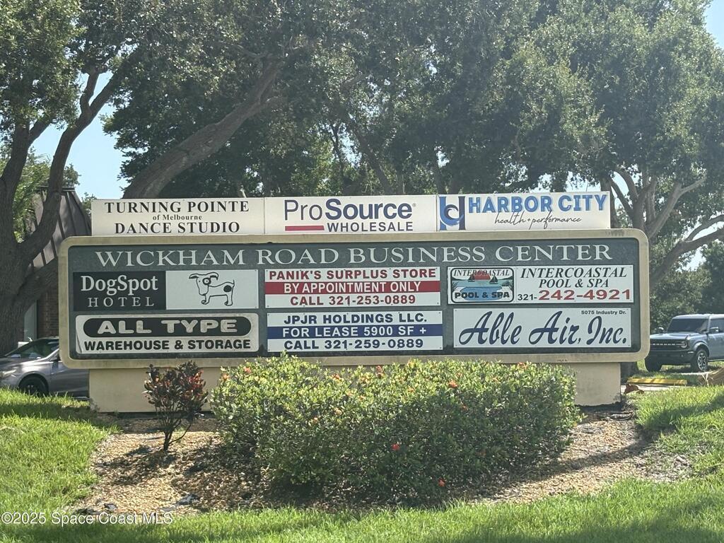 Motivated Seller - bring an offer! Industrial/Flex building for sale with signage on Wickham Rd. and on site. This property is centrally located with easy access to the Pineda Causeway, I-95, and US1. The front area has 3,000 sq' with 2 bathrooms, a lobby, and office space. The back addition has 3,289 sq' with 1 bathroom, warehouse space, and a roll up door. New owner could use both spaces or use one space and lease the other. The zoning allows for many uses including light industrial, general retail commercial, retail, warehousing, wholesale commercial. There is a security system in place and 3 HVAC zones. The property comes with a portion of the pond and many established fruit trees.