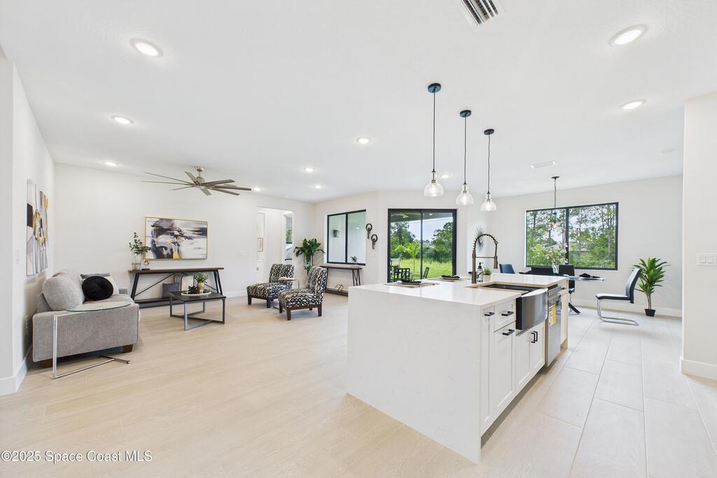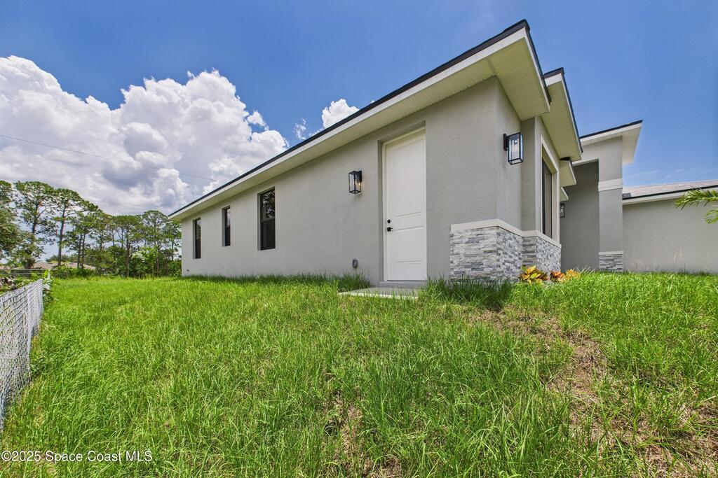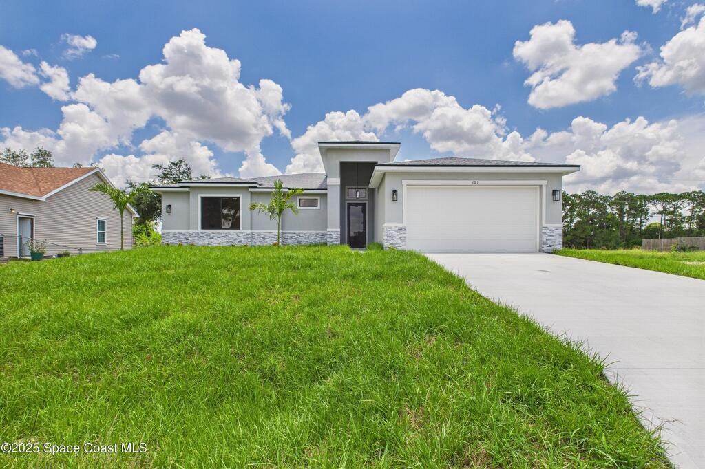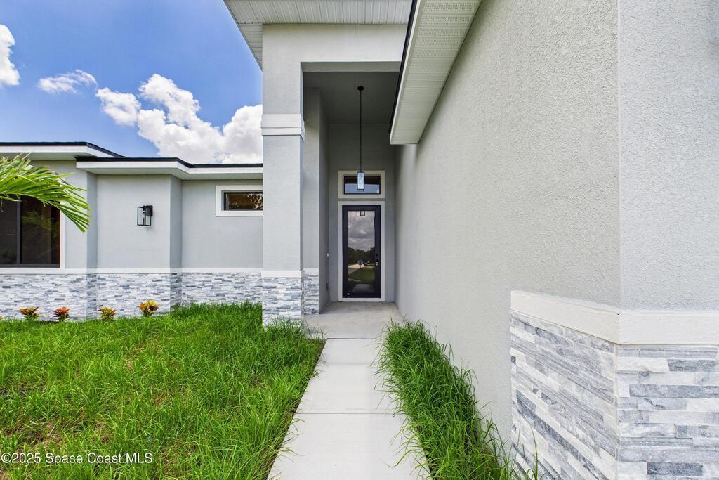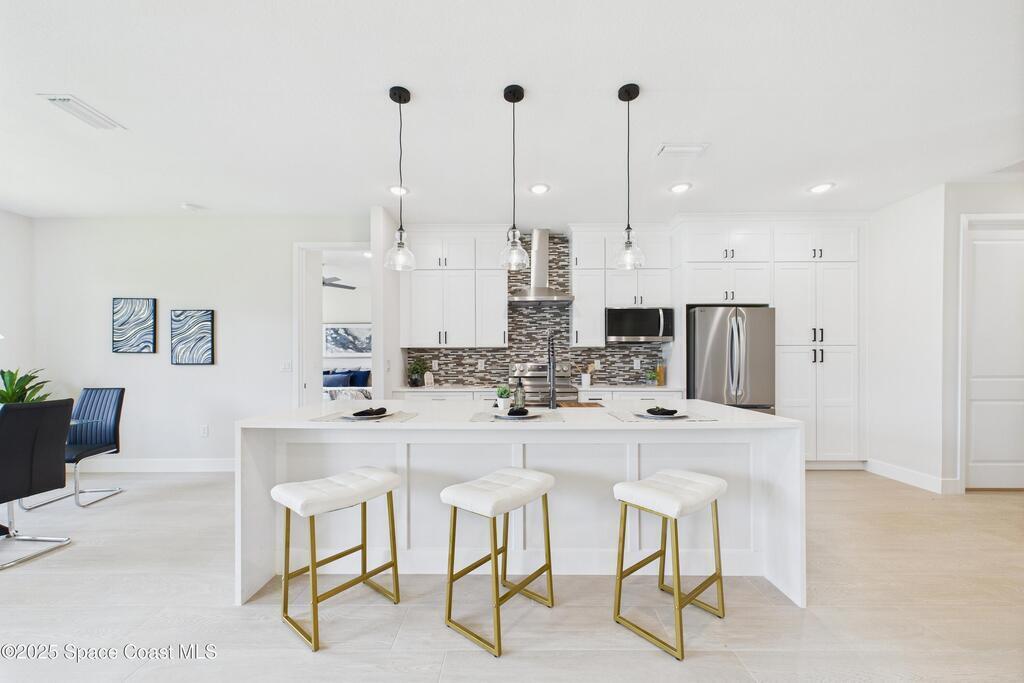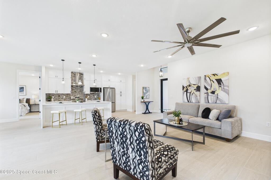 SELLER OFFERING $10K IN CONCESSIONS and an upgraded appliance package including washer and dryer. This home is perfect for multigenerational living, featuring a separate entry and private bathroom en suite, ensuring both privacy and comfort. Discover modern luxury living in Palm Bay's desirable Bayside area, close to shopping, dining, and more. This new build features 4 bedrooms, 3 full baths, and 2,108 sq ft under air. The sleek kitchen boasts a 9'x4' granite island with dual waterfall edges, Stainless steel appliances, and custom soft-close cabinets. The open floor plan flows into the dining and living areas, perfect for entertaining. 9.4' ceilings and elegant porcelain tile flooring (no carpet or vinyl) add a spacious feel. The primary suite includes double sinks, a tub, a walk-in shower, and a walk-in closet. Enjoy a covered rear patio with outdoor kitchen utilities ready. This home also includes a 2-car garage, 1-year builder warranty, and 10-year structural warranty.