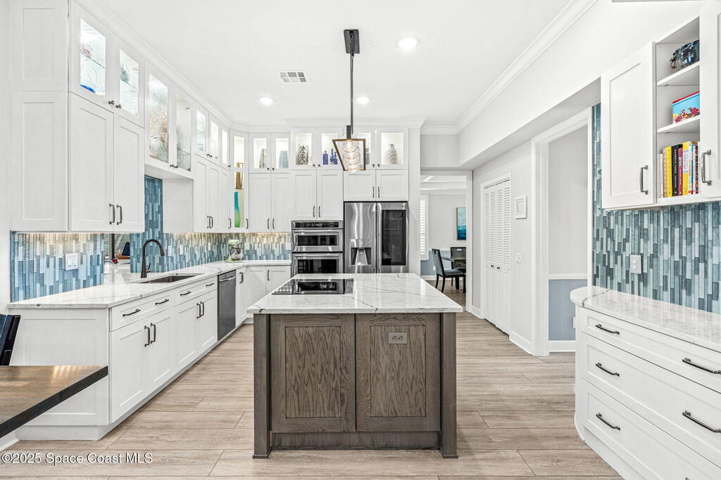 Priced BELOW appraised value! The appraisal came in HIGHER than our list price!Offering sweeping Indian River views and a resort-style lifestyle, this meticulously maintained and beautifully updated 4-bedroom, 3-bathroom brick estate seamlessly blends timeless charm with modern elegance. Spanning a generous 3,820 sq ft of thoughtfully designed living space, this turn-key waterfront home is tailored for family living, entertaining, and the ultimate Florida boating lifestyle.Step inside to discover a light-filled interior with multiple living areas including a great room, sitting room, den, and a flex/music room--all enhanced by high-end finishes such as Coretec luxury flooring, rich wood floors, plantation shutters, tray ceilings, and a warm gas brick fireplace. The expansive gourmet kitchen, completely remodeled in 2022, showcases custom solid maple cabinetry with soft-close doors, quartz countertops, glass tile accents, a built-in china hutch,