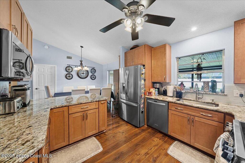 NEW ROOF. NEW A/C. NEW AEROBIC SEPTIC/DRIANFIELD. Most Affordable 4-Bedroom House in Lockmar Estates - the most desirable area in Palm Bay! As you enter, you will be welcomed by high vaulted ceilings and a foyer that opens to the formal living and dining rooms. The kitchen and bathrooms are equipped with upgraded 42-inch soft-close cabinets and granite countertops, complemented by floor-to-ceiling tile in the showers. Enjoy the convenience of vinyl flooring throughout the main living areas!Step outside to the backyard, where you can relax on the spacious covered screened porch while enjoying the privacy of an oversized lot. Neighborhood park down the street!Make this your home today!