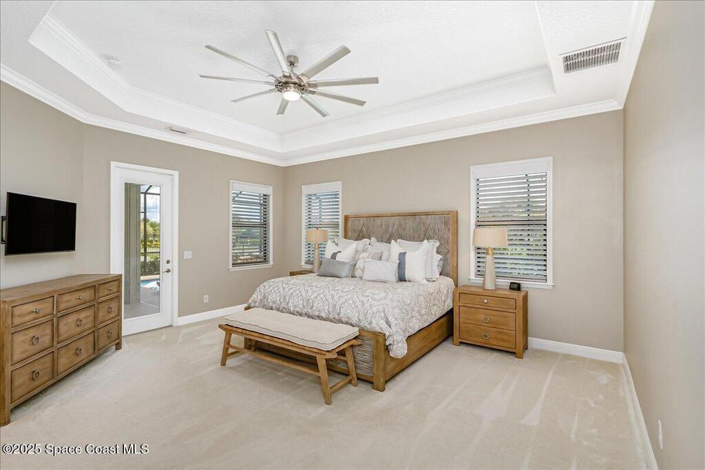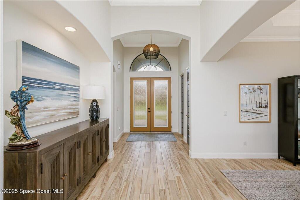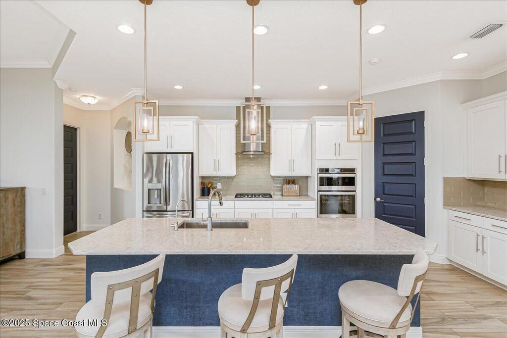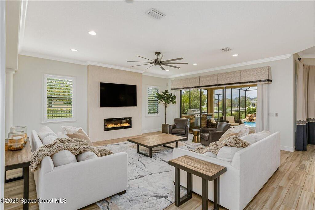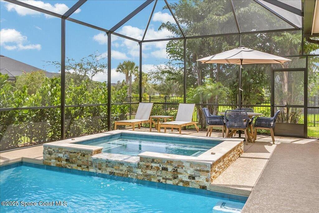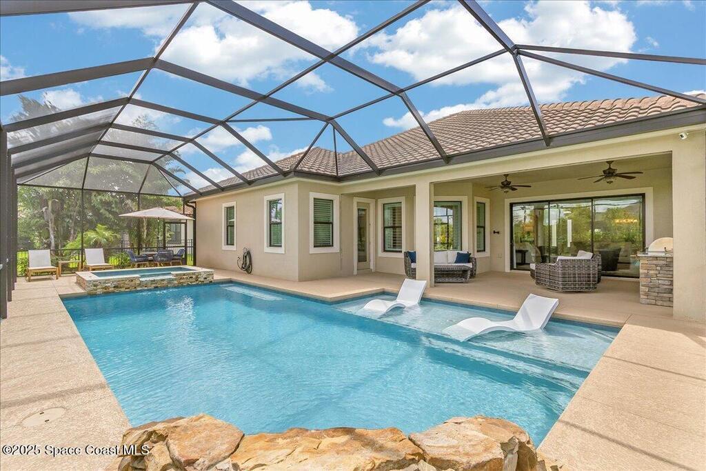 Luxurious executive pool home with sleek design finishes! Situates in one of Viera's premier gated communities, Kerrrington. Corner lot just shy of one third acre. Mature landscaping creates your own tropical paradise with heated pool and spa, 2 waterfalls, pool beach area, outdoor kitchen, high pitched screen enclosure. The interior of the home is designed in a calming neutral plate giving you a relaxed feeling all day long. This cook's kitchen has stainless steel appliances, quartz countertops, 42'' uppers, soft close cabinetry, large walk-in pantry with custom built all wood shelving and wine rack, and the seller's favorite a built in 'sonic ice' machine. Other features include barrel tile roof, 13' and 10' ceilings, 8' doors, tray ceilings, crown molding, plantation shutters, reverse osmosis water system, water softener, paver driveway and extra paver side-yard. Garage has extra side room for personal home gym or golf cart, 220v plug for an EV charger, NewAge storage system.