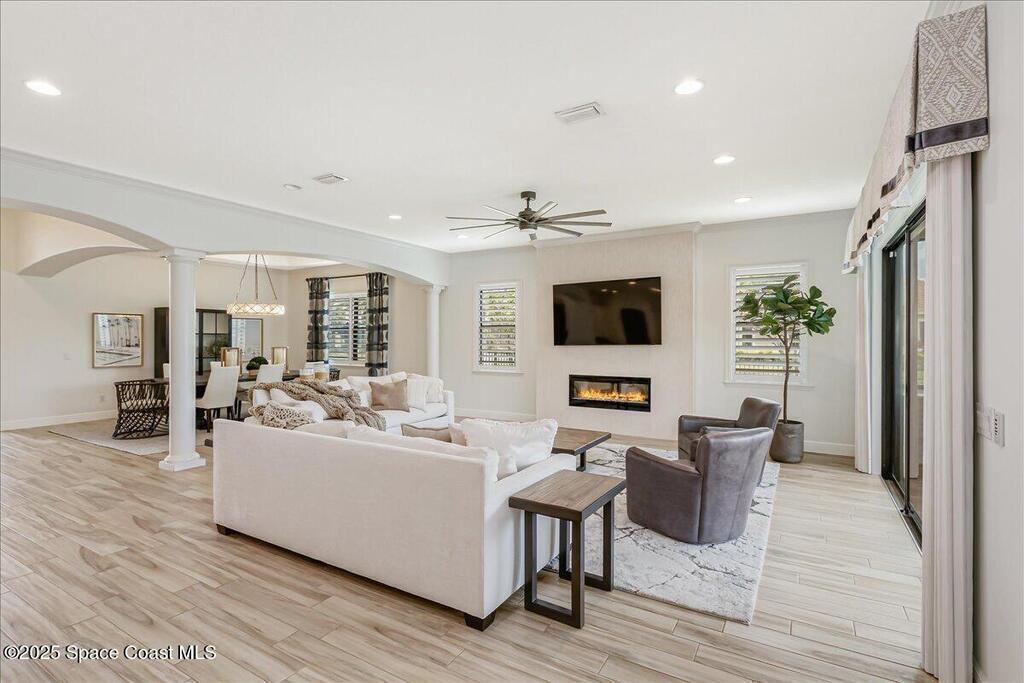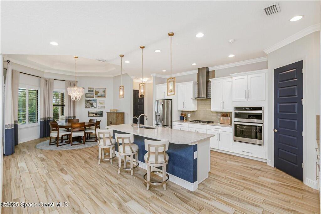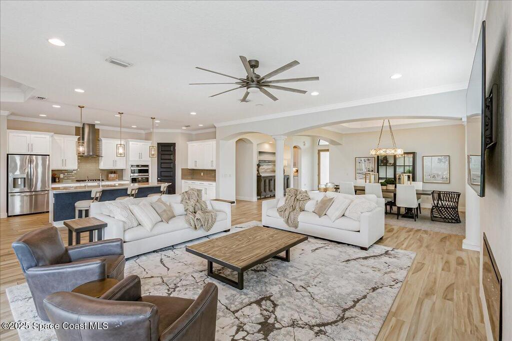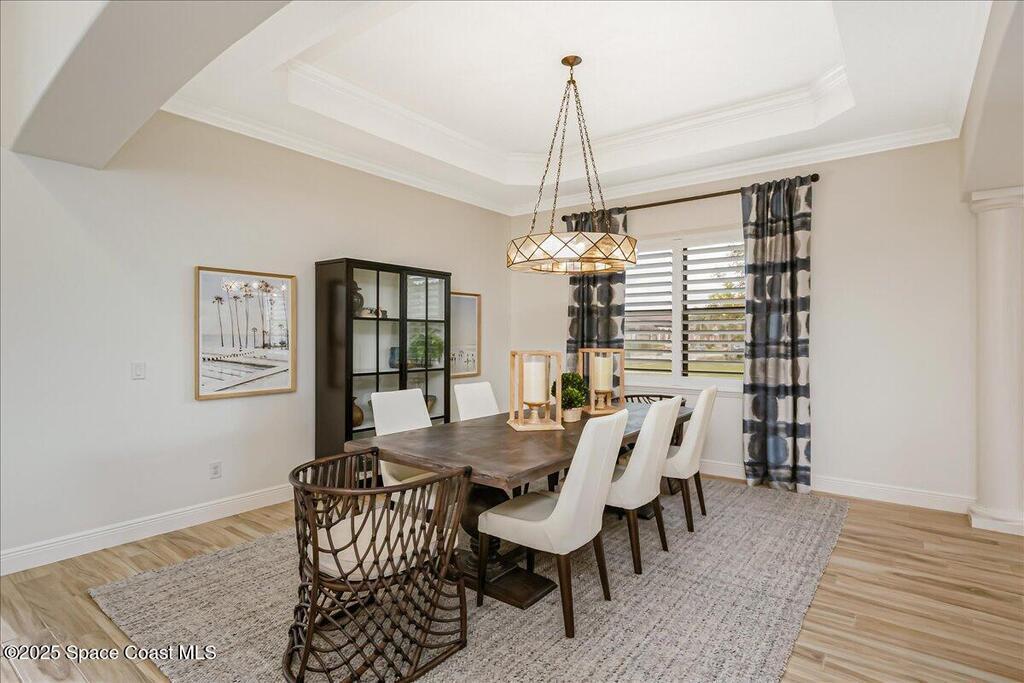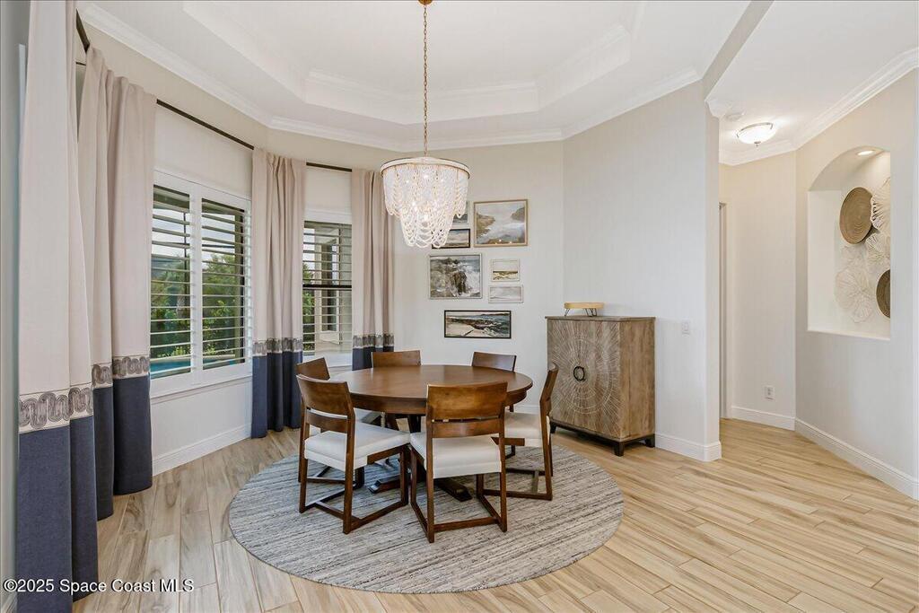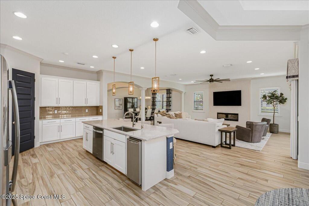 Luxurious executive pool home with sleek design finishes! Situates in one of Viera's premier gated communities, Kerrrington. Corner lot just shy of one third acre. Mature landscaping creates your own tropical paradise with heated pool and spa, 2 waterfalls, pool beach area, outdoor kitchen, high pitched screen enclosure. The interior of the home is designed in a calming neutral plate giving you a relaxed feeling all day long. This cook's kitchen has stainless steel appliances, quartz countertops, 42'' uppers, soft close cabinetry, large walk-in pantry with custom built all wood shelving and wine rack, and the seller's favorite a built in 'sonic ice' machine. Other features include barrel tile roof, 13' and 10' ceilings, 8' doors, tray ceilings, crown molding, plantation shutters, reverse osmosis water system, water softener, paver driveway and extra paver side-yard. Garage has extra side room for personal home gym or golf cart, 220v plug for an EV charger, NewAge storage system.