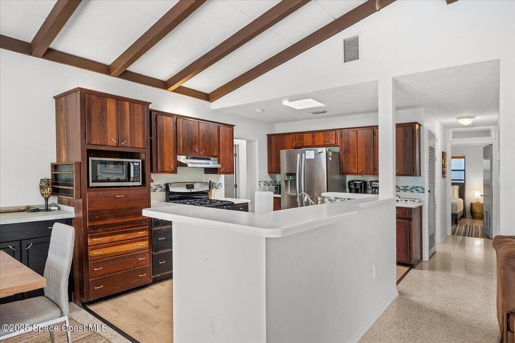 Private Oasis in the Heart of Cocoa Beach! Updated 4-bed, 3-bath pool home in the sought-after Cocoa Isles neighborhood offers the ultimate Florida lifestyle. Vaulted ceilings with exposed beams, clerestory windows, and an airy open layout create a bright, welcoming space. The kitchen features newer appliances and generous counter space, flowing into the living and dining areas--ideal for entertaining. The primary suite includes a resort-style bath with walk-in shower, while a converted garage adds 424 sq ft and a third full bath--perfect for multigenerational living or rental income. Enjoy a sunroom, mature landscaping, shaded patios, and a private plunge pool. With a 2-car carport, oversized driveway, and RV space, this home delivers comfort, flexibility, and charm. Whether you're dreaming of beachside living or searching for a savvy Airbnb or long-term rental investment, this versatile home is ready to impress--just minutes from the sand, surf, and all that Cocoa Beach has to offer.