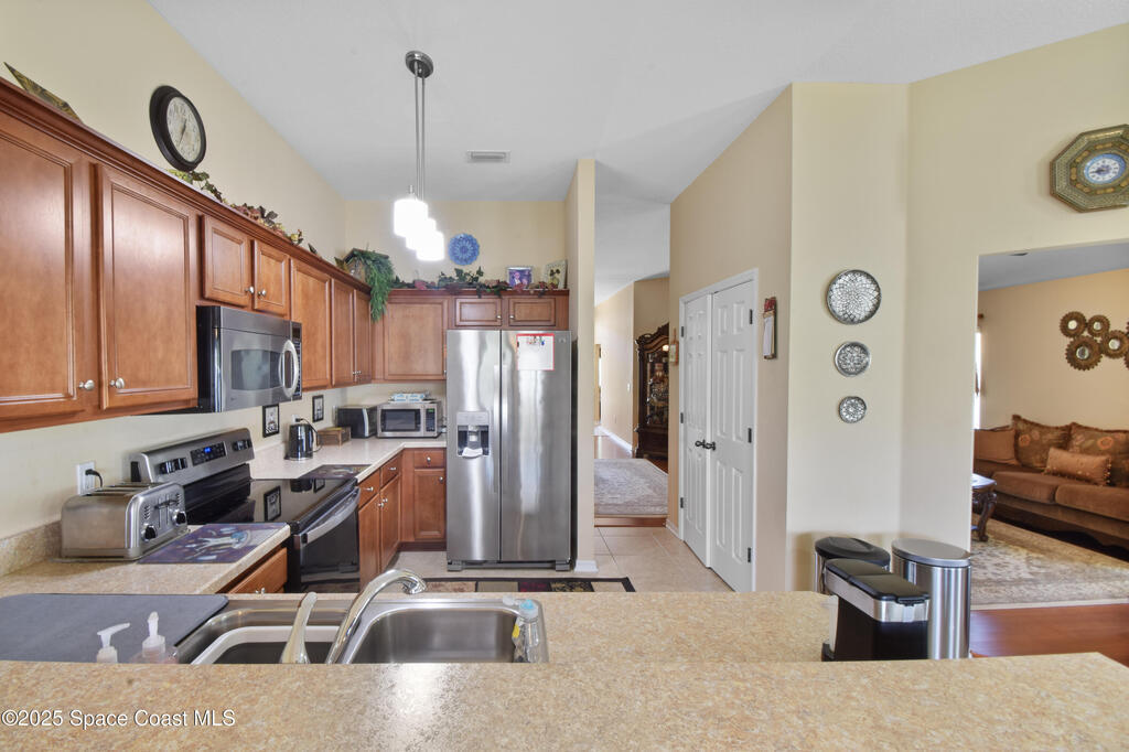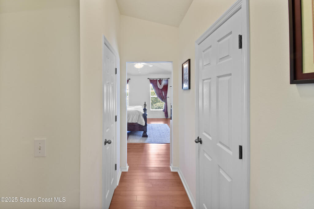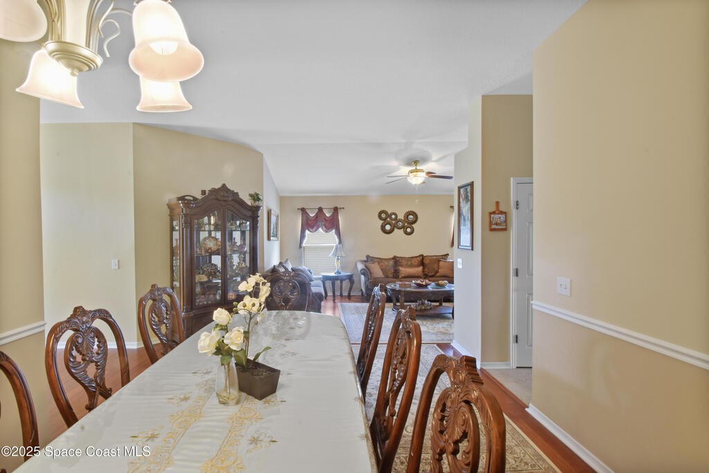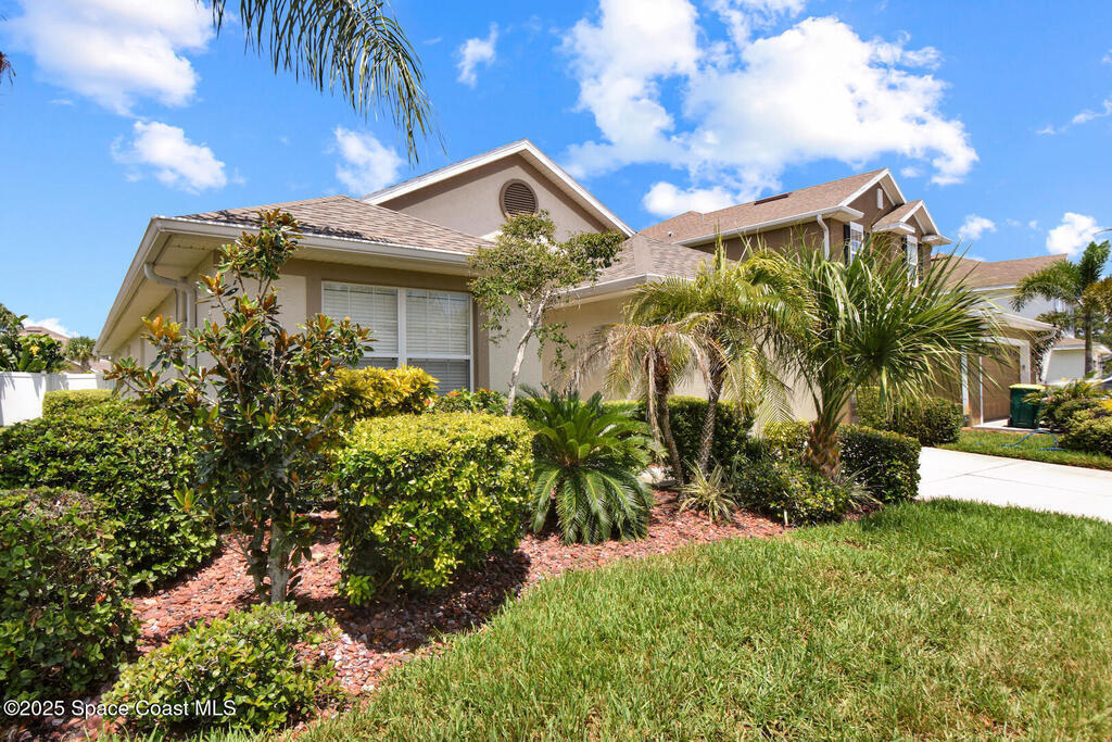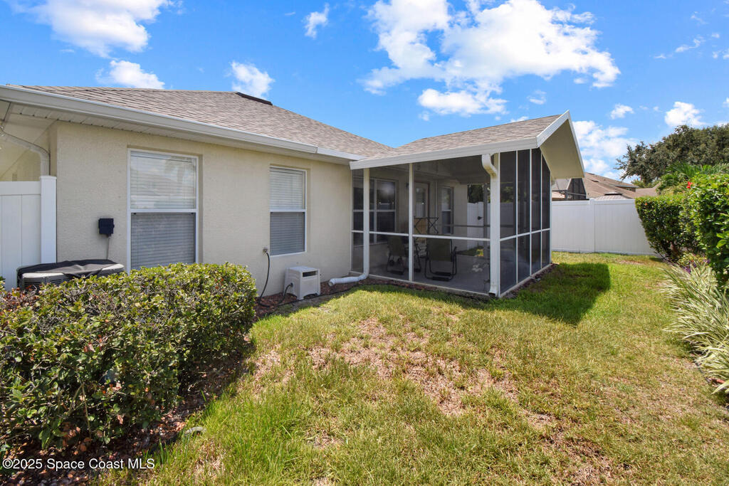 Pristinely maintained home in the gated community of Capron Ridge in Viera! This spacious residence offers high ceilings, a split floor plan, two living rooms, a 2024 roof, 2019 AC, and an indoor laundry room with washer and dryer included. Home features plantation-style blinds and window treatments throughout. The private master suite has a dedicated entry hallway, his-and-hers closets, and a luxurious en suite with a walk-in shower, soaking tub, and dual-sink vanity. Some seller updates include replacing sprinkler compressor, controls and heads, Whirlpool electric range and dishwasher, exterior paint, and a replaced air handler fan motor (7/25). Enjoy the vaulted, screened-in porch and a fenced backyard with no rear neighbor. Updated garage motor includes IQ WiFi. Sidewalks throughout the neighborhood. Just a short walk to the pool, clubhouse, and basketball court. Schedule your showing today!