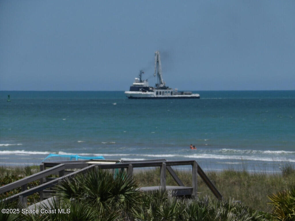 STUNNING VIEW! DIRECT OCEAN. Relax on oceanfront balcony! Watch dolphins, rockets, cruise ships and submarines from living room. Enjoy private beach access in gated community near Port Canaveral. POOL, SPA, SAUNA, CLUBHOUSE, TENNIS, PICKLE-BALL, EXERCISE ROOM & SHUFFLEBOARD! Fishing from beach and Jetty Park. Walk in the waves to Cocoa Beach Pier. Shorewood is an active community with social activities and committees to suit every passion and hobby. New ac/furnace 2021. 3rd floor great view! 868 sq ft (air) 1028 sq ft (total) 1 Bedroom 1 1/2 Bathrooms. Oceanfront balcony off living room. Bedroom has en-suite with shower. Half bath for guests in hall complete with washer and dryer. Beautiful mirrored closets in hallway leading to kitchen and living room reflect the ocean. Newer porcelain tile and carpet. 1 car enclosed garage under building. 30 day minimum rental.Concrete restoration already approved and in progress 2025/2026 - info provided for buyer due diligence. New roof 202
