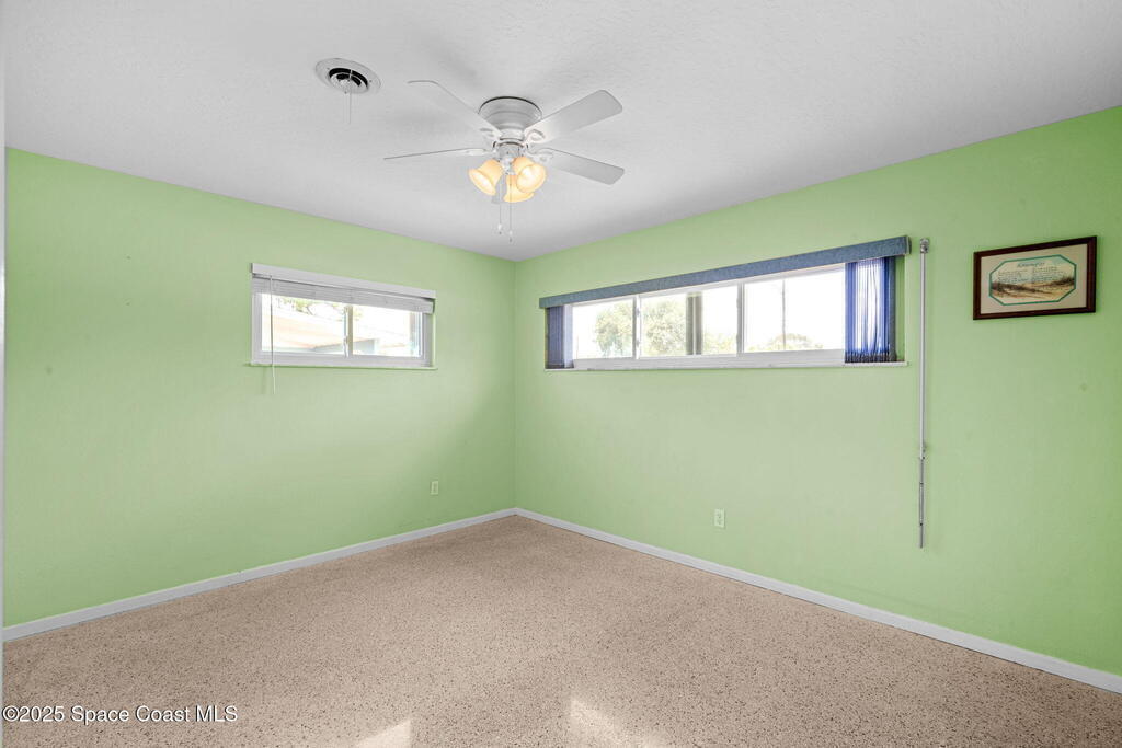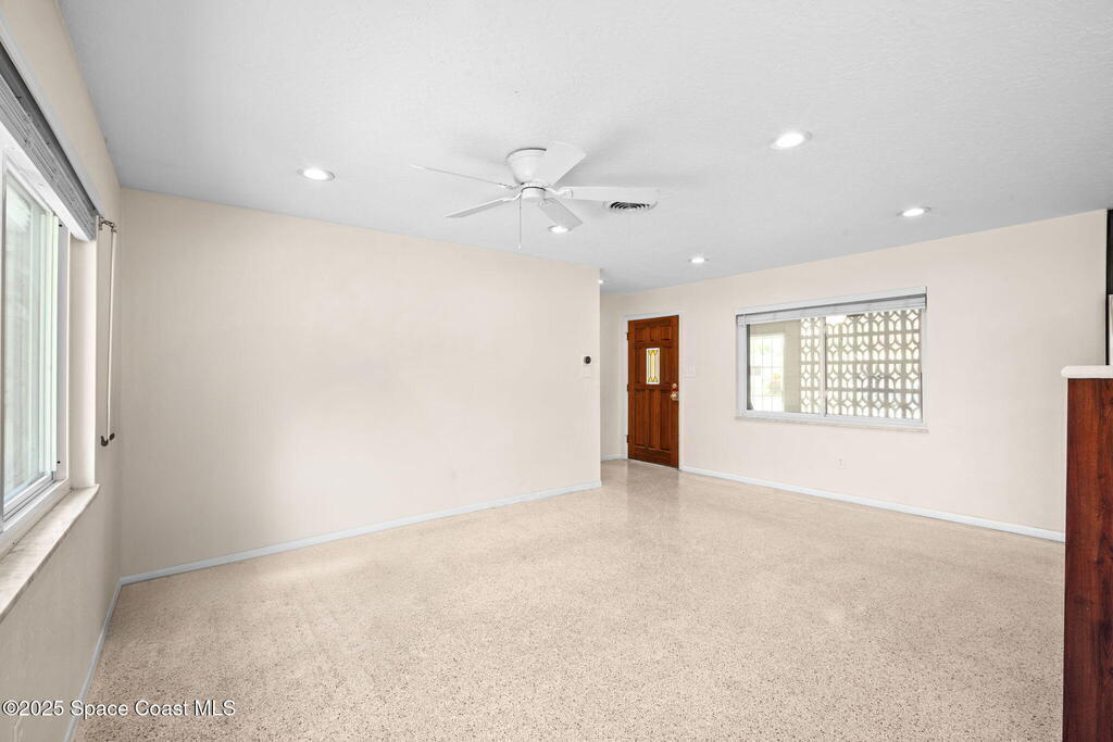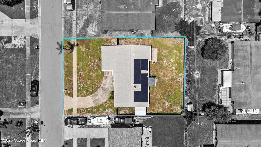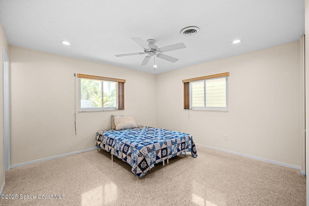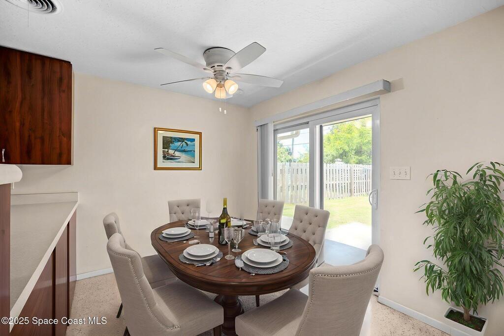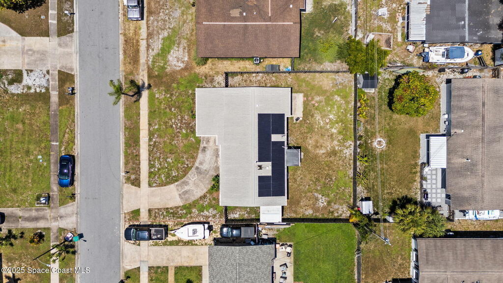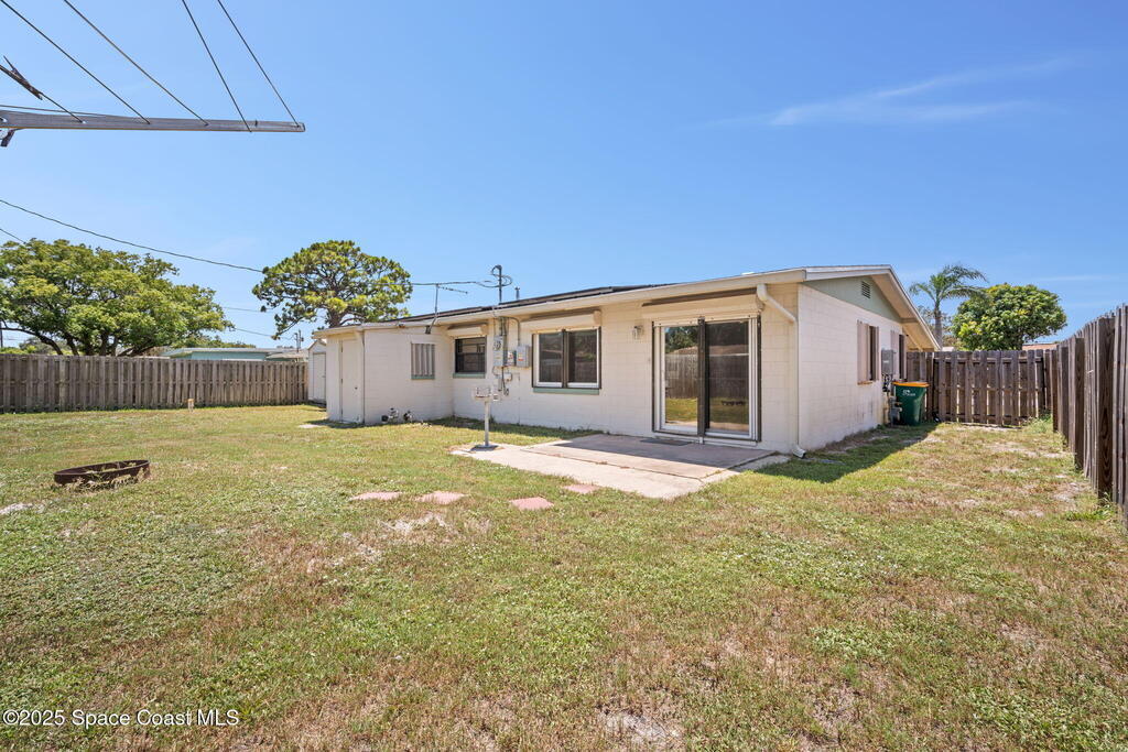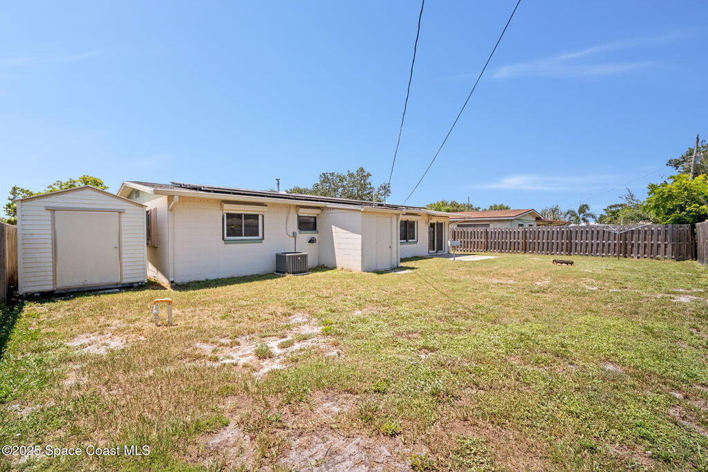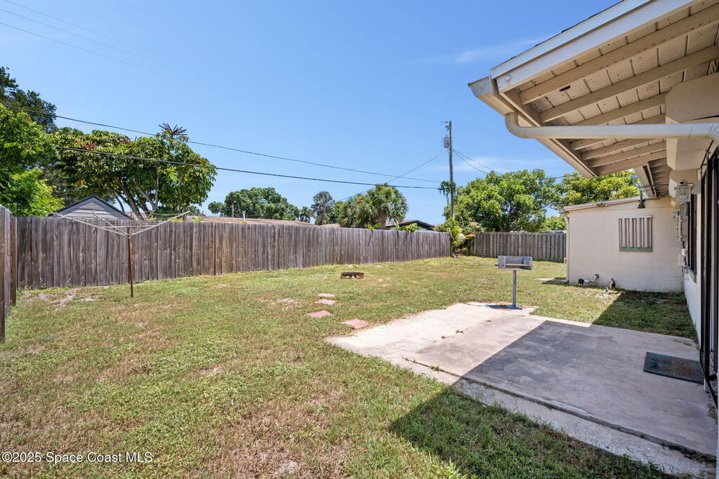 Welcome to this beautifully updated 4-bedroom, 2-bath home in the desirable Bel Aire subdivision of Merritt Island! Step inside to find pristine terrazzo floors and LED recessed lighting throughout. The kitchen shines with newer energy-efficient stainless steel appliances. Custom cabinetry in kitchen, laundry room, and bathrooms with soft close drawers and adjustable shelving. A smart thermostat adds modern convenience and energy savings. Both bathrooms have been tastefully renovated, and the indoor laundry offers added ease. Enjoy peace of mind with a 200-amp panel featuring a generator hookup, a mix of roll-down and accordion shutters, and solar panels to help offset utility costs. The spacious, fully fenced backyard offers a shed, a shallow well for irrigation, and plenty of room to add a pool. This move-in ready gem blends comfort, efficiency, and practicality--schedule your tour today! Roof - 2020, AC - 2022, Amp to 200 - 2016, Tankless WH - 2016, Windows - 2010, Solar - 2024