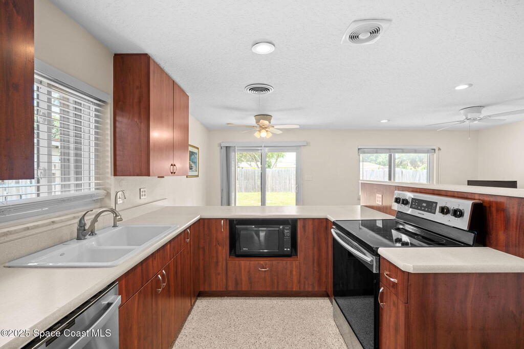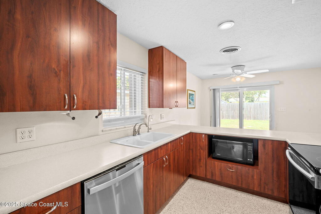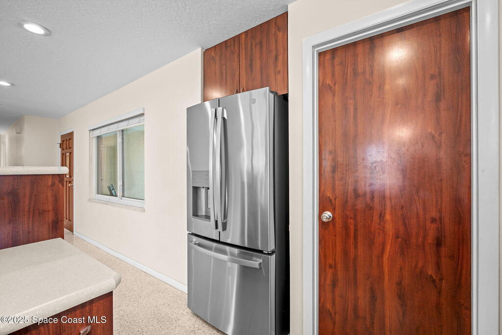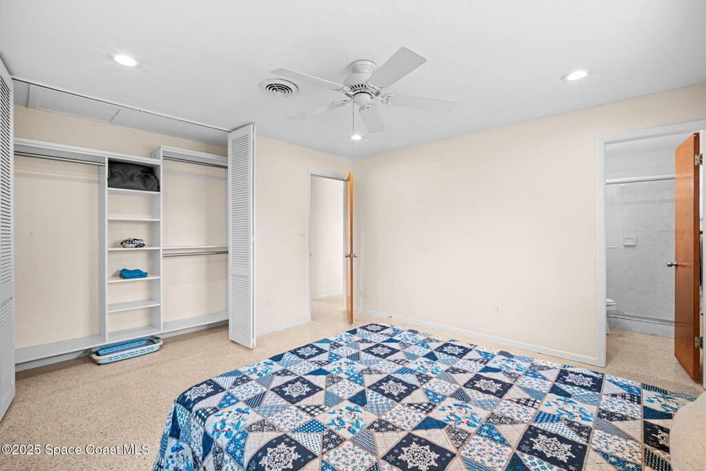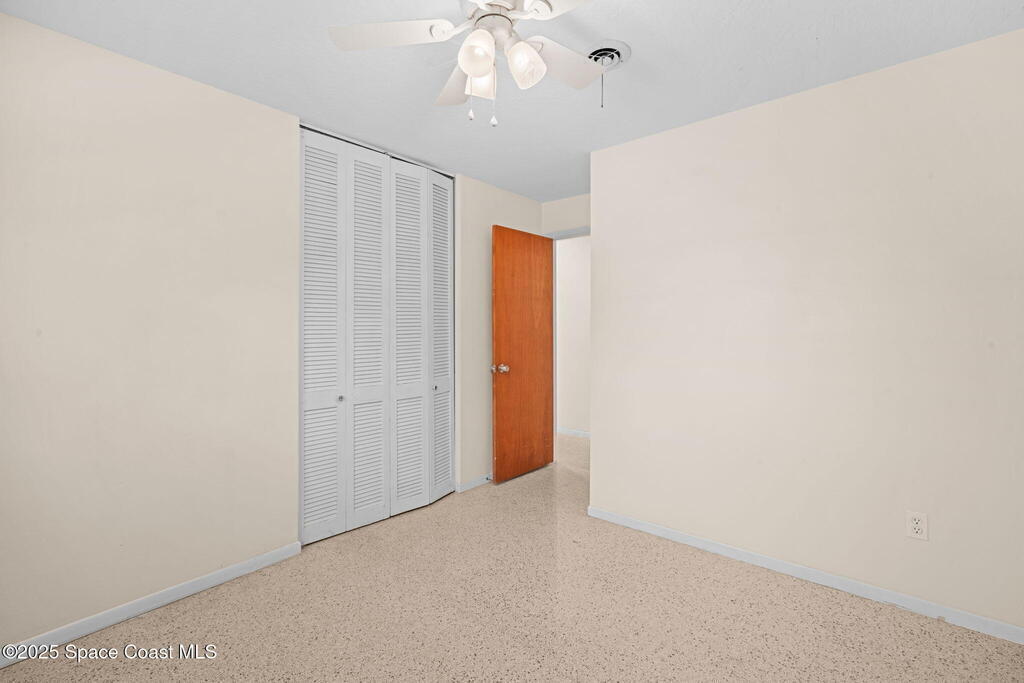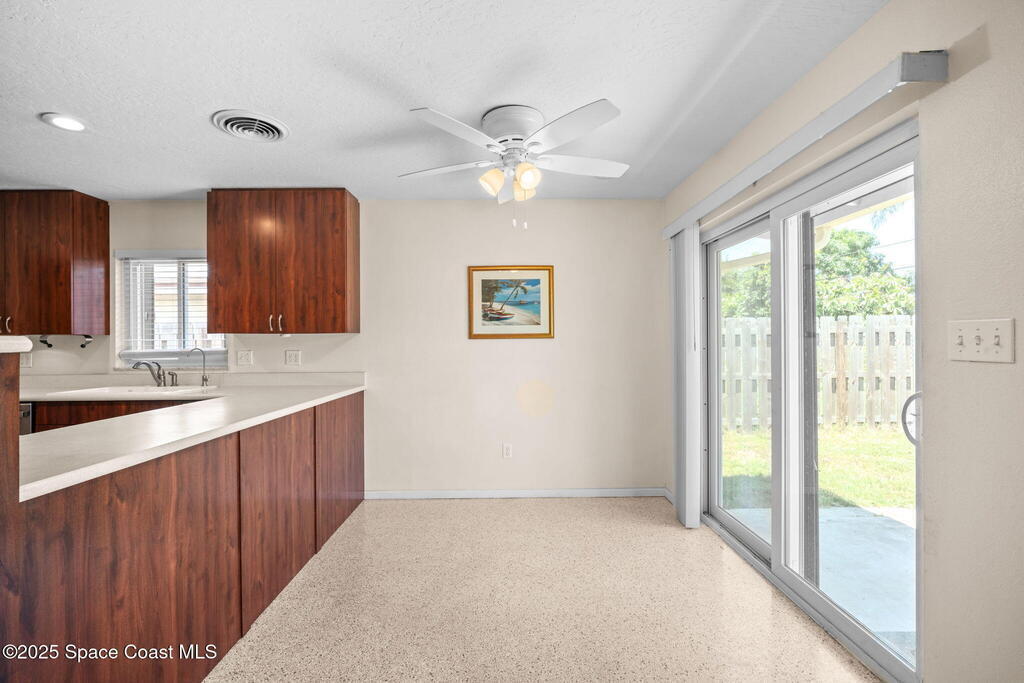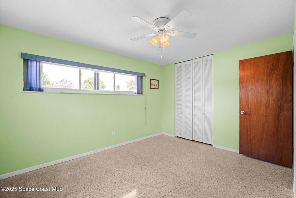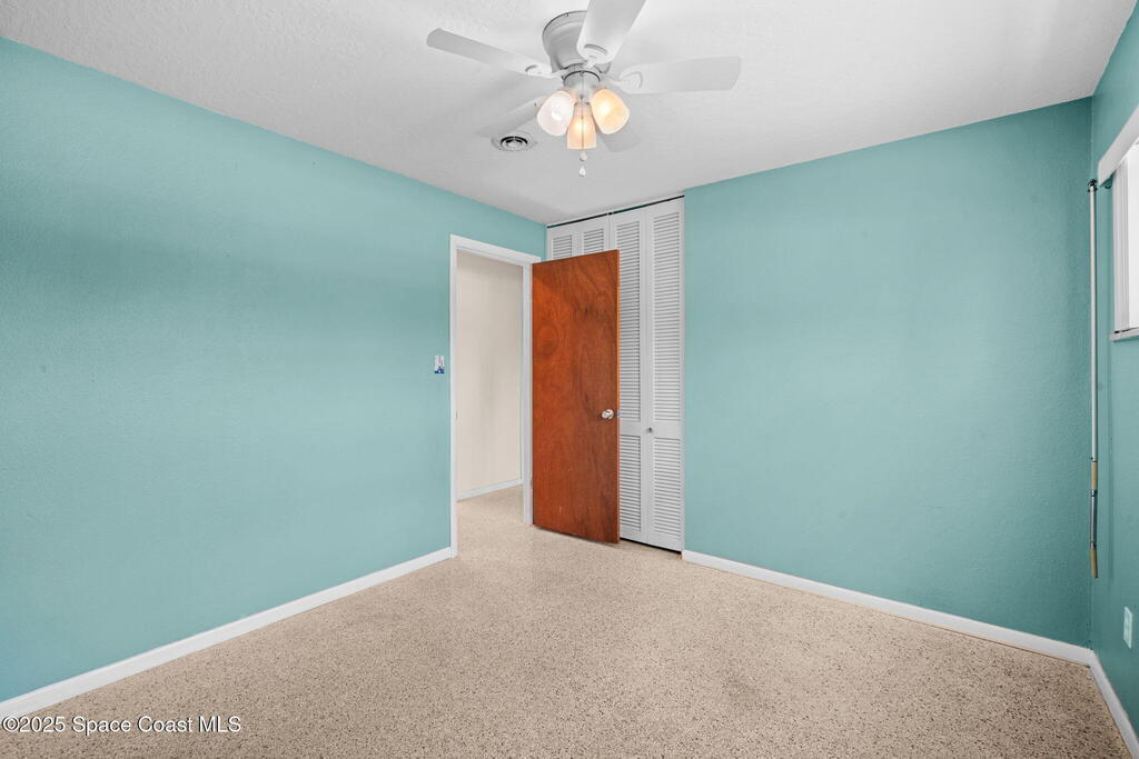 Welcome to this beautifully updated 4-bedroom, 2-bath home in the desirable Bel Aire subdivision of Merritt Island! Step inside to find pristine terrazzo floors and LED recessed lighting throughout. The kitchen shines with newer energy-efficient stainless steel appliances. Custom cabinetry in kitchen, laundry room, and bathrooms with soft close drawers and adjustable shelving. A smart thermostat adds modern convenience and energy savings. Both bathrooms have been tastefully renovated, and the indoor laundry offers added ease. Enjoy peace of mind with a 200-amp panel featuring a generator hookup, a mix of roll-down and accordion shutters, and solar panels to help offset utility costs. The spacious, fully fenced backyard offers a shed, a shallow well for irrigation, and plenty of room to add a pool. This move-in ready gem blends comfort, efficiency, and practicality--schedule your tour today! Roof - 2020, AC - 2022, Amp to 200 - 2016, Tankless WH - 2016, Windows - 2010, Solar - 2024