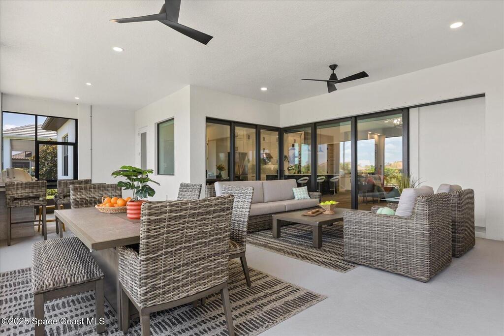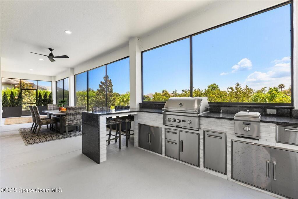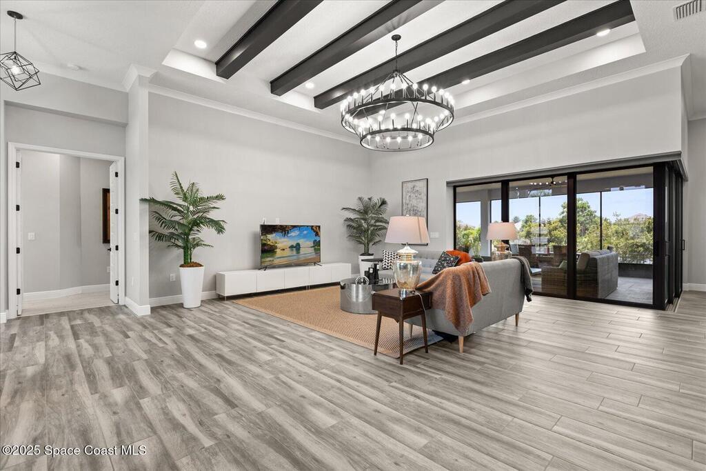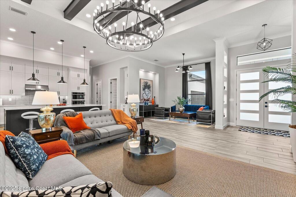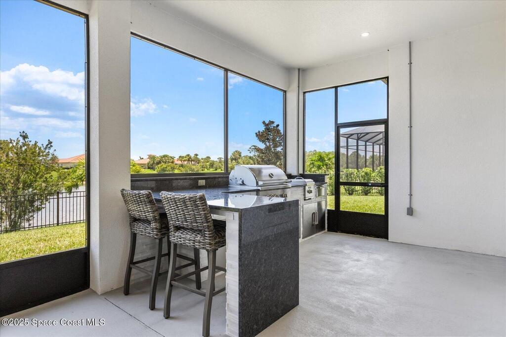 Live the Lake Washington lifestyle in this one-of-a-kind Lifestyle-built beauty. Tucked inside an exclusive gated Enclave Community is the perfect blend of Florida luxury and laid-back comfort. From the moment you step through the double doors, you'll be wowed by the soaring 12-foot ceilings, exposed faux wood beams, and open, airy layout that draws you straight to the lakefront views. The heart of the home is the expansive great room with a wall of disappearing sliders that make the corner of the house feel like it melts into the outdoors. Step onto the oversized screened patio with a full Summer Kitchen--ideal for relaxing evenings or hosting game-day cookouts with a lake breeze. The kitchen? A dream. Designed for both function and beauty, it features a massive quartz island, custom cabinetry, and a walk-in pantry with built-in organizers to keep life running smoothly. Thoughtful architectural details, elegant finishes, and a true indoor-outdoor flow make this home perfect!