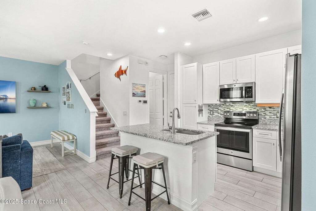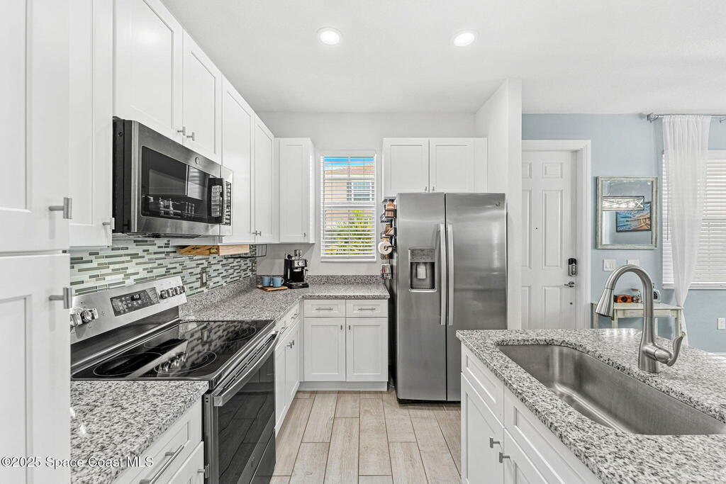 Nearly NEW Beautiful Coastal Design Townhome nestled in the gated enclave, Riverwalk of Melbourne. This perfect 3 bed 2 & 1/2 bath floorplan w/a 2 car garage boasts tranquil neutral colors throughout, upgraded wood look tile and luxury carpet. Open concept floorplan surrounded by windows allows natural light to fill the rooms. Feel right at home preparing meals in this gorgeous well designed kitchen-upgraded white cabinetry, granite counters and GE Profile appliances. Built in 2022 and equipped with the latest energy efficient construction, modern smart home technology, and insulated Impact windows & doors. Additional features/upgrades include tile roof, paver driveway, 8' doors, epoxy painted garage floors, and screened covered front porch to name a few. The community offers resort style amenities-pool, spa, fitness center & clubhouse! Just a short drive to our beautiful beaches, thriving EGAD & downtown Melbourne for shopping and restaurants and all that the Space Coast has to offer!