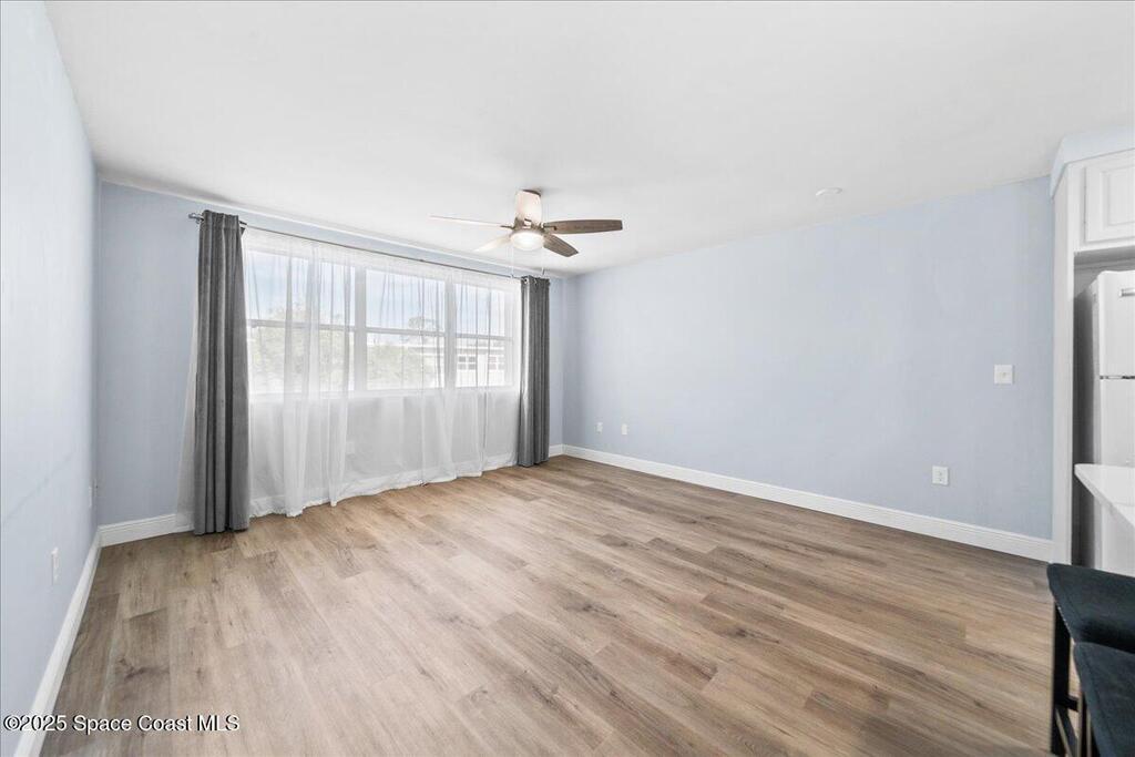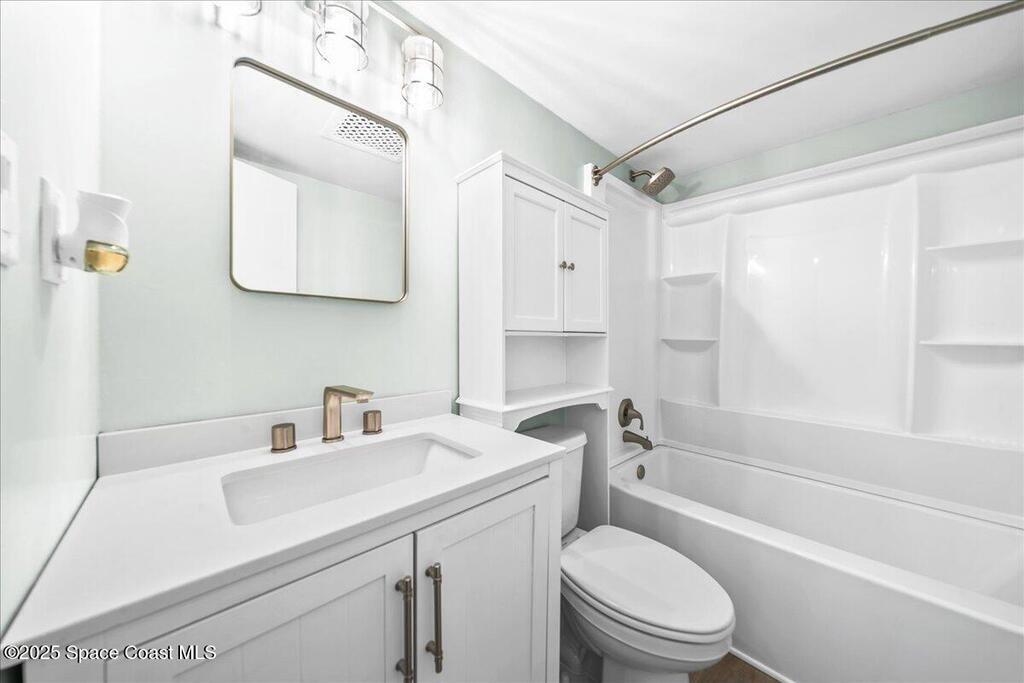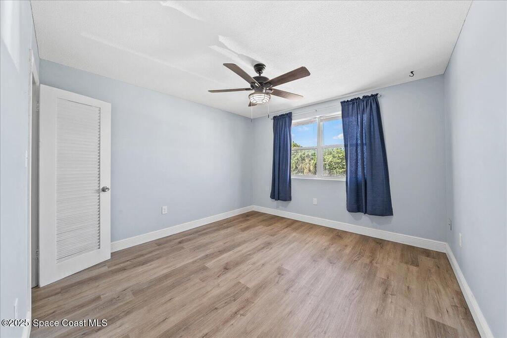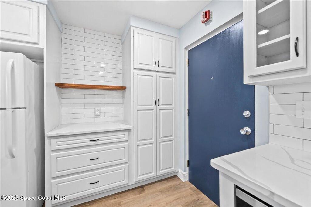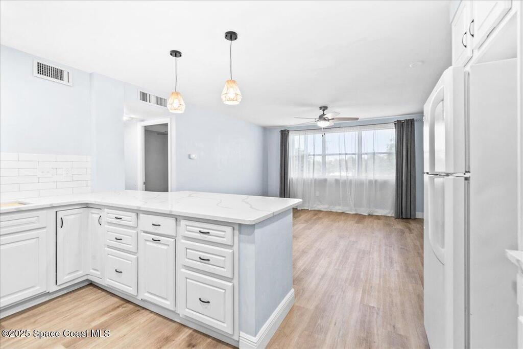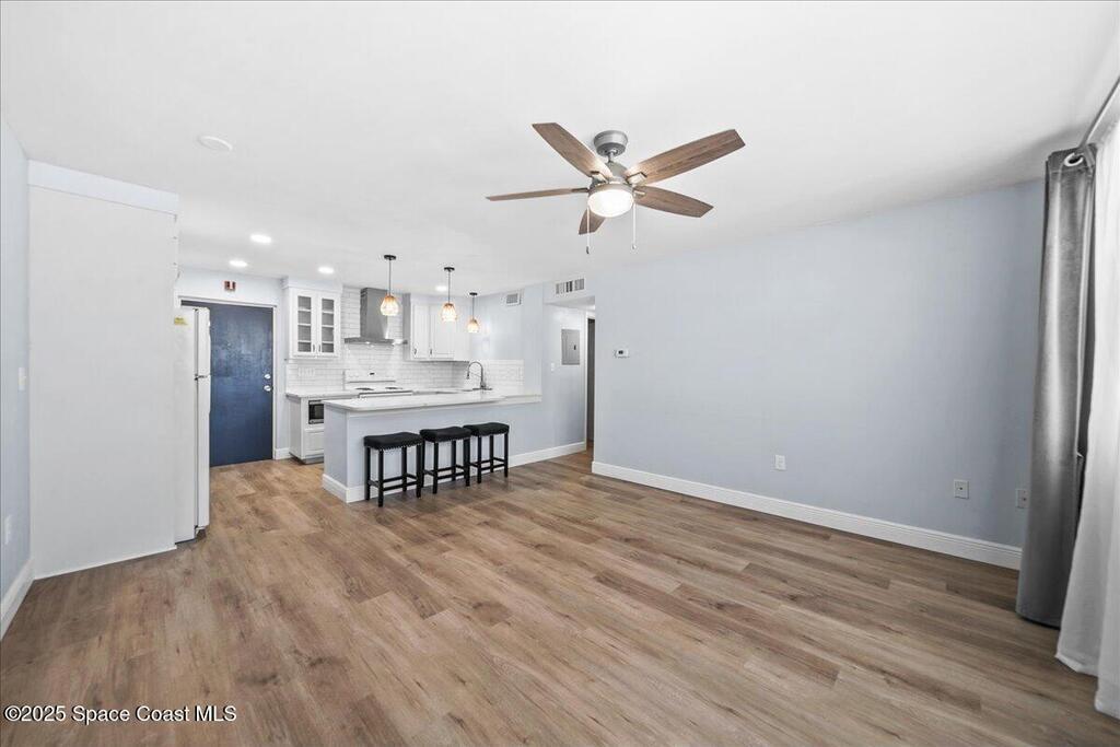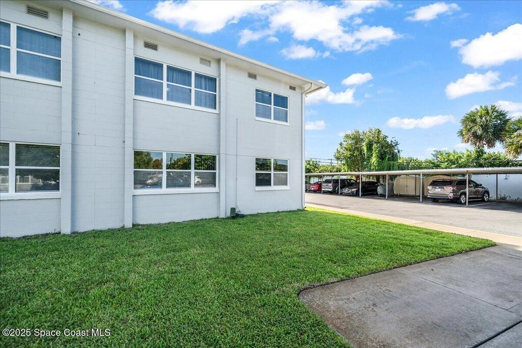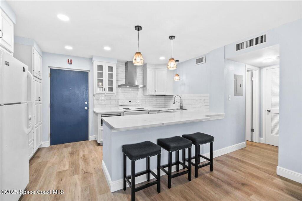 Beautifully remodeled condo just minutes from the beach and major highways! Featuring waterproof luxury vinyl plank flooring and 6'' baseboards throughout, this home blends style and function. The kitchen and bath were professionally renovated in 2022 with all-wood cabinets, quartz countertops, breakfast bar, pull-out pantry, coffee bar, and more. Appliances include a GE 3-in-1 microwave (air fryer/convection/broiler), the Z-Line 500 CFM range hood with turbo setting. Stove, HVAC and a refrigerator are maintained by the condo association. Hug walk in custom closet. The 30-gallon water heater (2022) is programmable and includes an expansion tank. Thoughtfully upgraded with 12'' drawers, lazy Susan, pull-out trash bin, and hanging pot cabinet. This move-in ready unit offers low-maintenance living and is close to beaches, shopping, dining, and all the Space Coast has to offer! Cash only. Buyer must submit Co-Op application, credit check and board approval.