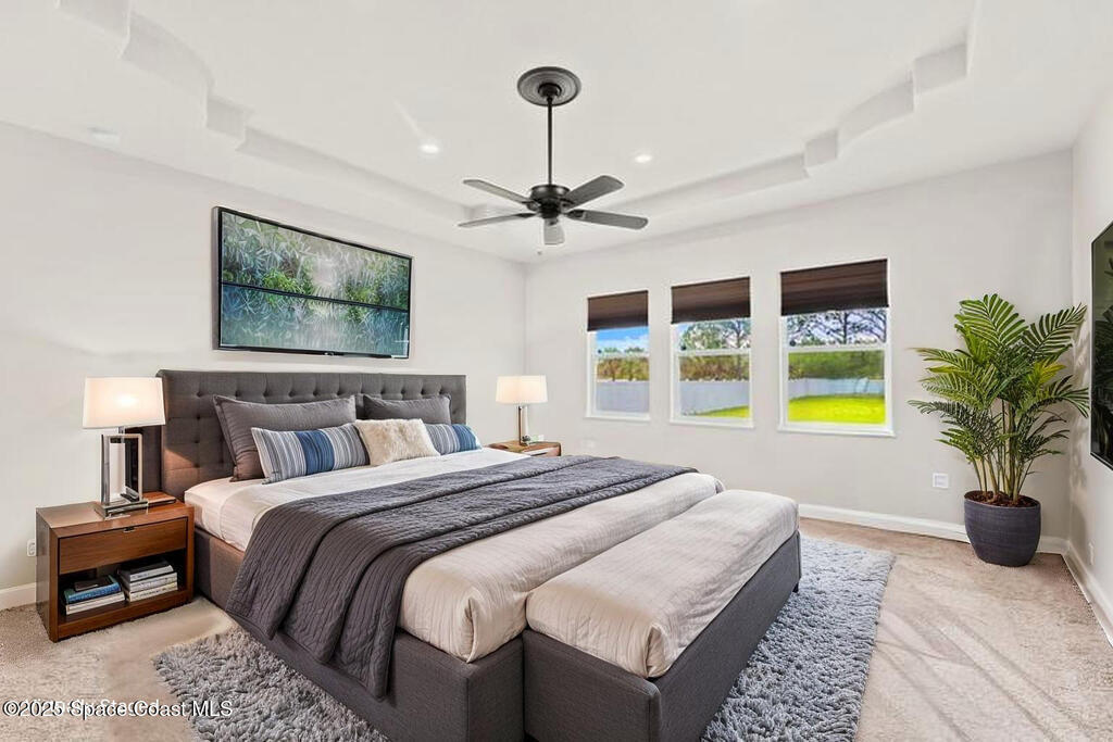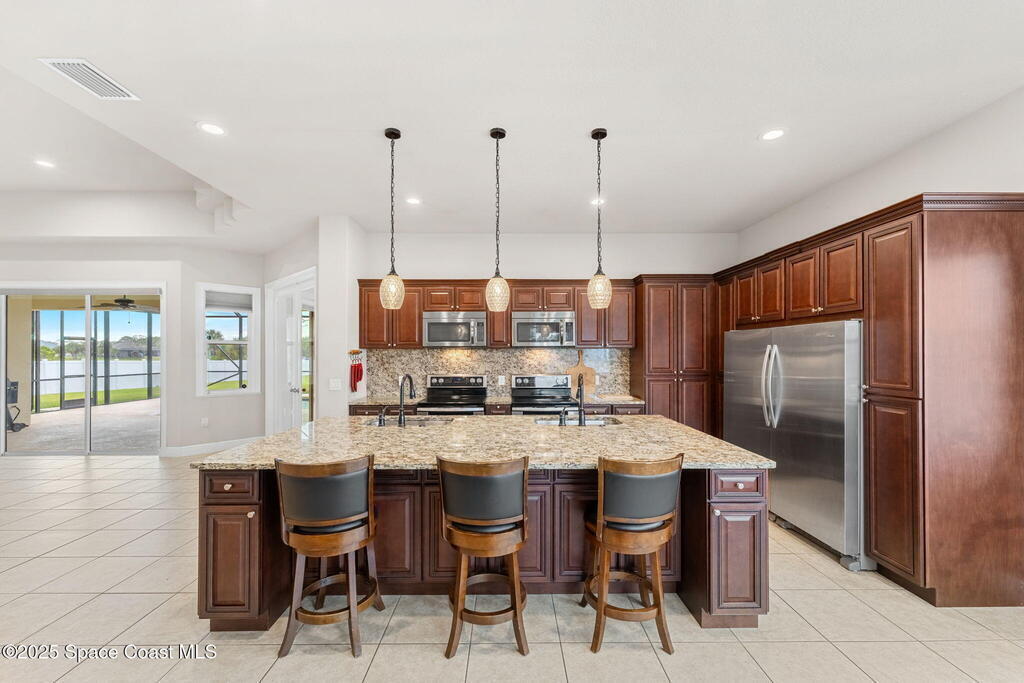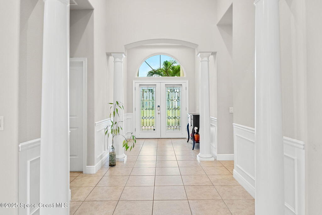 Stunning newer construction 4BR/4BA pool home in gated Woodshire Preserve! Set on a 0.68-acre lot, this 3,193 sq ft home impresses with soaring 12'-14' ceilings, an open split-bedroom layout, and custom saltwater pool featuring beach (zero) entry and decorative fountain. The gourmet ''Kosher'' kitchen includes a butler's pantry with prep sink, perfect for entertaining. The spacious primary suite offers a luxurious ensuite with soaking tub, walk-in shower, and dual vanities. Generous secondary bedrooms, oversized laundry room with utility sink, and tile flooring throughout main areas adds comfort and functionality. A/C has 8 years remaining on 10-year warranty. Located near top-rated Brevard County schools and just minutes from shopping, dining, golf, and medical in the heart of Viera. This home blends space, elegance and convenience--inside and out.