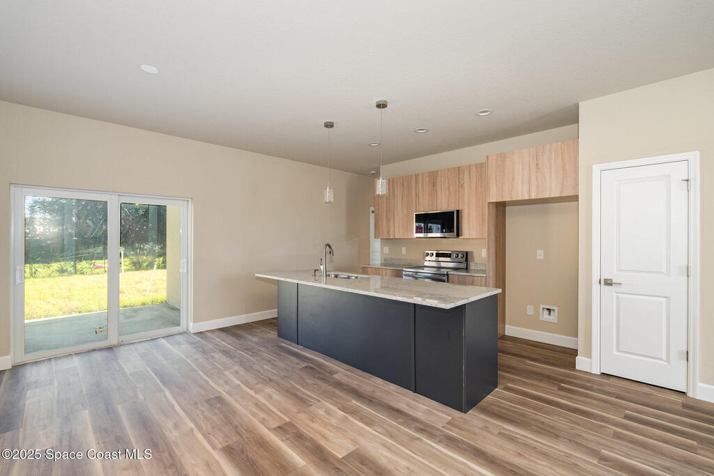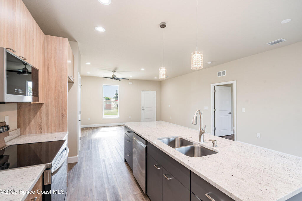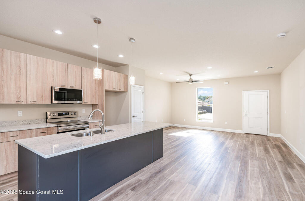 Welcome to this stunning semi custom 4 bedroom 2 full bathroom, NEW construction home. This beautiful concrete block home with warm subtle tones is nestled on .24 of an acre. Spacious open floor plan, expansive 9'4'' high interior ceilings, vinyl plank flooring for easy care and maintenance. Granite countertops, breakfast bar and 42'' upper cabinets for additional storage space and stainless steel appliances make entertaining a breeze. The primary bathroom with granite countertops and dual sinks, over-sized walk-in shower with glass enclosure, free standing soaker tub and elegant designer tile complete this stunning look. Large primary bedroom features His and Her closets. The energy efficient 38'' x 78'' impact windows allow for a light and open feel. Ceiling fans, Indoor laundry room, 2 car garage with insulated garage door and opener and 25 year shingle roof.