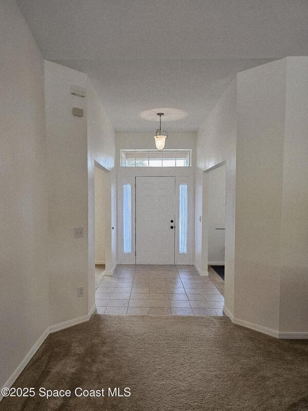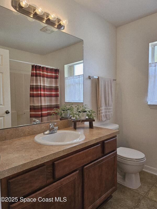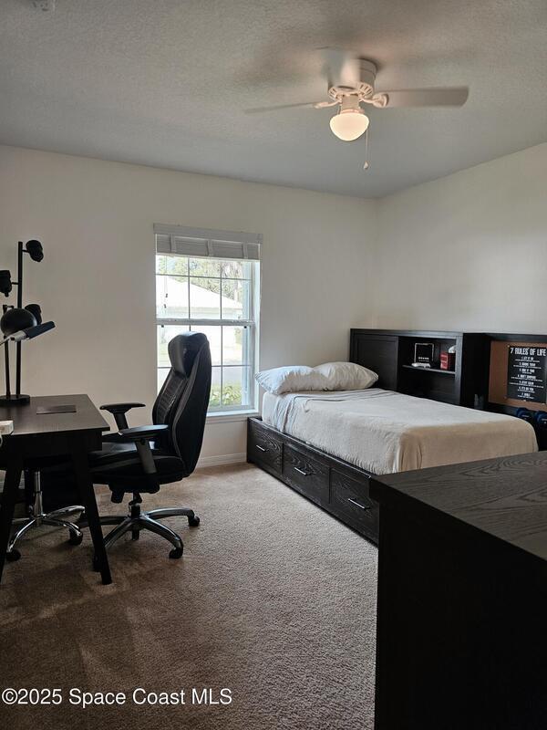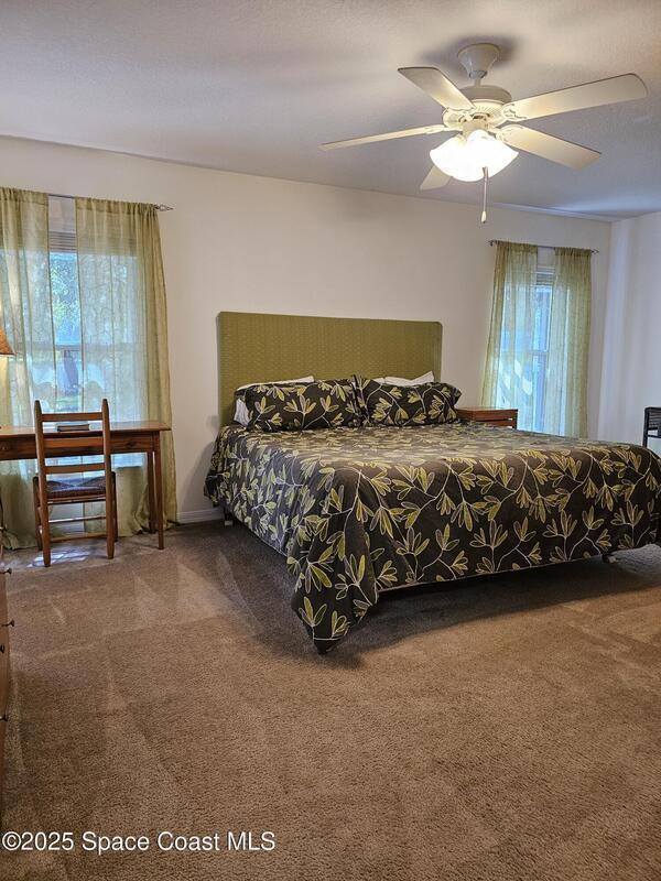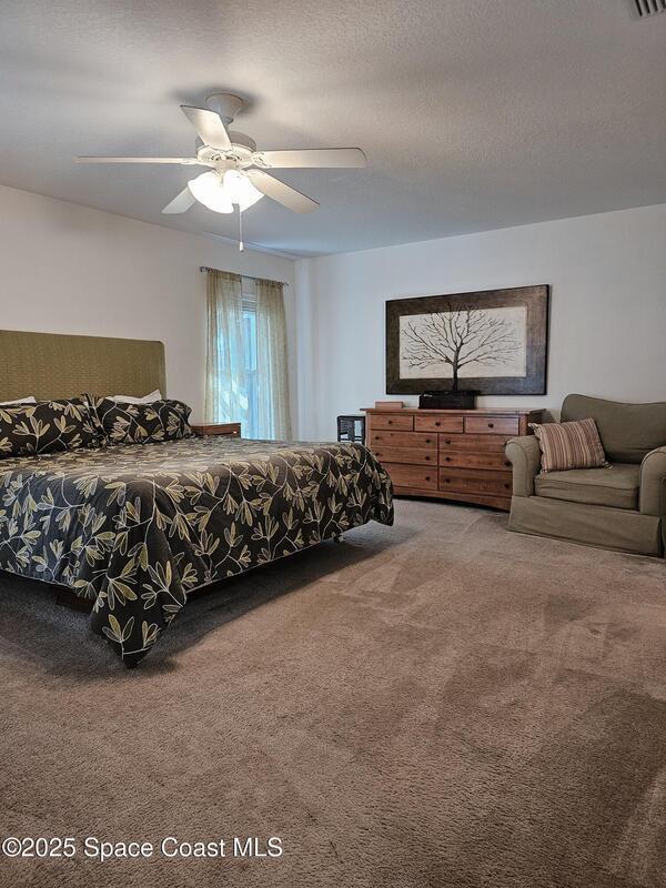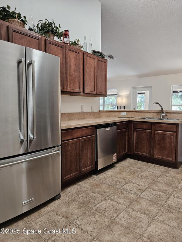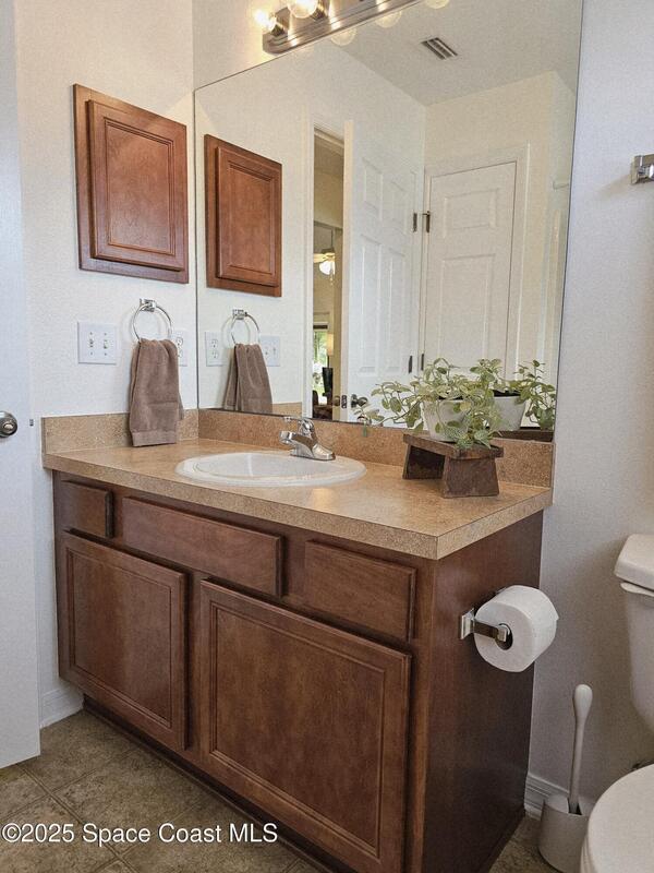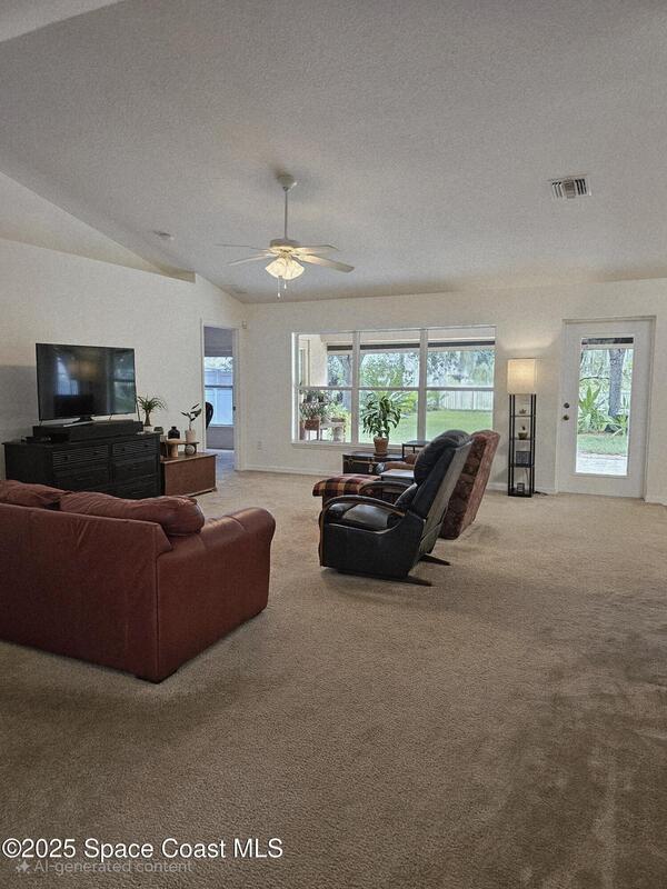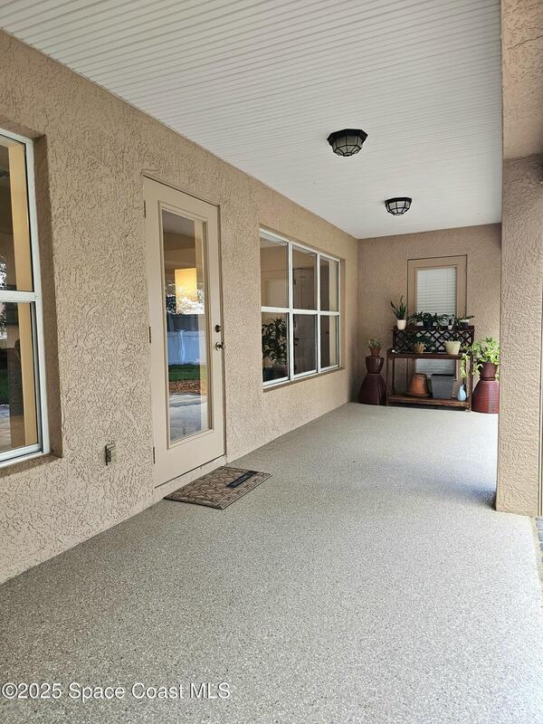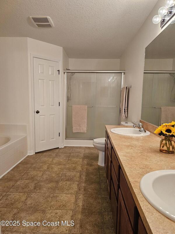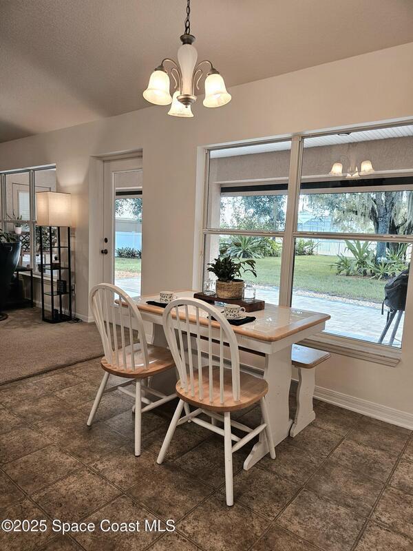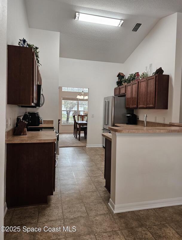 Oversized lot with amazing view of the pond and next to preserve area for additional privacy. Fenced backyard is a tropical paradise with large oaks for shade & mango tree. Community is tucked away at end of road but close to all that West Melbourne has to offer. Very well-maintained home offers large family room open to the kitchen & breakfast nook. Vaulted ceilings in main area. Front flex/den & formal dining room add more flexibility. Split bedroom plan with four bedrooms & two bathrooms. Primary suite has door to the lanai area, two walk-in closets, double sinks, soaking tub & separate shower. Back guest bedroom has door to lanai area & makes a great space for office or sunroom. Fresh interior paint throughout, brand new dishwasher & refrigerator. Accordion hurricane shutters & pulled down screens on lanai add peace of mind. Roof 2023, A/C 2023, HWH 2020