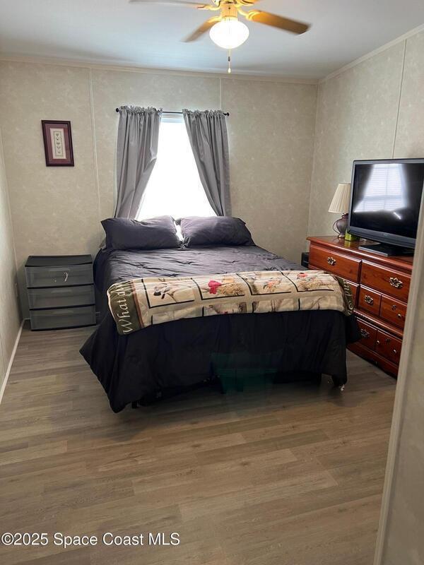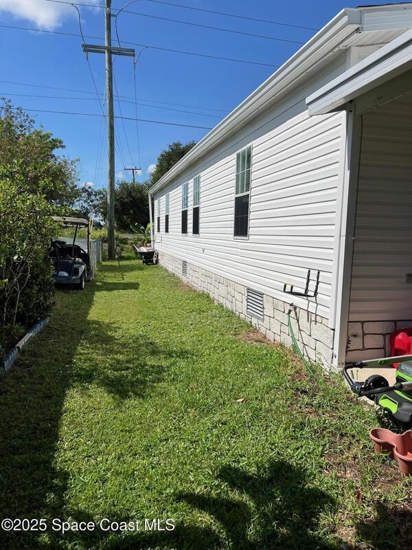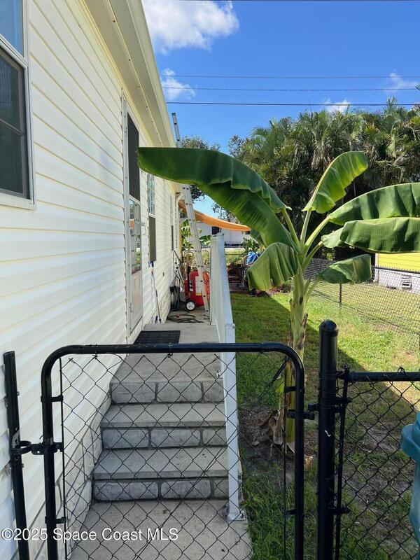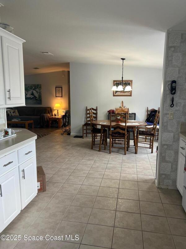 This large 3-bedroom 2-bathroom home features a double carport and driveway. Enter through the climate controlled 4 seasons room into the breakfast nook and kitchen. The split floor plan provides space for family living. Open kitchen, dining room and living room. Vaulted ceilings. Tile and laminate flooring through-out. Owners' suite features 2 walk in closets, double sinks vanity, and a step-in shower. 2 X 6 construction. Partial fenced in yard for furry friends. Workshop equipped with electricity and whole home generator hook-up. Washer/dryer in unit. New metal roof installed August 2025. WH is 5 years old. Barefoot Bay is a vibrant golf-cart friendly community that feels like a cross between a small town and a year-round resort. Golf course, 3 pools, fishing pier, private beach access and much more. There is something for everyone or relax in your 4 seasons room and watch the sunset. You own the land.