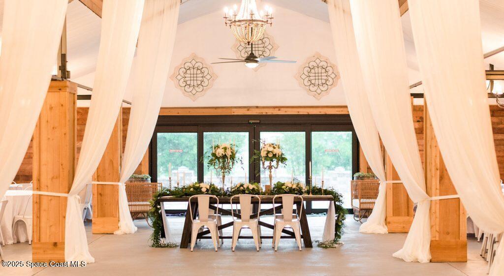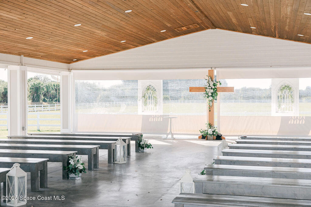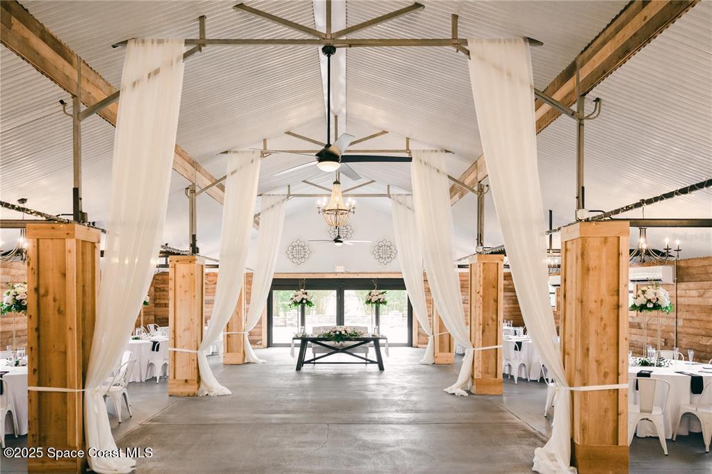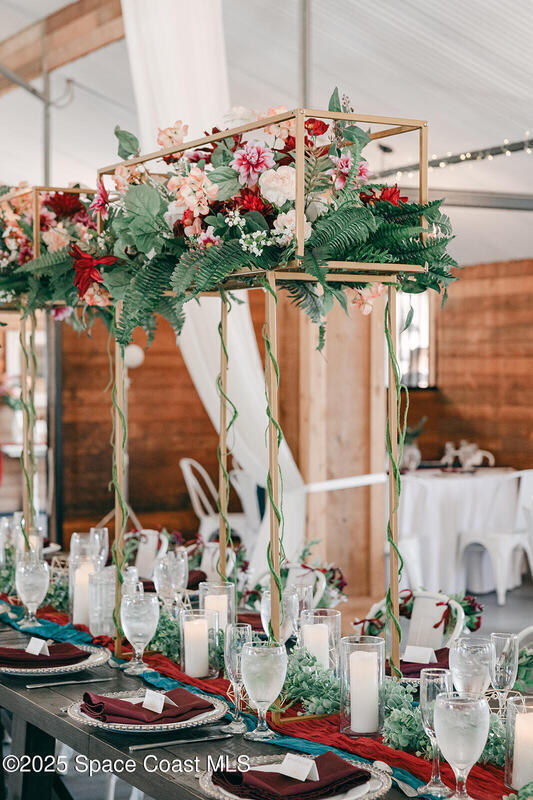 Discover the ultimate lifestyle property in Palm Bay--two adjoining parcels offered together for a combined 11+/- acres of opportunity. This rare combination of a turnkey event venue and a stunning single-family home creates the perfect work-life balance. The 4-bedroom, 3-bath, 2,793 sq ft residence features an open-concept split floor plan with soaring ceilings and two master suites. At its heart is a gourmet kitchen with custom cabinetry, abundant storage, and quality finishes. Additional highlights include two guest bedrooms, an office/den, and a screened, heated pool and spa for year-round enjoyment. Next door is where happily-ever-afters begin--your turnkey wedding and event venue, brimming with potential. This fully operational business boasts confirmed bookings through 2027 and a beautifully renovated 5,000+ sq ft barn with Bride & Groom suites, office, pavilion, terrace, and both developed and cleared acreage for expansion.