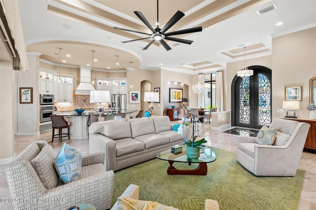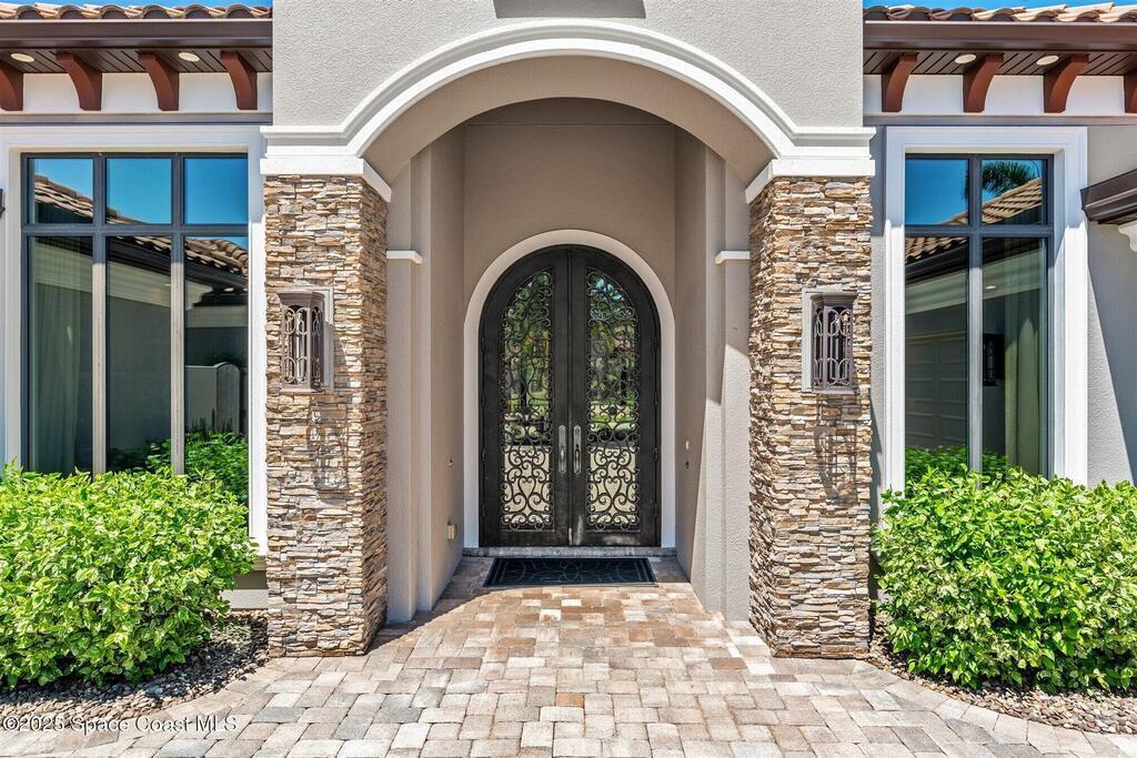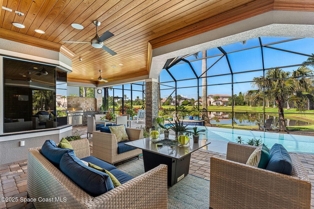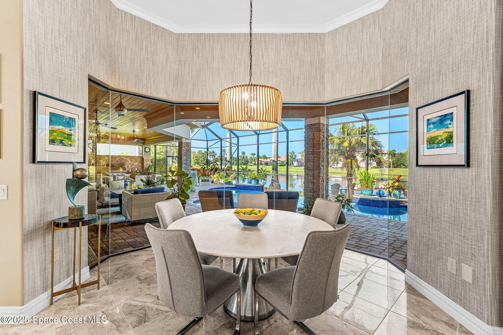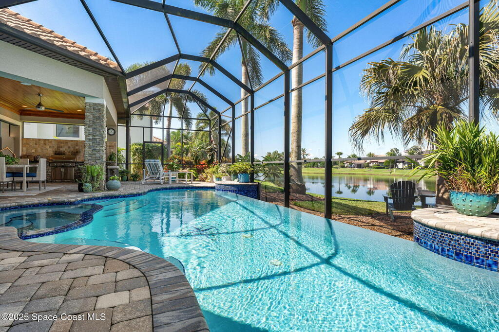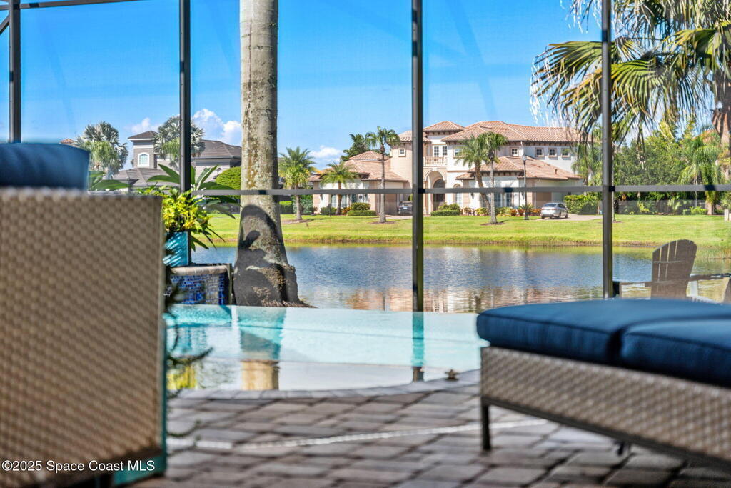 72-Hour Kick Out Clause in Affect.Welcome to the epitome of luxury living in the exclusive, gated Wyndham at Duran. This custom home by Brevard's renowned builder offers quiet luxury and an exceptional lifestyle set on a rare half-acre estate of 2 lots (with plenty of available land to build a casita, additional garage, or expand your home) within the sought-after Duran Golf Course community. The great room floor plan features four bedrooms, a private office, dining room, and pool bath on a picturesque waterfront cul-de-sac lot. The impressive curb appeal is enhanced by an expansive motor court and stately 10' Abbey iron double doors. Inside, the spacious great room has breathtaking quad sliders that reveal panoramic views of the infinity-edge pool, tranquil lake, golf course, and unforgettable sunsets. The home is filled with bespoke touches: designer window treatments, lighting, and fans; luxury wallpaper and...