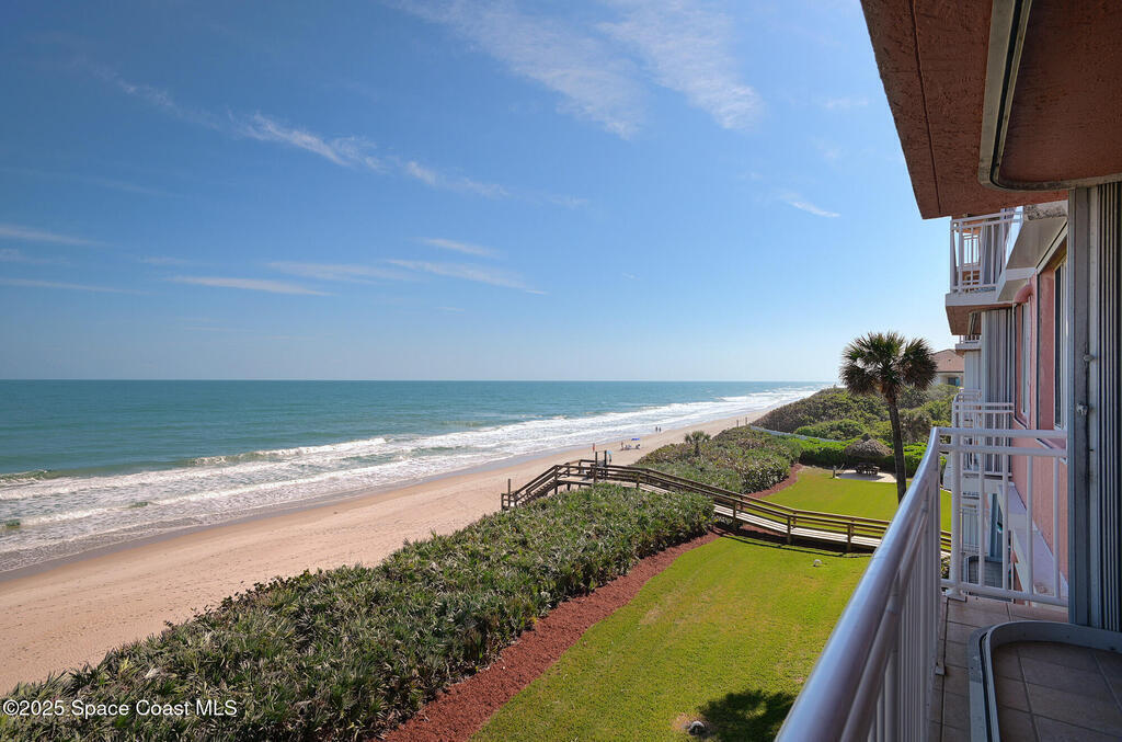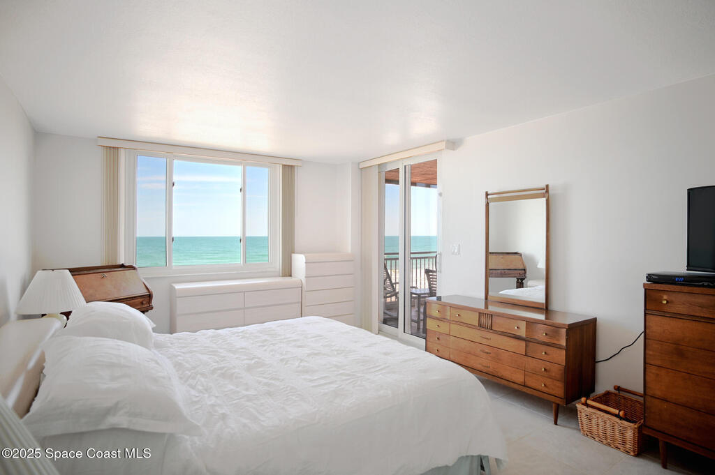 Stunning one level, 4th floor DIRECT oceanfront condo has the best views of rocket launches and sea turtles nesting and hatching right from your balcony. Spacious condo has tile floors throughout and is the perfect height to view both the sunrise over the ocean and the sunset over the Indian River. In addition to three bedrooms and 3 full baths there is a bonus space that is perfect for workout spot, overflow guests, or office. Recently replaced AC/Heating inside and out. RARE TO FIND!!!! TWO CAR GARAGE indoor parking spaces along with 2 storage closets. Building freshly painted. Love the great room and huge balcony overlooking the ocean, sand and occasional beach stroller. Breakfast nook has amazing views of sunsets. Hurricane shutters for added peace of mind. Community offers two elevators, secure lobby, huge heated pool and hot tub, Tiki Hut, full time maintenance manager and assistant, workout room and endless expansive beach that is perfect for long walks.