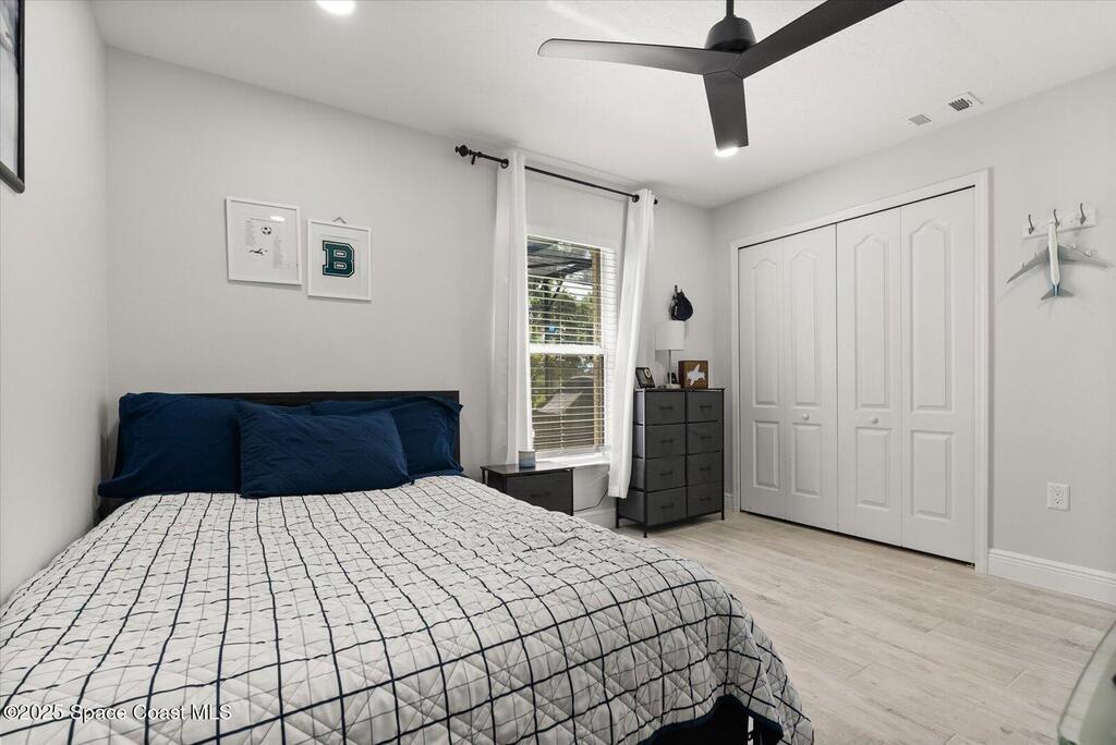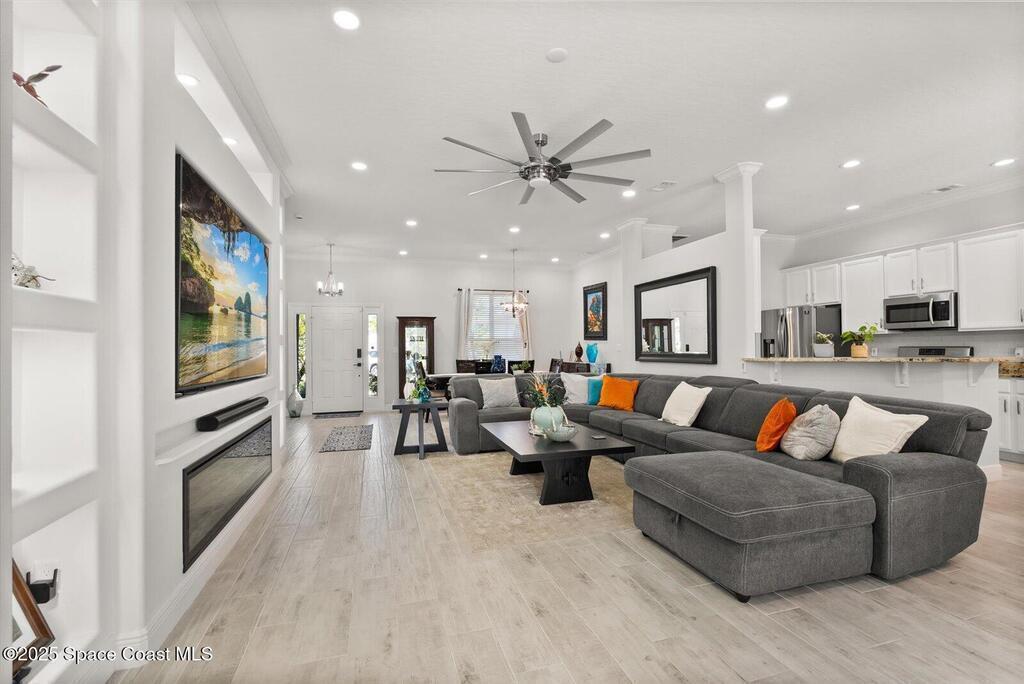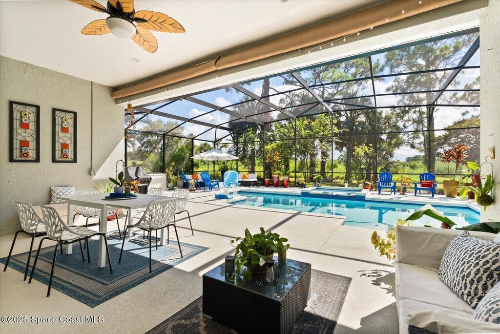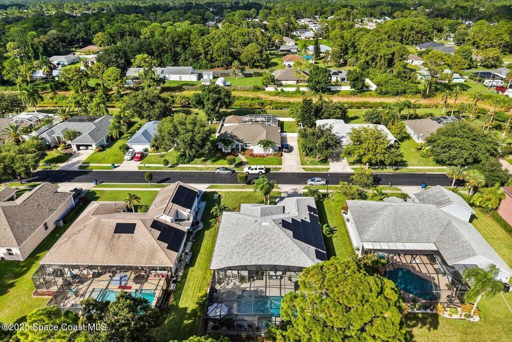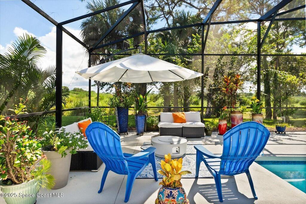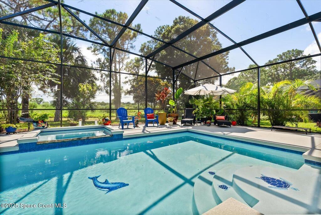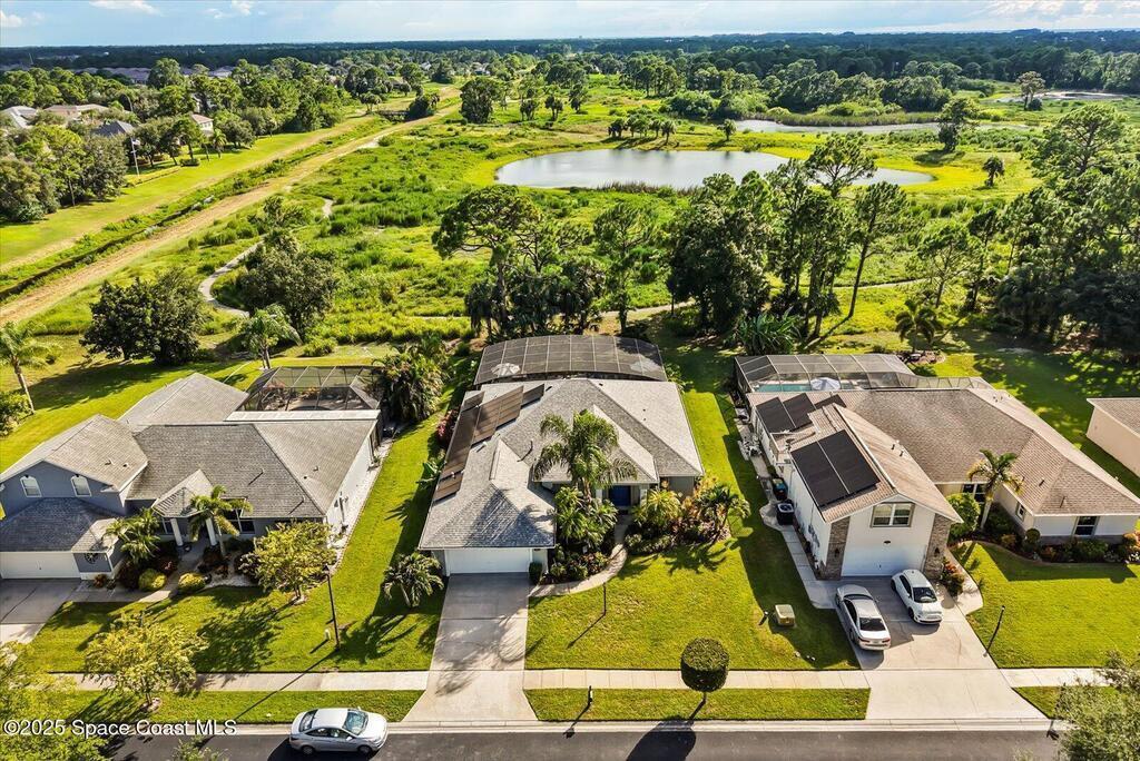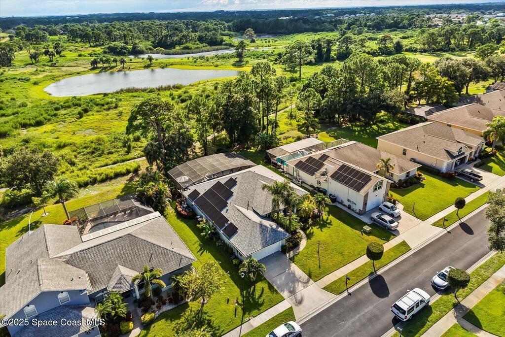 Experience the best of Florida living in this beautifully upgraded pool home on a tranquil 0.26-acre lot in the gated Summerfield neighborhood of Bayside Lakes. With no rear neighbors, enjoy serene views from your private backyard oasis, featuring a new saltwater pool, spa, and expansive screened lanai (2024), plus a covered patio perfect for morning coffee or sunset swims. Inside, modern updates shine with a remodeled kitchen (2020), new ceramic tile floors (2025), fresh paint, updated lighting, and a built-in entertainment center with electric fireplace (2025). The split floor plan includes a spacious primary suite with two walk-in closets, a spa-like bath (2025), and every bedroom features custom built-in closets for smart storage. A new roof (2022), solar panels (2024), AC (2023), shutters, and Ring security add peace of mind. Zoned for top-rated schools and close to beaches, shopping, and major aerospace employers, this home blends style, function, and location.