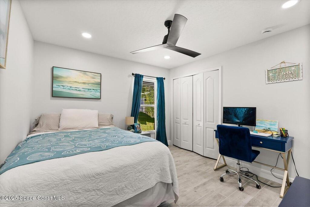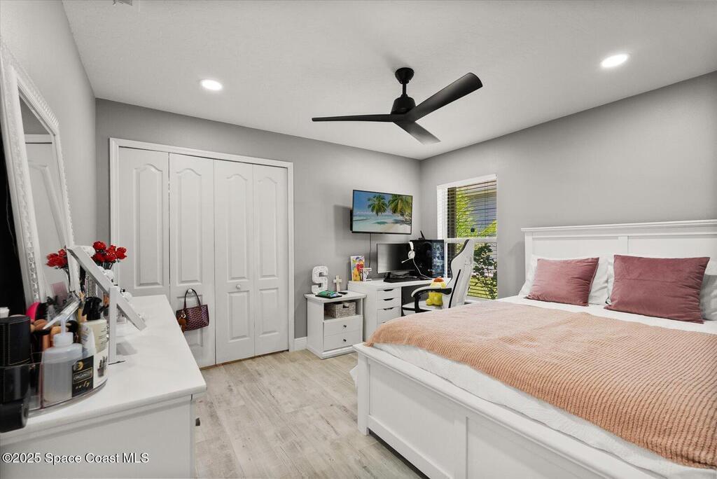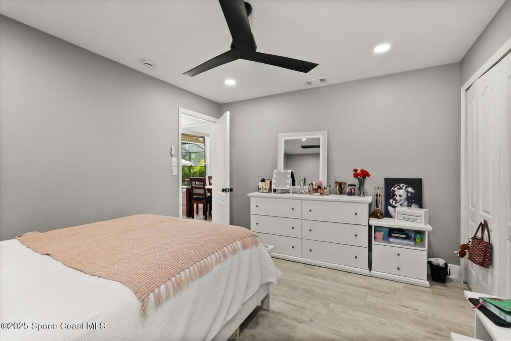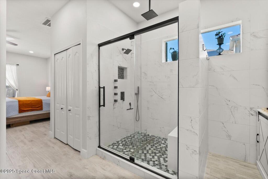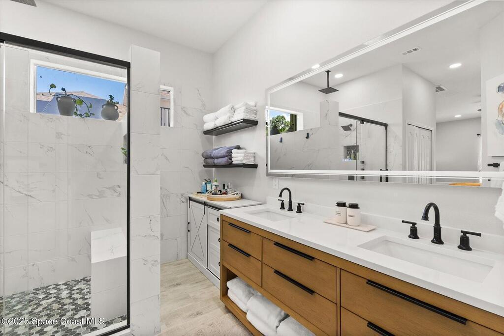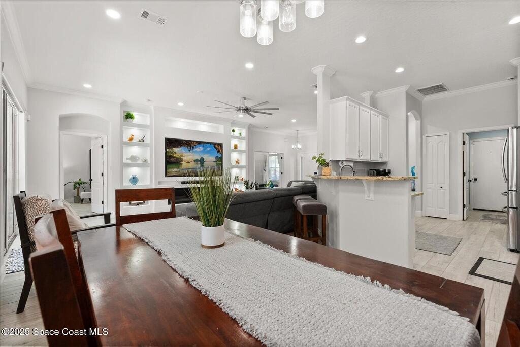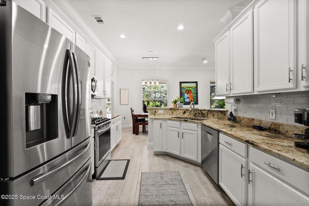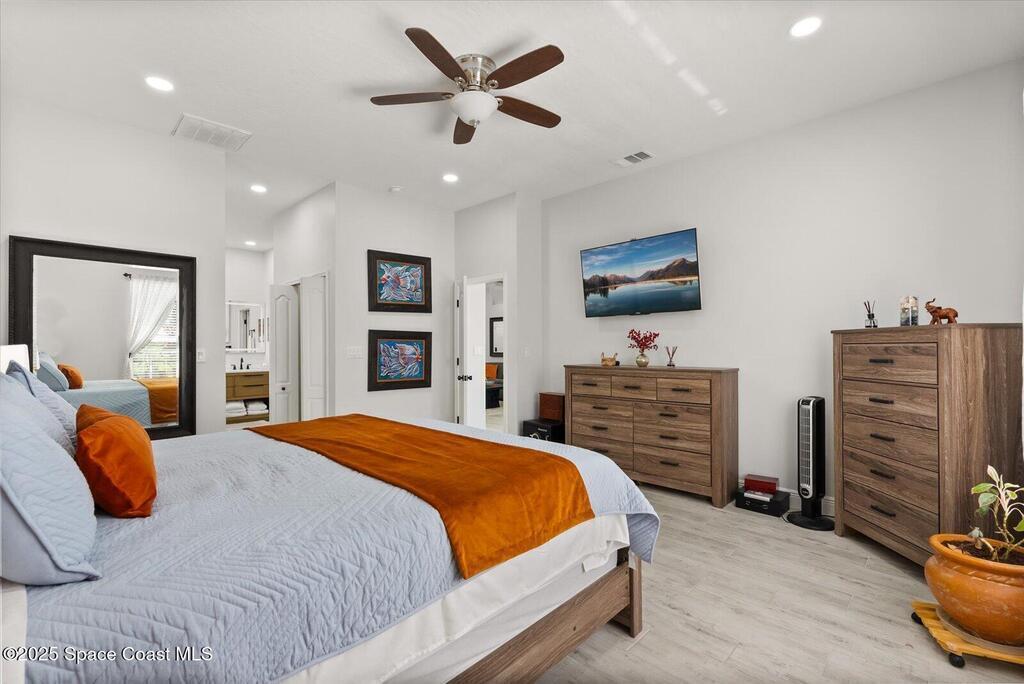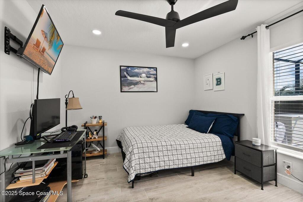 Experience the best of Florida living in this beautifully upgraded pool home on a tranquil 0.26-acre lot in the gated Summerfield neighborhood of Bayside Lakes. With no rear neighbors, enjoy serene views from your private backyard oasis, featuring a new saltwater pool, spa, and expansive screened lanai (2024), plus a covered patio perfect for morning coffee or sunset swims. Inside, modern updates shine with a remodeled kitchen (2020), new ceramic tile floors (2025), fresh paint, updated lighting, and a built-in entertainment center with electric fireplace (2025). The split floor plan includes a spacious primary suite with two walk-in closets, a spa-like bath (2025), and every bedroom features custom built-in closets for smart storage. A new roof (2022), solar panels (2024), AC (2023), shutters, and Ring security add peace of mind. Zoned for top-rated schools and close to beaches, shopping, and major aerospace employers, this home blends style, function, and location.