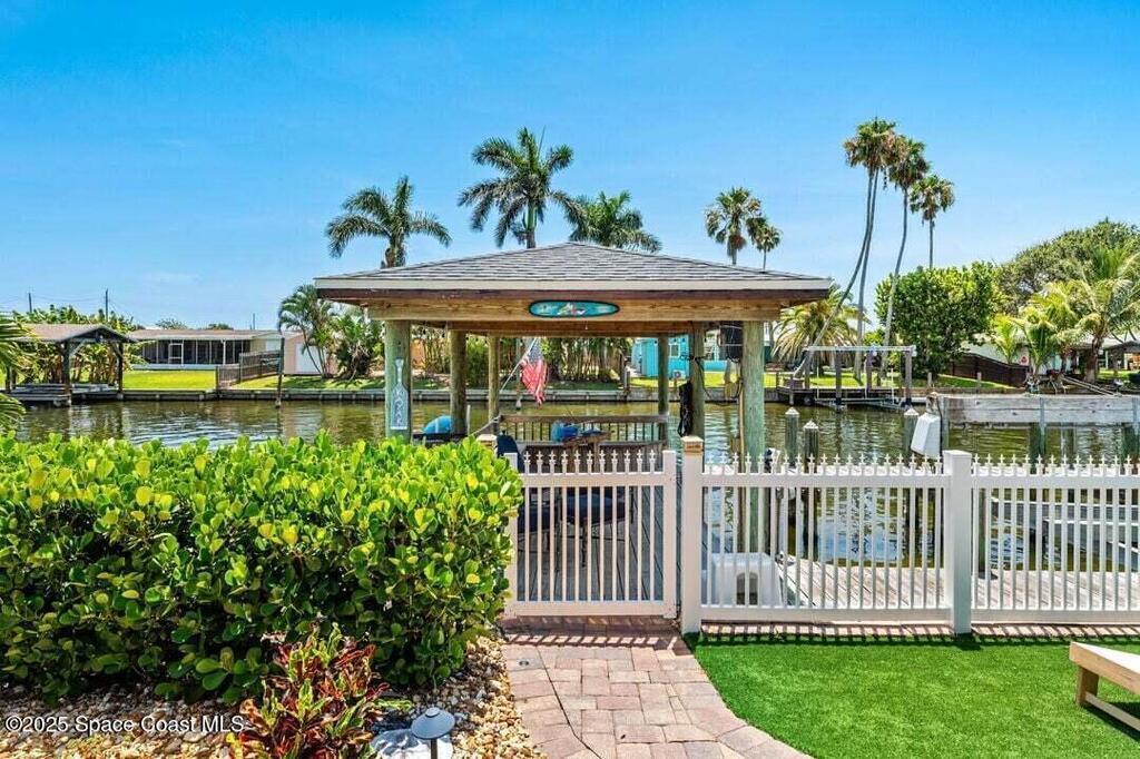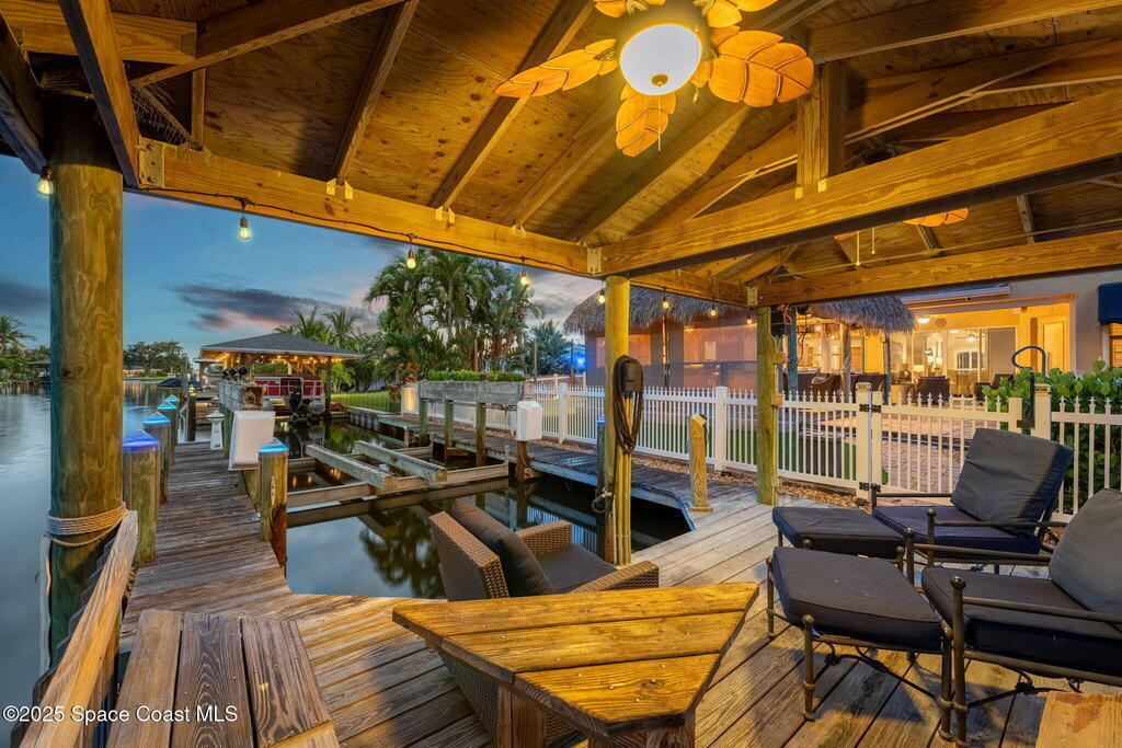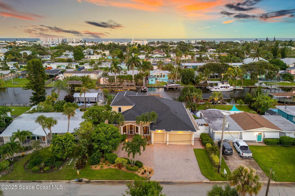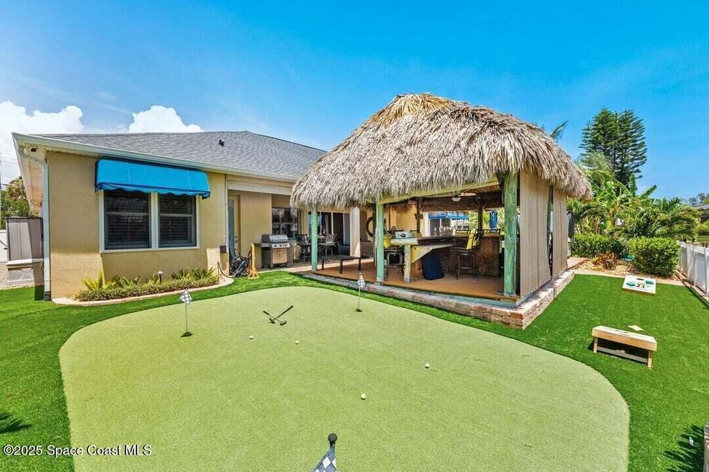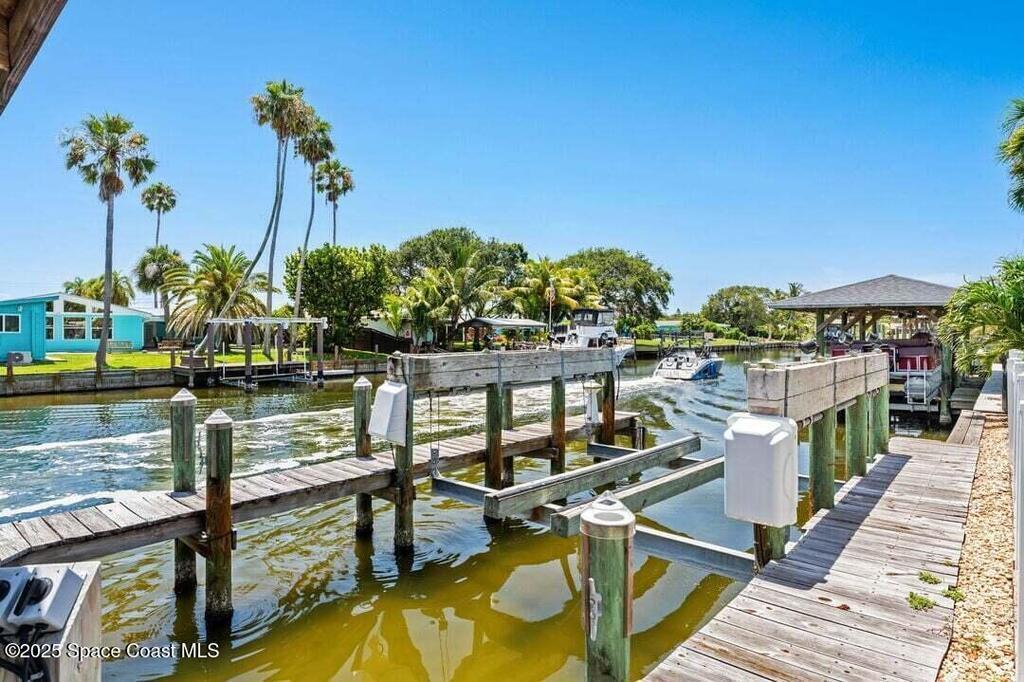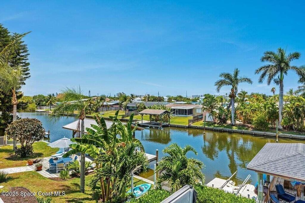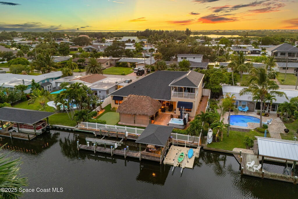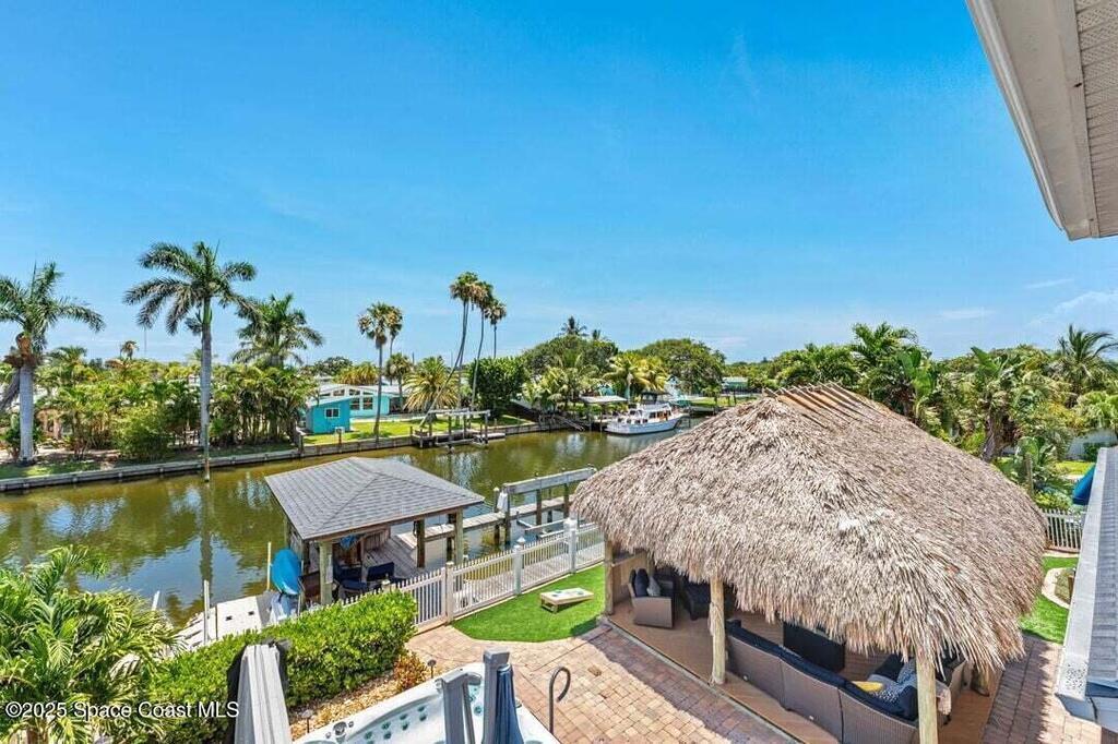 Welcome to this beautifully upgraded 5-bedroom Cocoa Beach home, complete with a versatile flex room that can serve as a 6th guest-room or office. The first-floor primary suite is a private retreat with a spacious layout, modern finishes, and a spa-like ensuite bathroom. A 3-car garage, fully under air and finished with epoxy flooring, provides abundant storage for vehicles, toys, and hobbies. The home features open-concept living and dining areas that flow seamlessly to expansive outdoor spaces. Built in 2006, this waterfront residence offers a custom tiki bar, hot tub, and putting green creating the ultimate backyard oasis for gatherings with family and friends. On the water, enjoy a deep-water canal with a 2021 dual-engine boat lift (approx. 16,000 lbs), floating dock with ramp, and racks for kayaks and paddleboards--perfect for boaters. Recent updates include a 2017 roof, 2021 A/C and water heater, storm protection, tiki hut hurricane shutters (2022), and a home security system.
