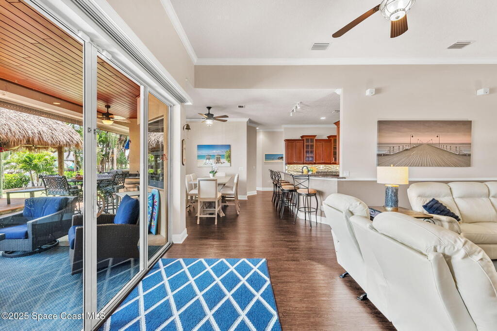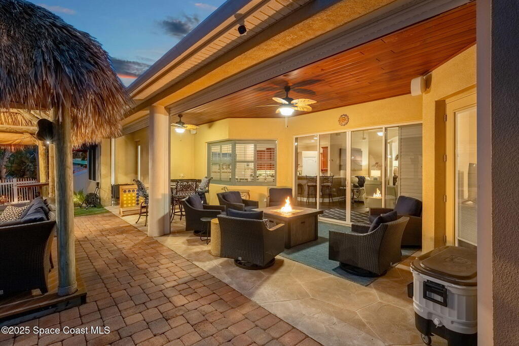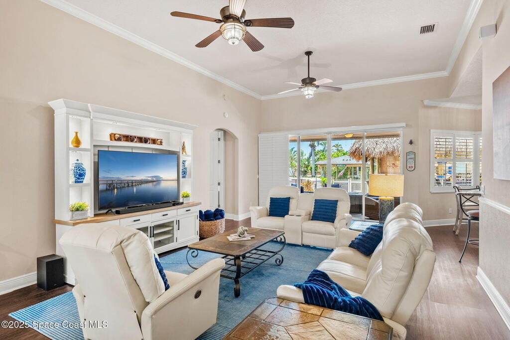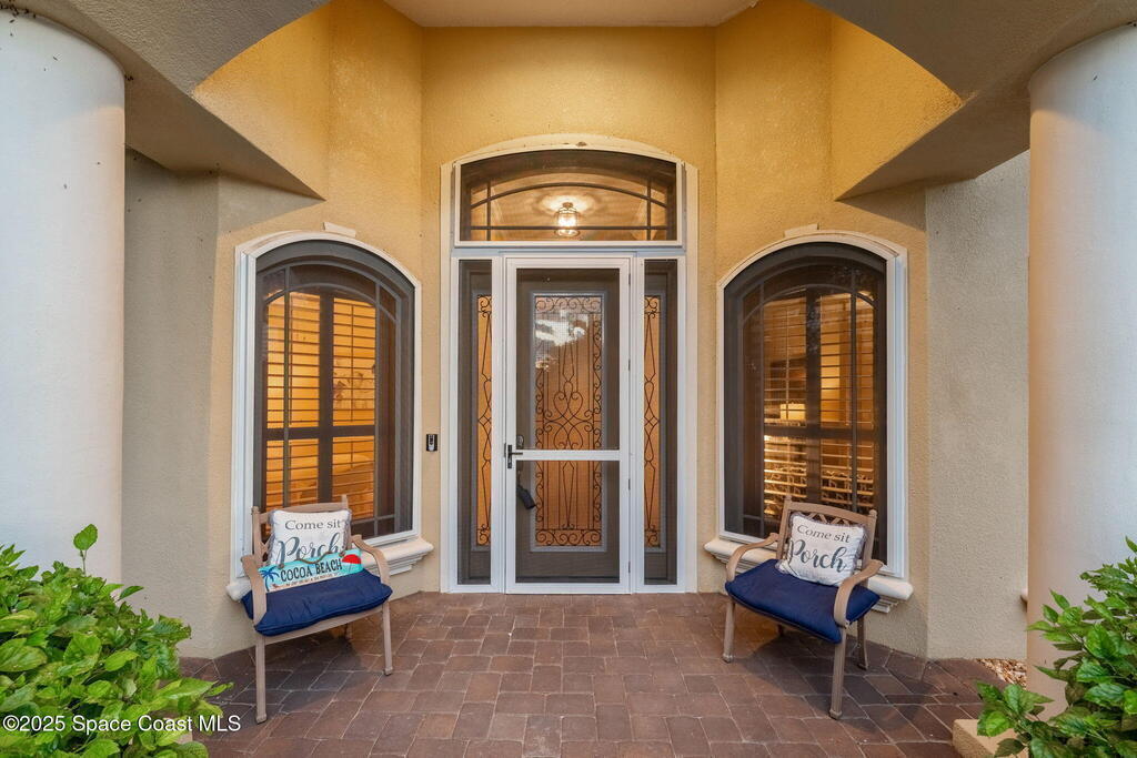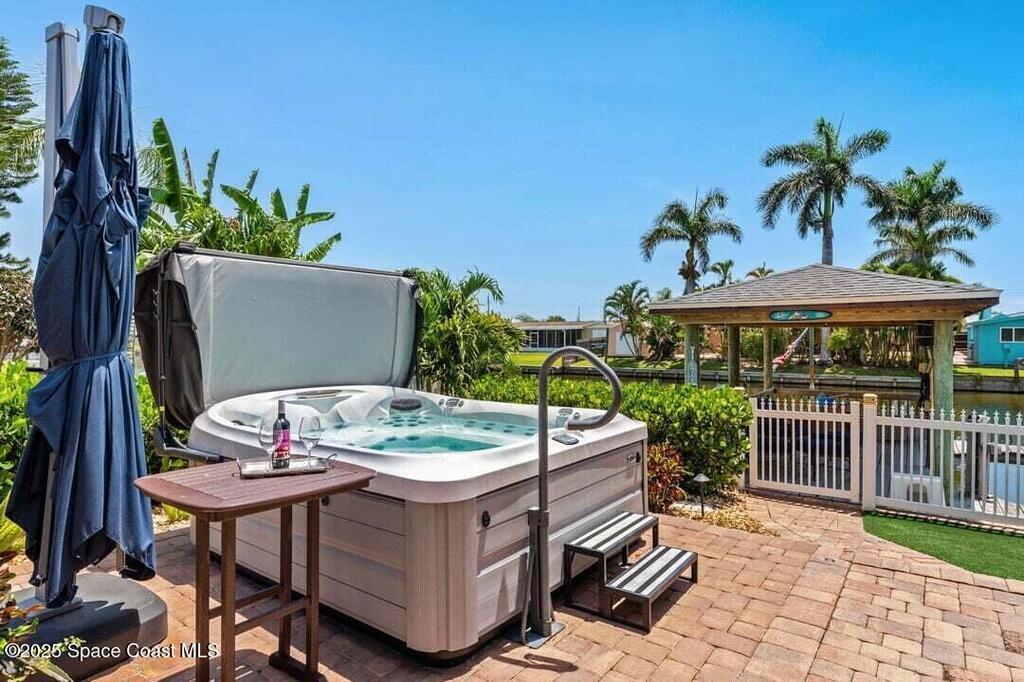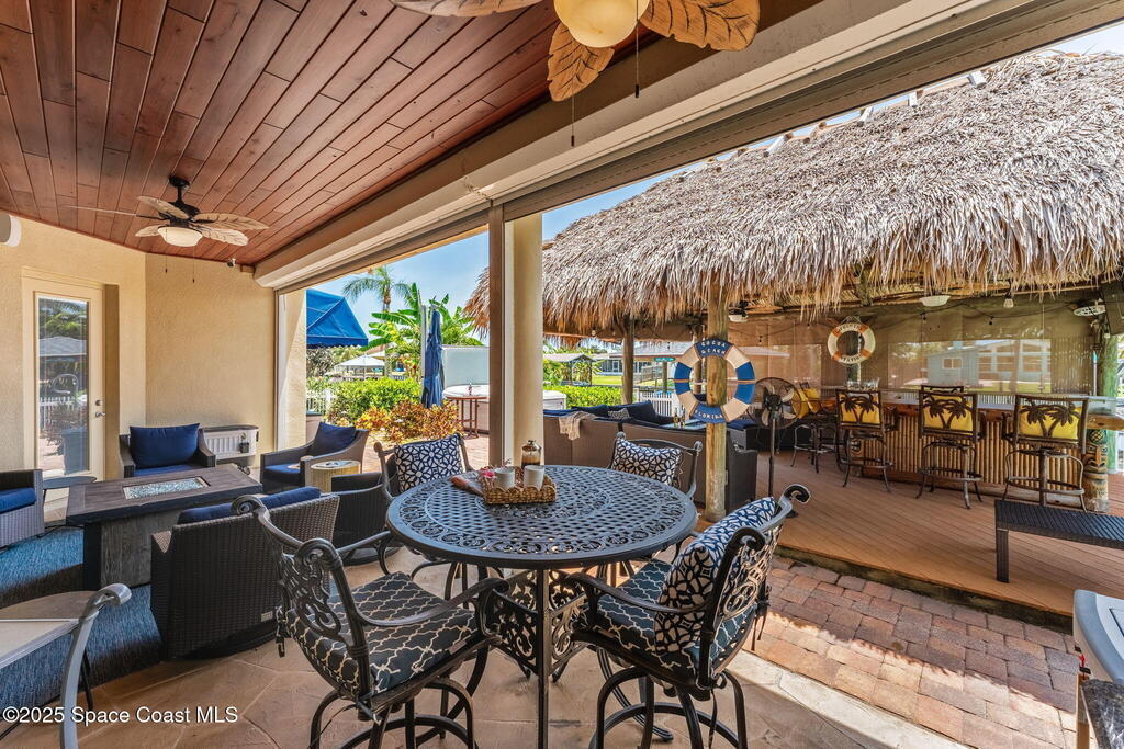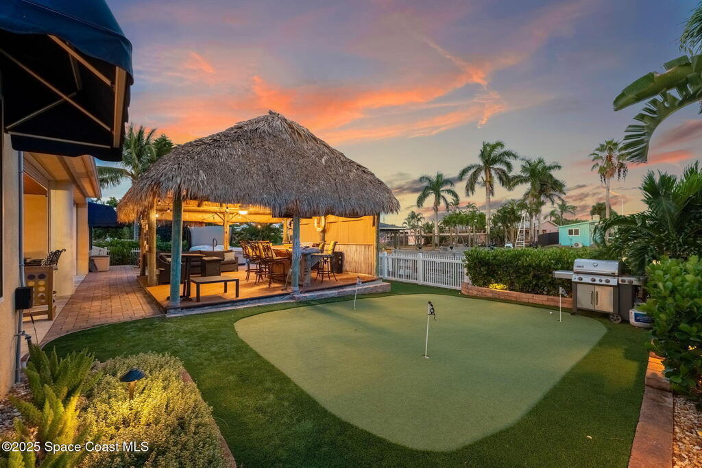 Welcome to this beautifully upgraded 5-bedroom Cocoa Beach home, complete with a versatile flex room that can serve as a 6th guest-room or office. The first-floor primary suite is a private retreat with a spacious layout, modern finishes, and a spa-like ensuite bathroom. A 3-car garage, fully under air and finished with epoxy flooring, provides abundant storage for vehicles, toys, and hobbies. The home features open-concept living and dining areas that flow seamlessly to expansive outdoor spaces. Built in 2006, this waterfront residence offers a custom tiki bar, hot tub, and putting green creating the ultimate backyard oasis for gatherings with family and friends. On the water, enjoy a deep-water canal with a 2021 dual-engine boat lift (approx. 16,000 lbs), floating dock with ramp, and racks for kayaks and paddleboards--perfect for boaters. Recent updates include a 2017 roof, 2021 A/C and water heater, storm protection, tiki hut hurricane shutters (2022), and a home security system.