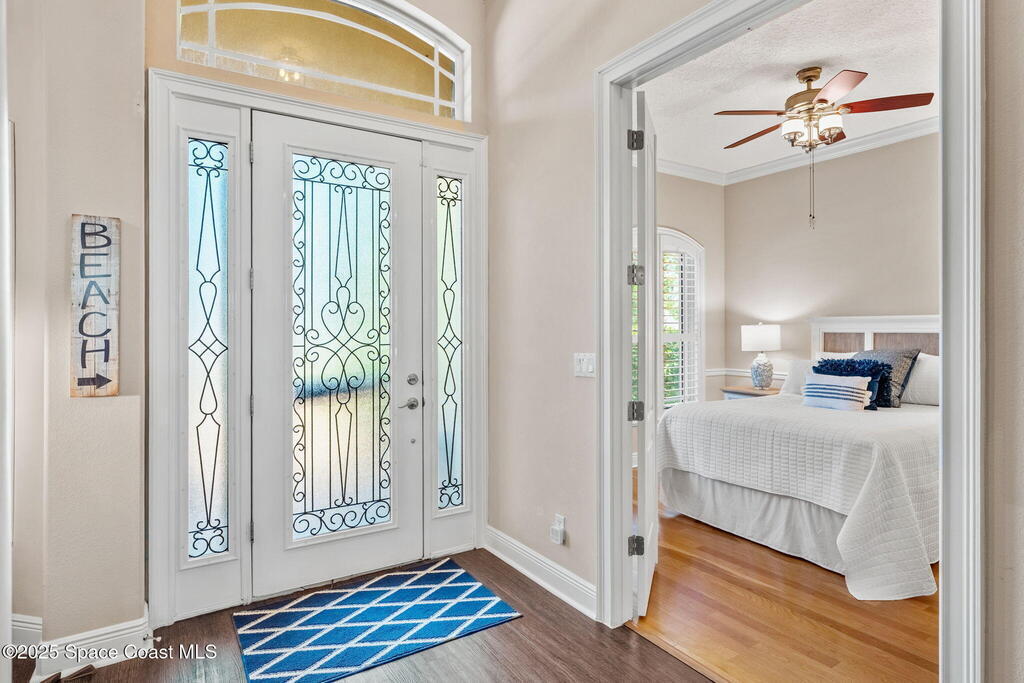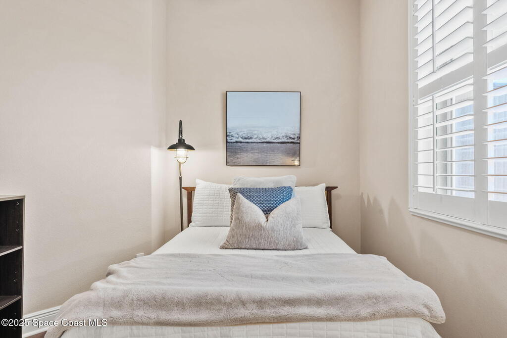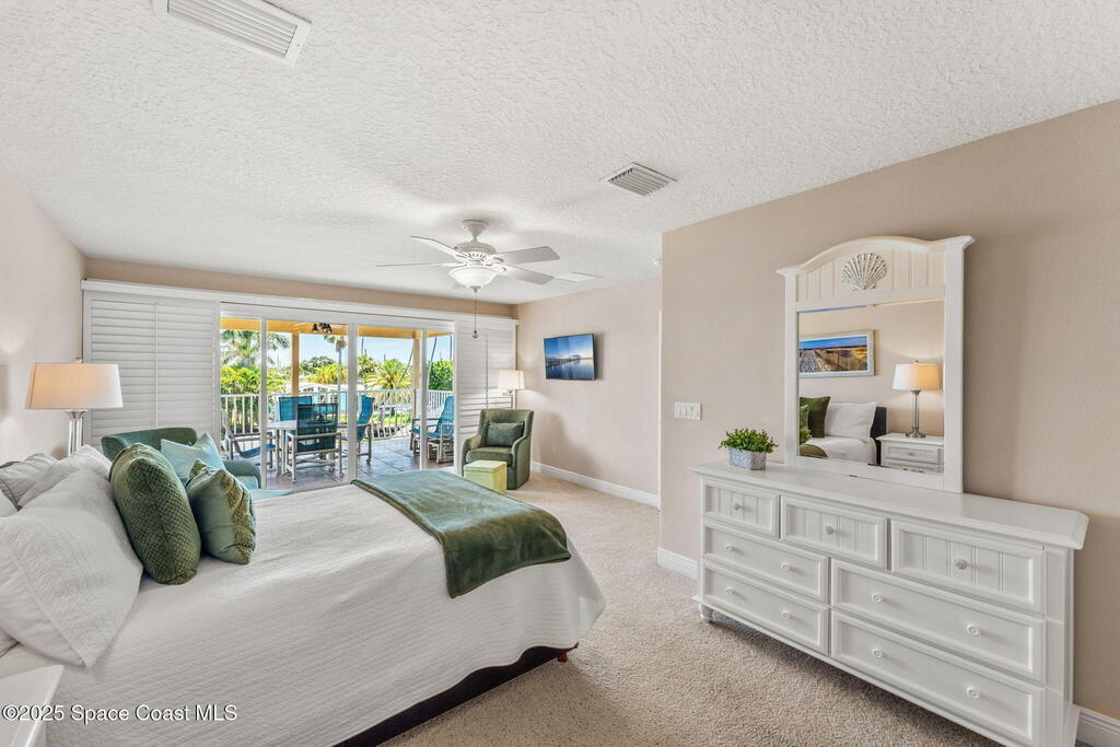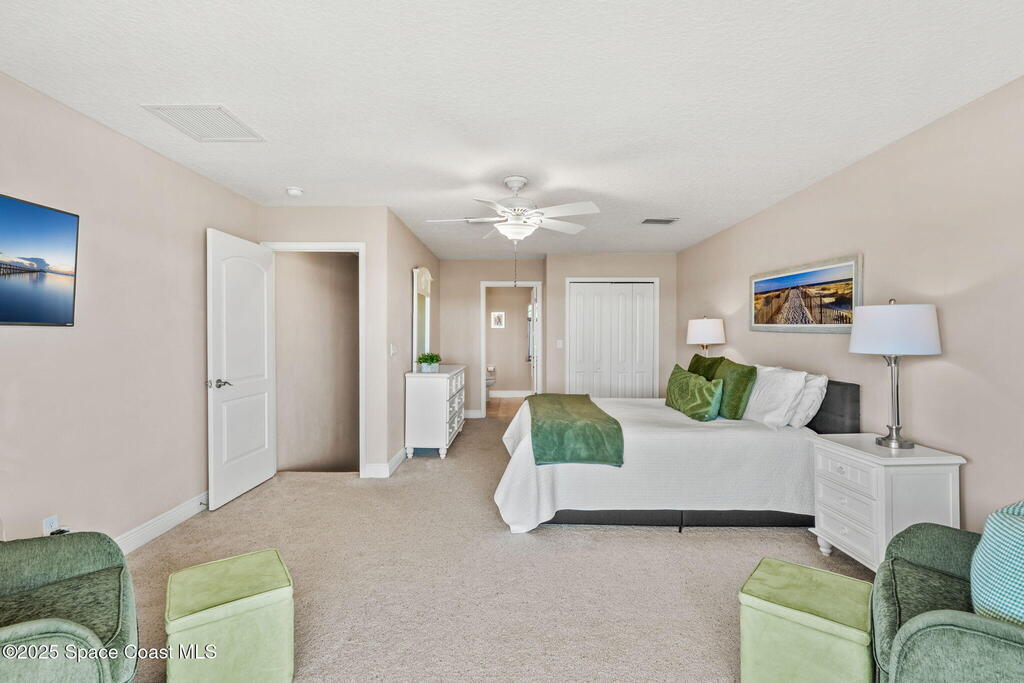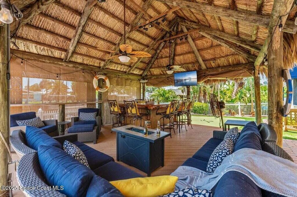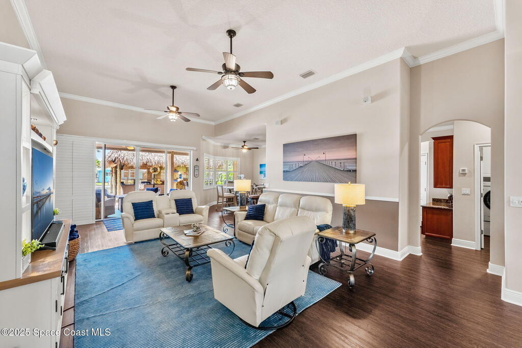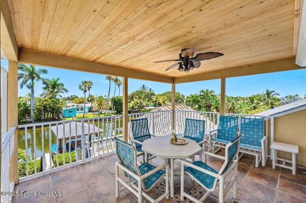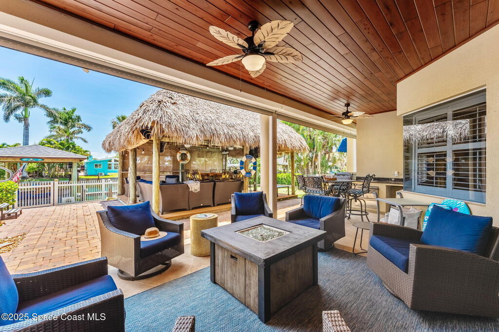Welcome to this beautifully upgraded 5-bedroom Cocoa Beach home, complete with a versatile flex room that can serve as a 6th guest-room or office. The first-floor primary suite is a private retreat with a spacious layout, modern finishes, and a spa-like ensuite bathroom. A 3-car garage, fully under air and finished with epoxy flooring, provides abundant storage for vehicles, toys, and hobbies. The home features open-concept living and dining areas that flow seamlessly to expansive outdoor spaces. Built in 2006, this waterfront residence offers a custom tiki bar, hot tub, and putting green creating the ultimate backyard oasis for gatherings with family and friends. On the water, enjoy a deep-water canal with a 2021 dual-engine boat lift (approx. 16,000 lbs), floating dock with ramp, and racks for kayaks and paddleboards--perfect for boaters. Recent updates include a 2017 roof, 2021 A/C and water heater, storm protection, tiki hut hurricane shutters (2022), and a home security system.