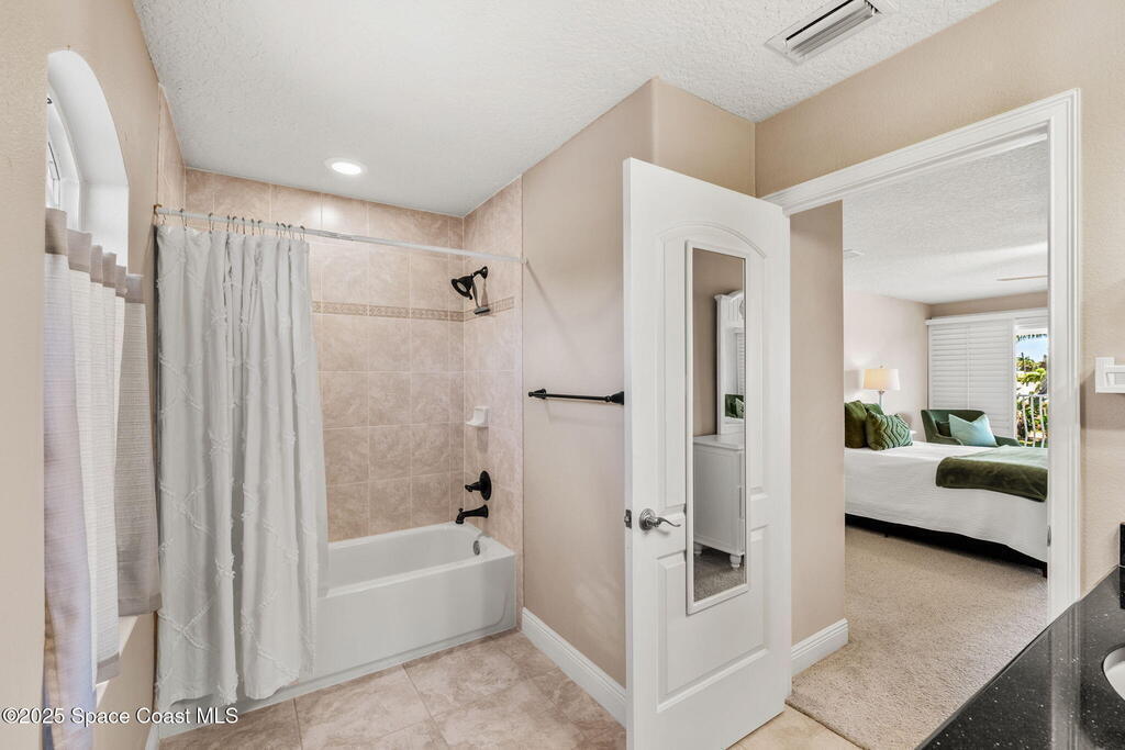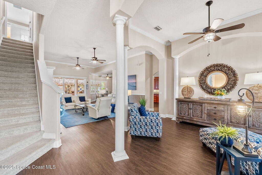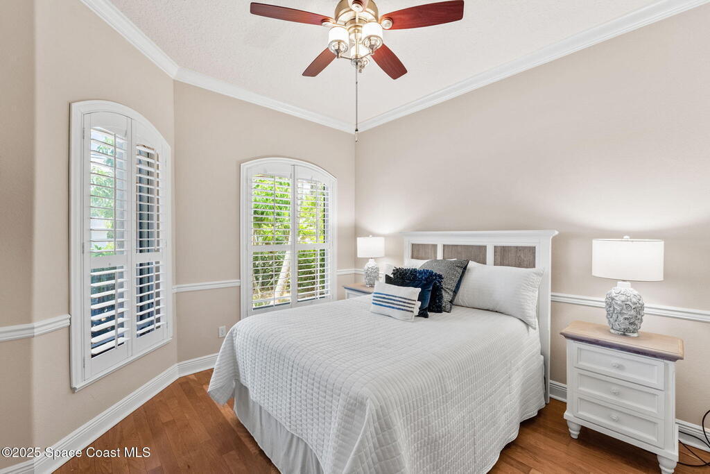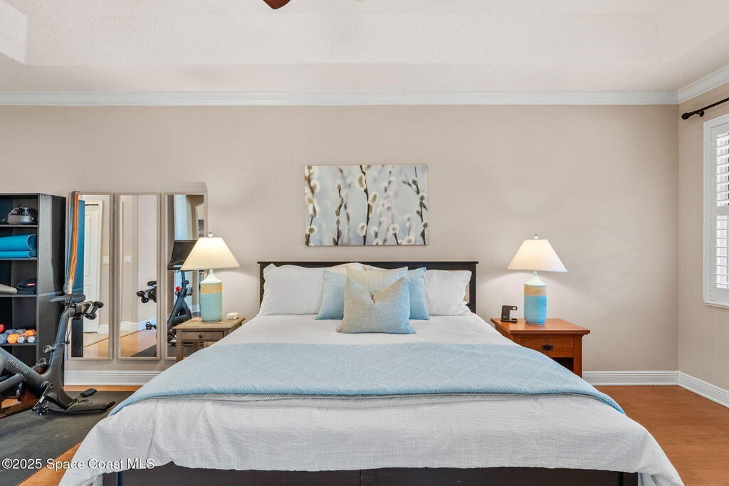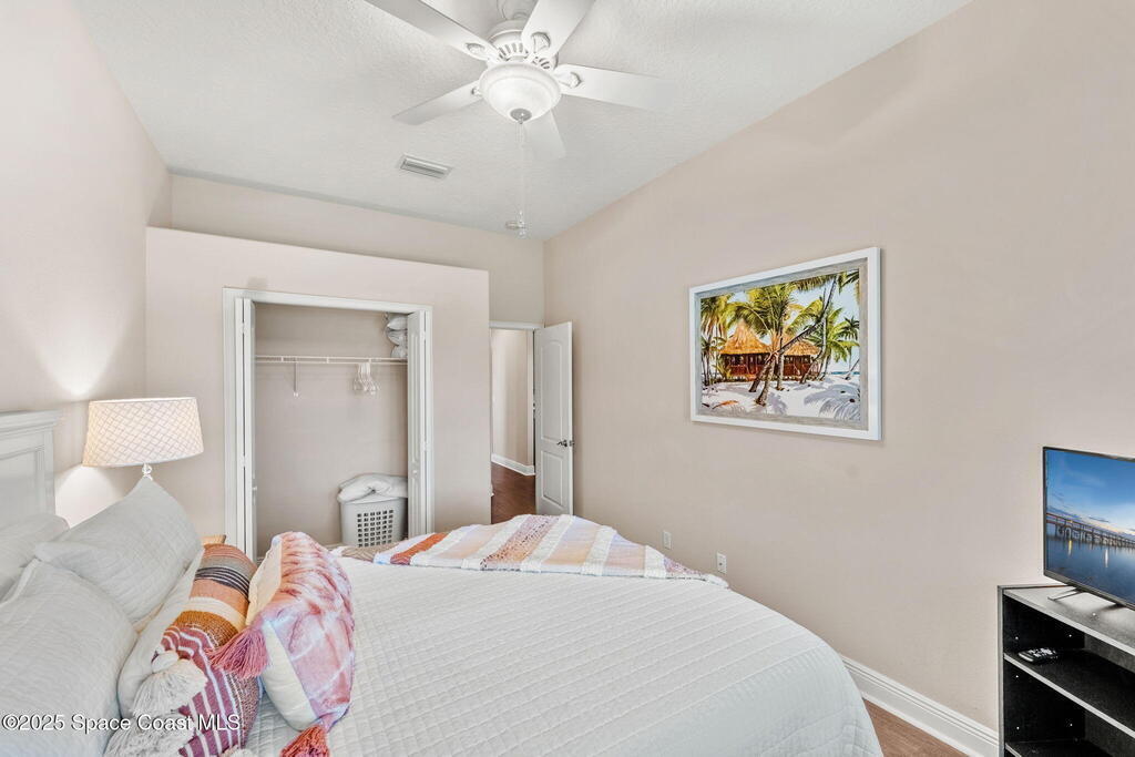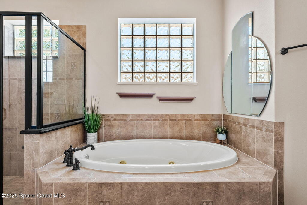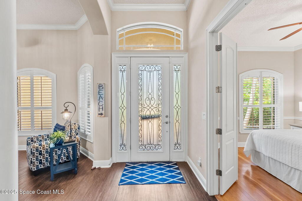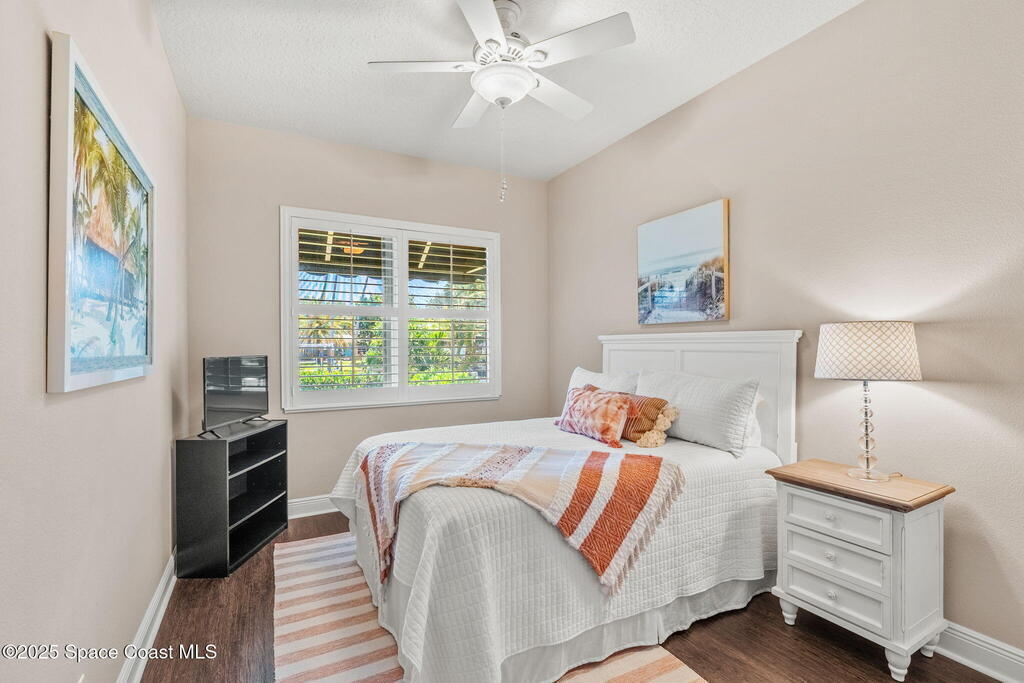 Welcome to this beautifully upgraded 5-bedroom Cocoa Beach home, complete with a versatile flex room that can serve as a 6th guest-room or office. The first-floor primary suite is a private retreat with a spacious layout, modern finishes, and a spa-like ensuite bathroom. A 3-car garage, fully under air and finished with epoxy flooring, provides abundant storage for vehicles, toys, and hobbies. The home features open-concept living and dining areas that flow seamlessly to expansive outdoor spaces. Built in 2006, this waterfront residence offers a custom tiki bar, hot tub, and putting green creating the ultimate backyard oasis for gatherings with family and friends. On the water, enjoy a deep-water canal with a 2021 dual-engine boat lift (approx. 16,000 lbs), floating dock with ramp, and racks for kayaks and paddleboards--perfect for boaters. Recent updates include a 2017 roof, 2021 A/C and water heater, storm protection, tiki hut hurricane shutters (2022), and a home security system.