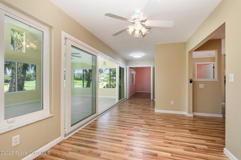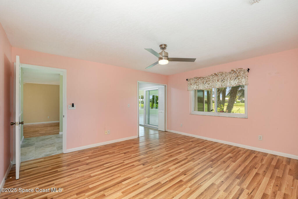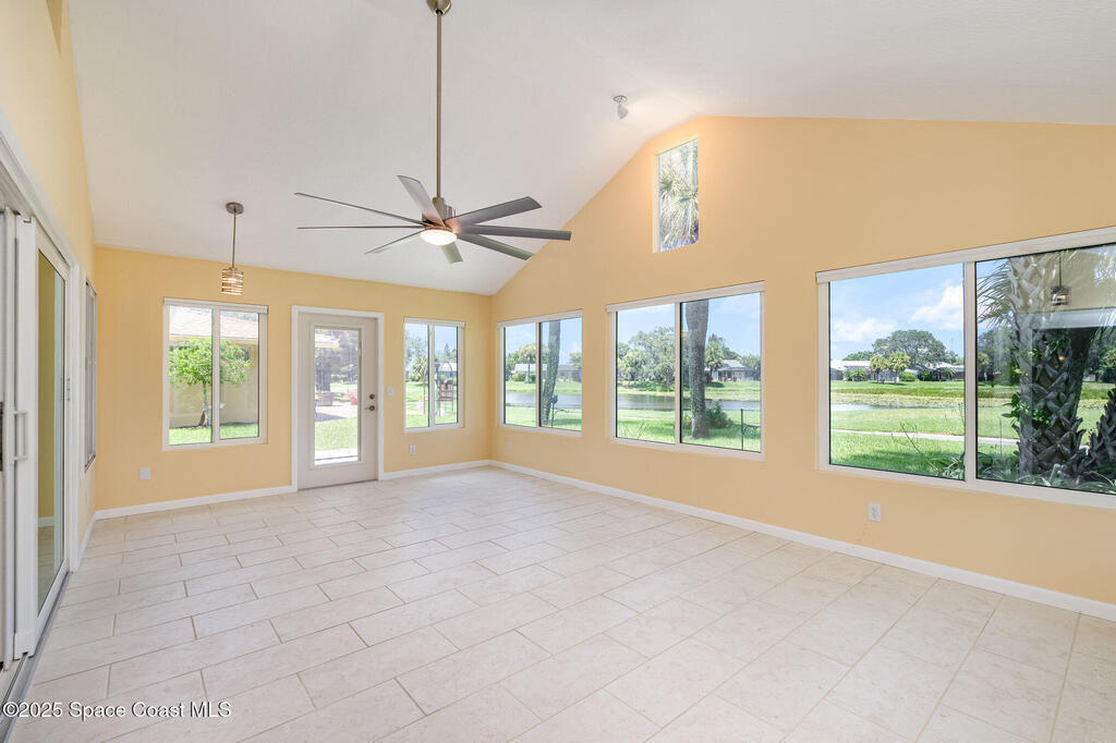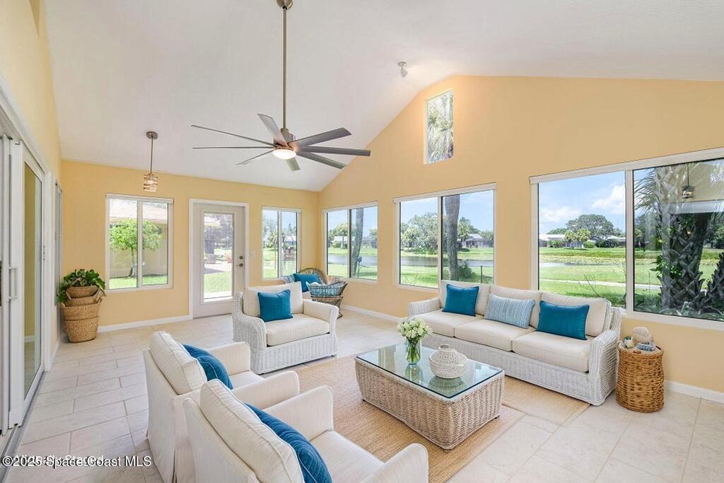 Located in a resort-style country club community, this beautifully upgraded Expanded Bangor model offers the ultimate Florida lifestyle with top-tier amenities. Enjoy stunning golf course and water views from the large Florida room and outdoor paver patio with retractable awning--perfect for entertaining or relaxing in style. Featuring an added bedroom, tile and laminate flooring throughout, and California closets in the primary and one guest bedroom. Kitchen boasts Martha Stewart cabinets and quartz countertops. Updated primary bath with walk-in shower, newer fans and lights, 2021 roof, solar attic fan, and added attic insulation. Paver driveway and pristine landscaping complete this move-in-ready home designed for comfort and style.