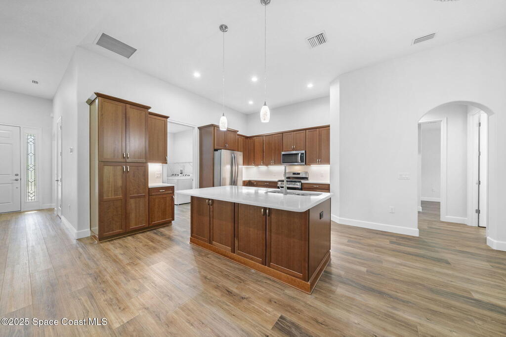 Stunning Custom Home on 1 Acre with In-Law Suite & Preserve View offers a blend of luxury, functionality, and nature. With 4 spacious bedrooms, 3 full baths. An open-concept layout with 12' ceilings in the main living areas. The great room features a gas fireplace. A formal dining room and breakfast nook provide versatile options for entertaining. The kitchen, boasting 36'' solid wood cabinets, quartz countertops and backsplash, stainless steel appliances, a large island with breakfast bar, walk-in pantry, and a buried propane tank that fuels the range, fireplace, and BBQ grill. The primary suite with dual walk-in closets, a walk-in shower with dual rain heads, and double vanities. Circulating hot water switch for immediate warm water in the bathrooms. The spacious in-law suite is perfect for family or guests, featuring a private entrance, kitchenette (cooktop, microwave, sink, fridge hookup), breakfast bar, living area, and full bath with a handicap-accessible recessed shower.