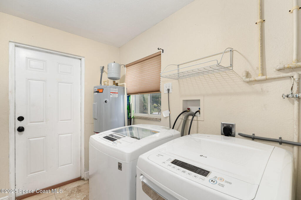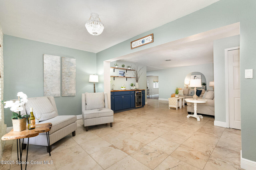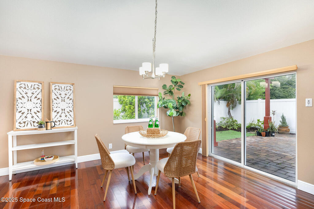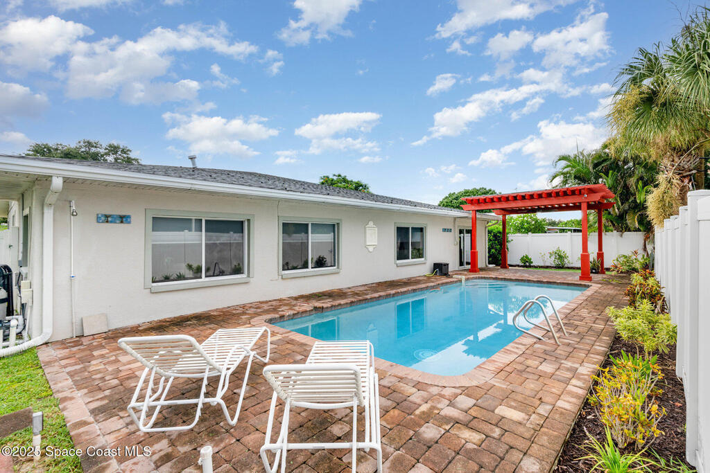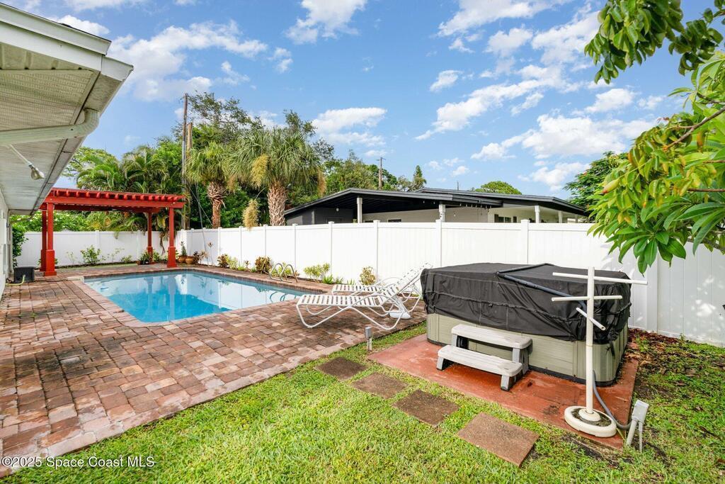Back Up Offers Being Accepted. Minutes to the BEACH! NO HOA + pool + boat/RV parking! This 4BR/2BA, 2,376 SF corner-lot home blends indoor comfort with resort-style outdoor living. Inside, travertine and Brazilian cherry floors set a warm, upscale tone. A dedicated entertaining lounge with wet bar and wine fridge adjoins the main living area. The split plan separates three secondary bedrooms from a private primary wing with a 14-ft walk-in closet and a spa bath featuring an oversized rain-style shower. Out back, the tropical fenced yard offers a heated pool & hot tub, brick-paver deck, and a pergola patio--ideal for BBQs and evening lounging. Two driveways fit 6+ vehicles (bring the boat/RV). Inside laundry and generous storage. HVAC (heating & A/C) new in May 2025. Electric Pool Heater 2021 and New Pool Pump and Filter 2020. Minutes to Kennedy Space Center, beaches, Port Canaveral & SR-528.