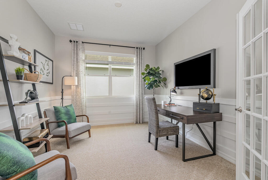 The Clifton is a beautiful one-story home in Cypress Bay West, Palm Bay, Florida, built with durable concrete block construction. This 3-bedroom, 2-bathroom home offers 1,816 square feet of living space, a two-car garage, and a covered rear porch. The open-concept design features oversized tile flooring in the main living and wet areas. The spacious kitchen boasts an island with bar seating, quartz countertops, an oversized undermount sink, ample cabinet space, and stainless-steel appliances--perfect for entertaining. The dining and great room are filled with natural light from large windows and sliding glass doors leading to the expansive covered lanai. The primary suite includes an en suite bath with double undermount sinks, quartz countertops, and a walk-in closet. Two additional guest bedrooms and a full bath complete the home. The Clifton also includes the Home is Connected smart home package, allowing control of your home from anywhere