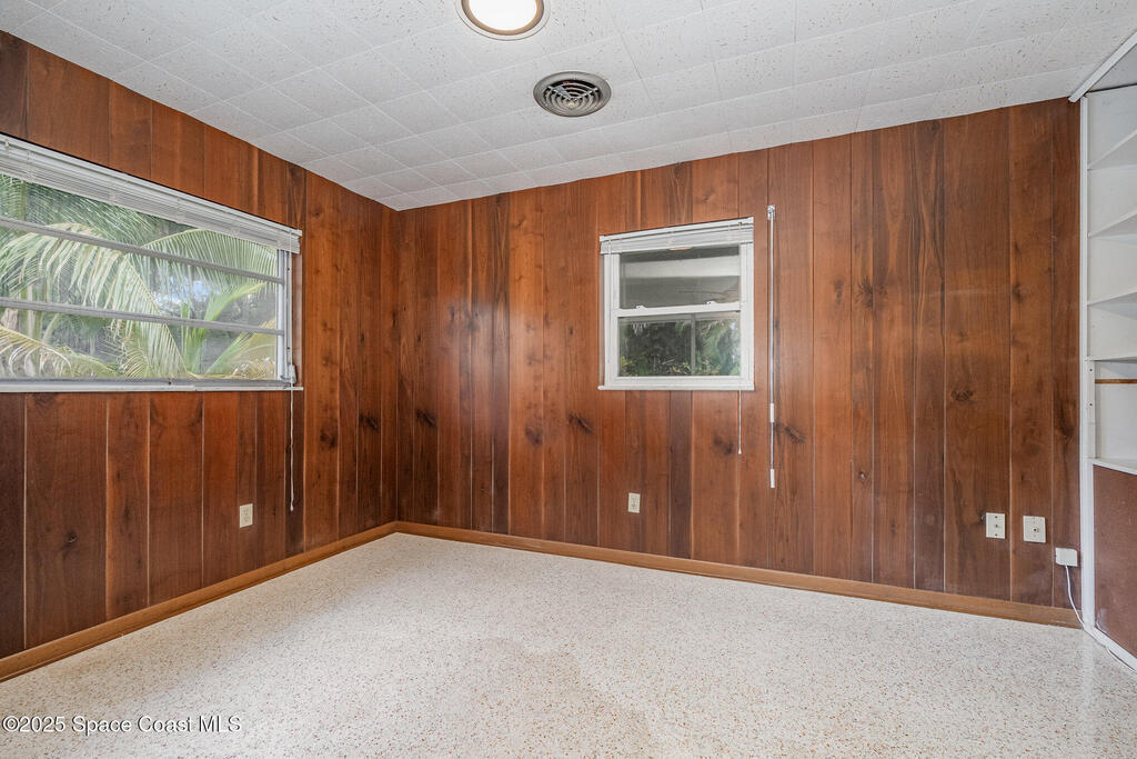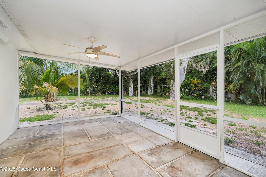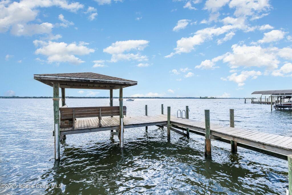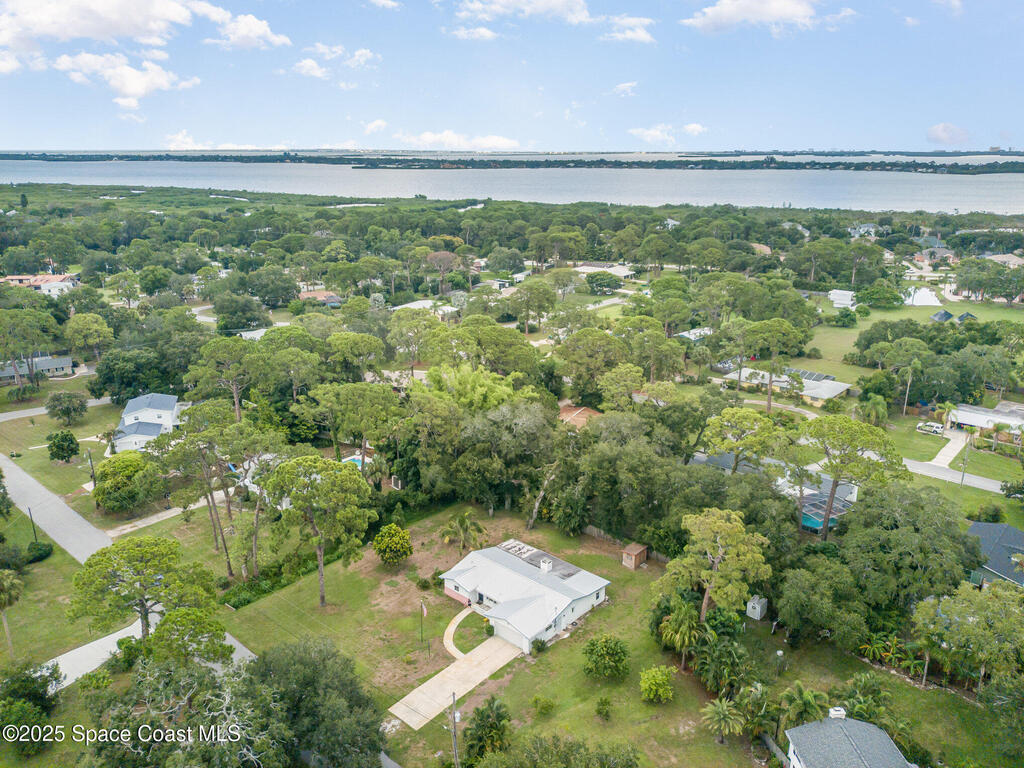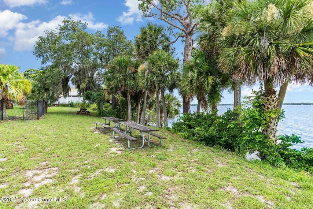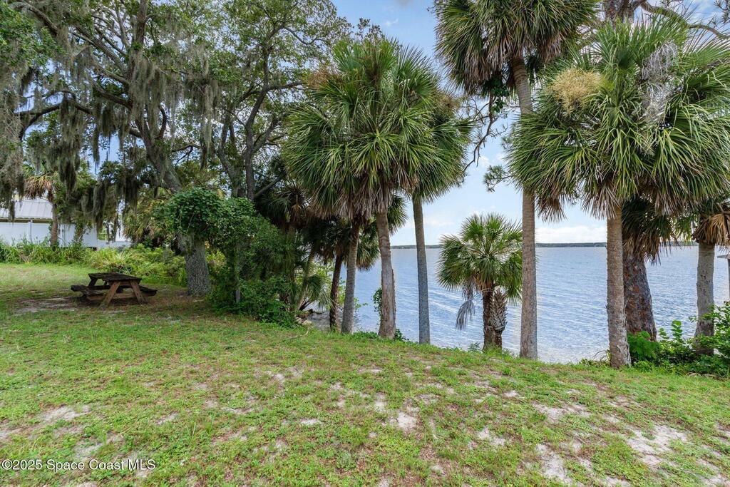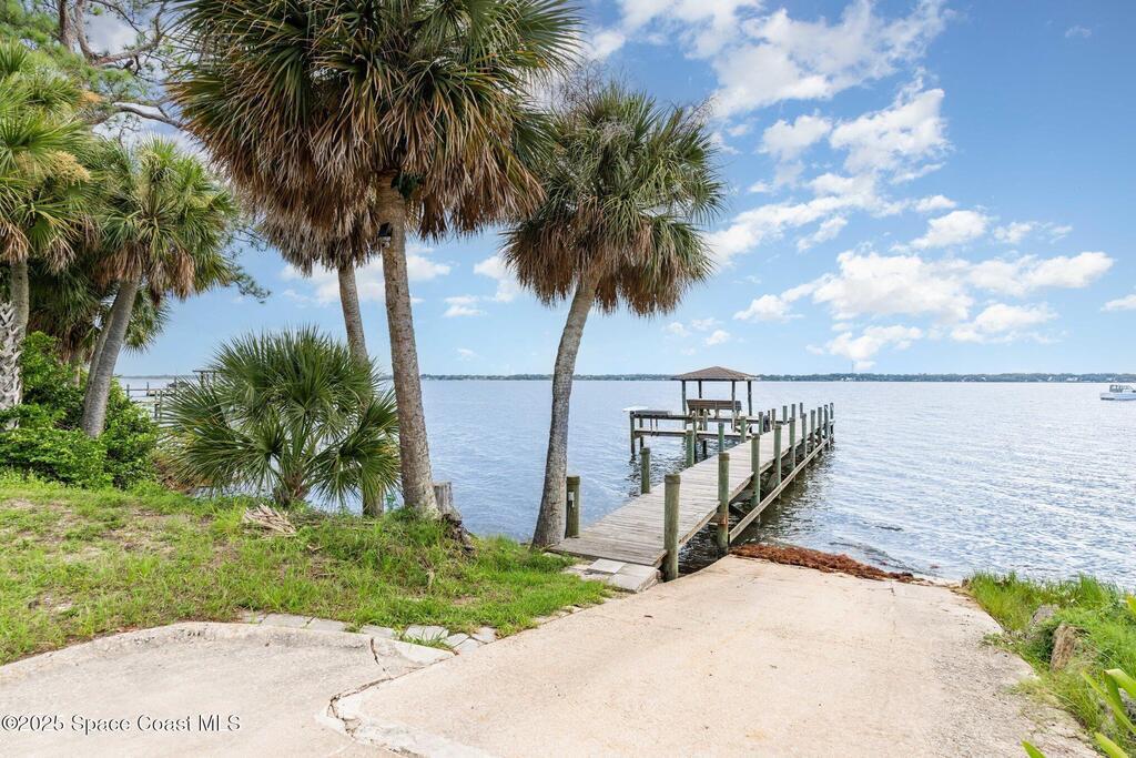 Come and see this Tropical South Merritt Island timeless mid-century modern 4/2 on .53 acres. Spacious yard with producing fruit trees, well for sprinklers, and shed. Windows protected with hurricane roll down shutters. Waterfront community with private park, boat ramp, dock, and picnic area. Rare opportunity in a sought-after location. Homeowner is leaving generator onsite as panel is set up to back feed in case of storm related power outage.Come and put your personal updates and touches on this incredible home.