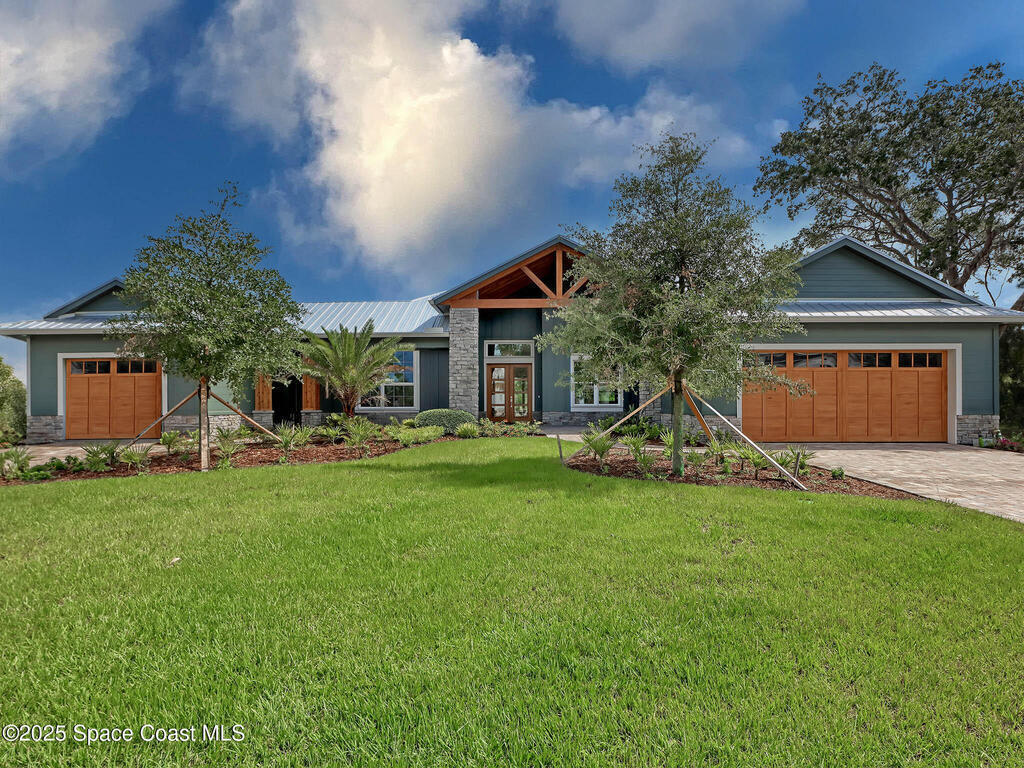 To be built in prestigious Aripeka at Viera, this stunning luxury home sits on a private cul-de-sac lot (.39 acres) with serene lake and preserve views. Featuring 5 bedrooms or 3 bedrooms + a large office, and a spacious game room, this home is designed for modern luxury living. Enjoy high-end features such as hurricane-impact windows and doors, metal roof, natural gas, spray foam insulation for energy efficiency. Entertain in style with a chef-inspired kitchen boasting Dacor appliances and quartz countertops throughout. Elegant tile flooring flows seamlessly through the open layout, leading to your private pool oasis. A 522 sq. ft. detached garage with mini-split A/C is perfect for a workshop or can be converted into a guest house with kitchenette for multi-generational living (additional cost). Located in the highly desirable Viera area, minutes from beaches, shopping, I-95, and A-rated schools.--don't miss the chance to create your dream home!