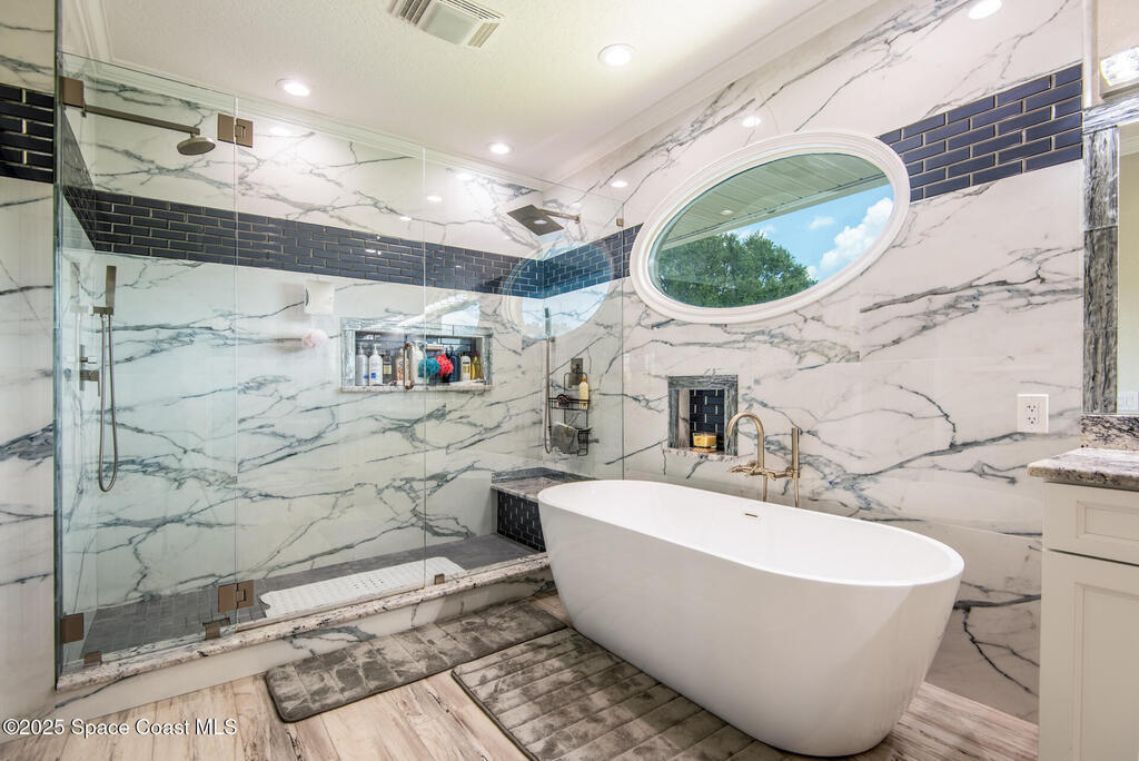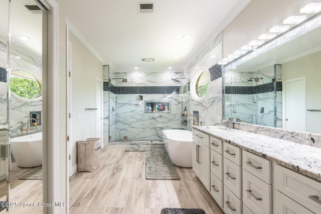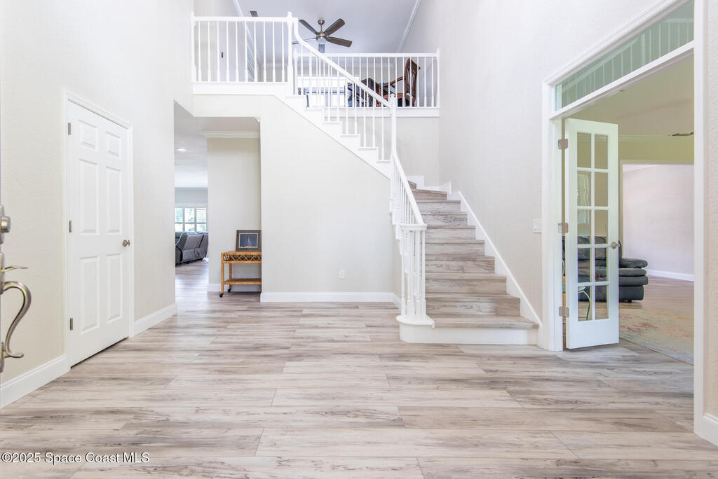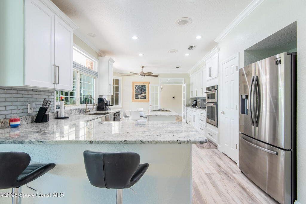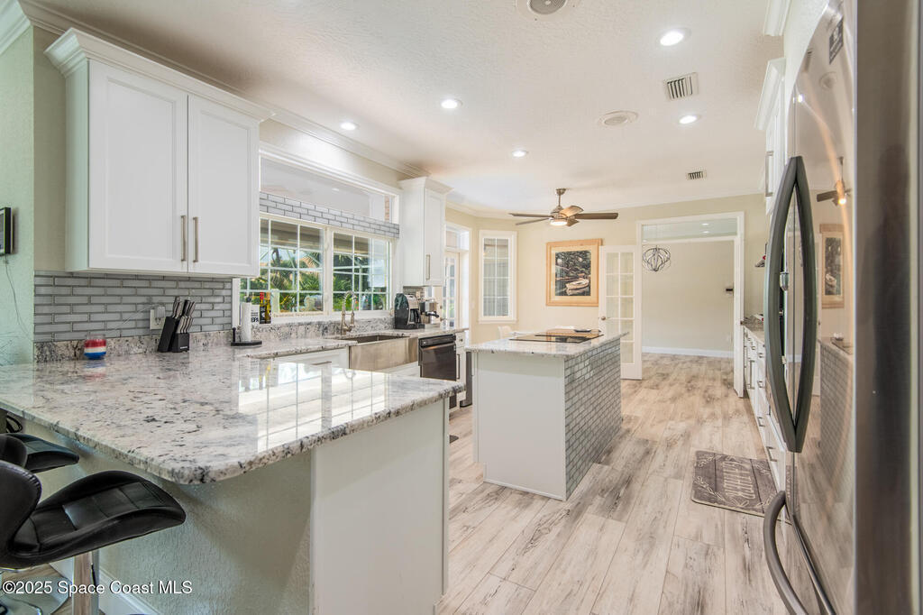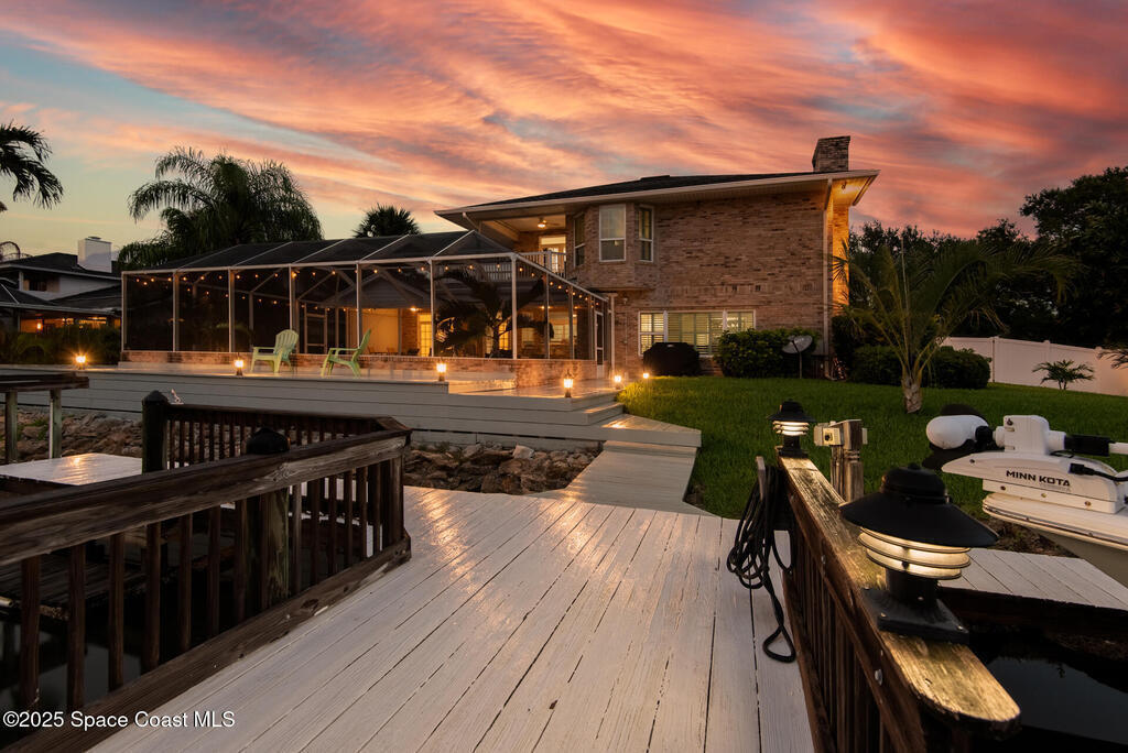 Exquisite canal front residence in the amazing Windward Cove subdivision in the Kiwi Racquet and Fitness Club neighborhood offers luxury living with four bedrooms, three bathrooms, and an impressive 3,643 sq ft of meticulously crafted interiors. A boater's dream, the property boasts 97 feet of pristine water frontage, a private dock with a boat lift, brand new deck and direct access to navigable Banana River. The screened-in pool and spa outdoor provides splendid entertainment. Living room with gas fireplace overlooking the amazing spacious kitchen with island, granite counter tops and fully remodeled cabinets. All three bathrooms tastefully remodeled. Hurricane impact windows provides the perfect comfort in Florida living. New roof in 2021 and the whole house with high end luxury lifetime vinyl plank floor. This rare waterfront sanctuary seamlessly combines elegance, exclusivity, and the ultimate coastal lifestyle.