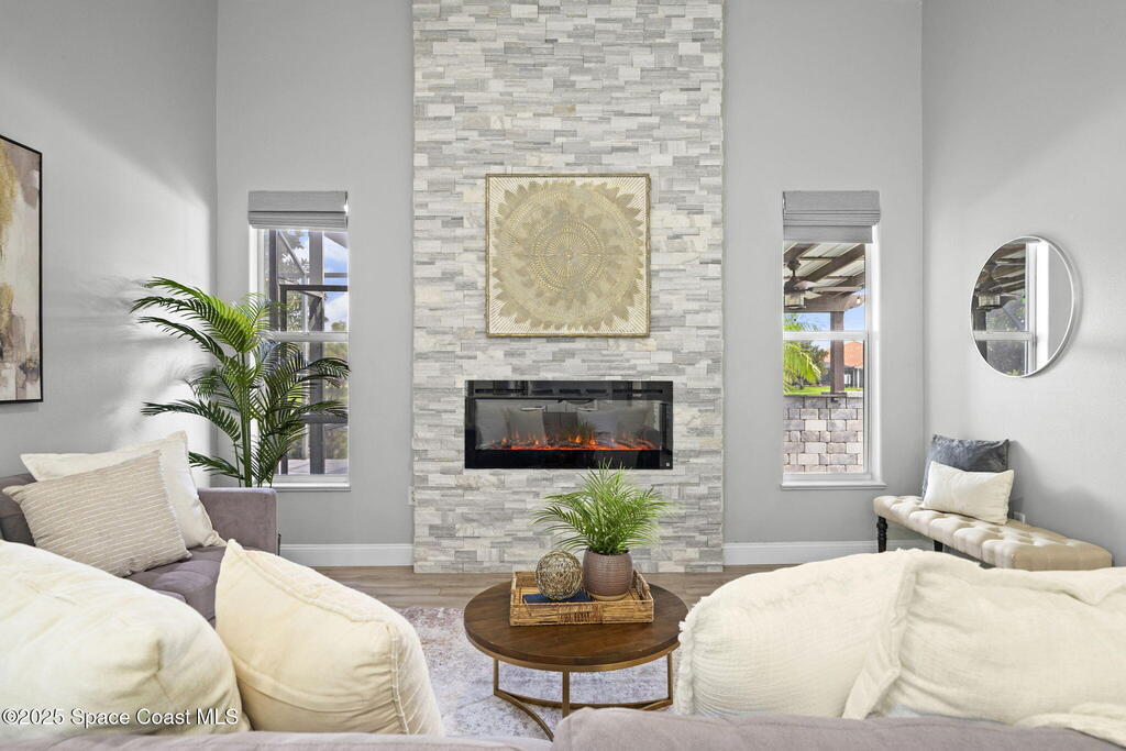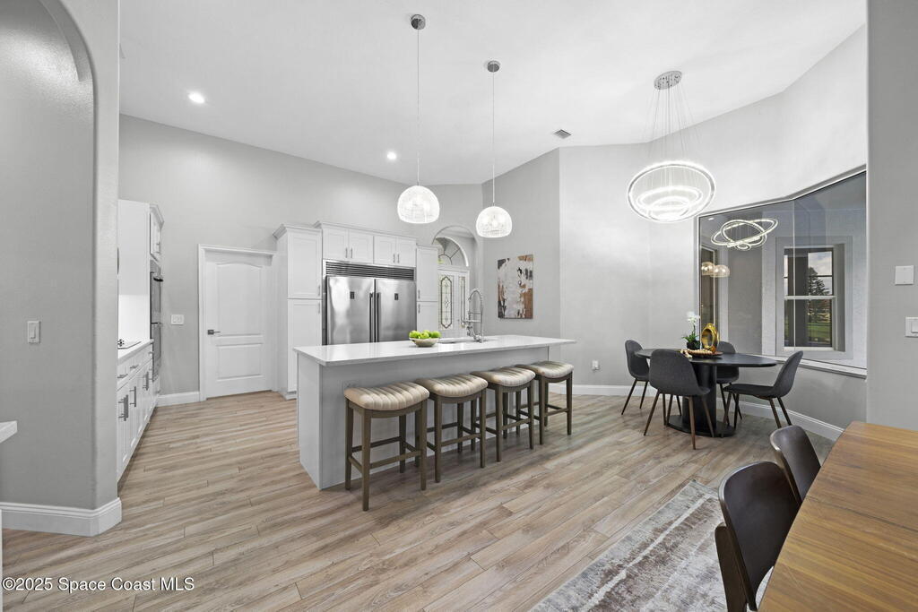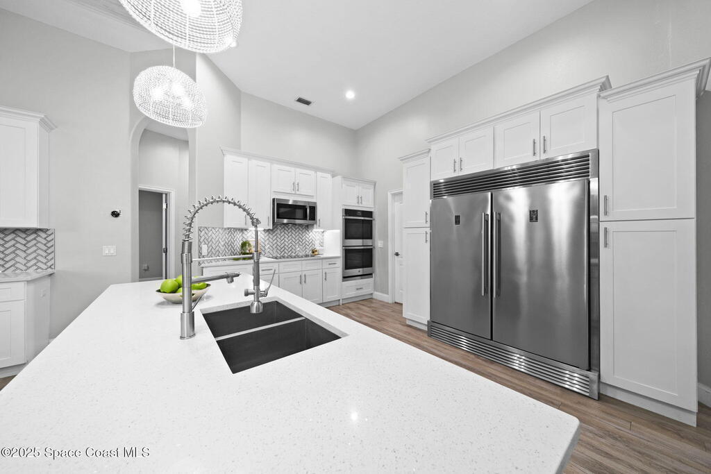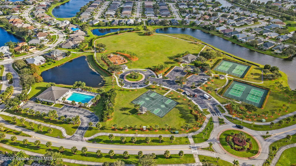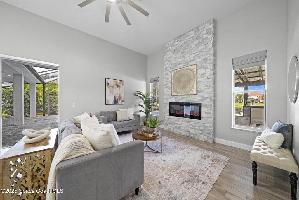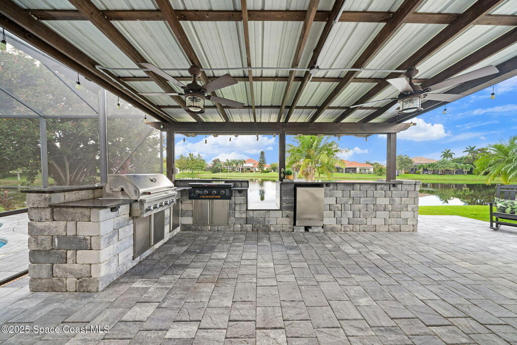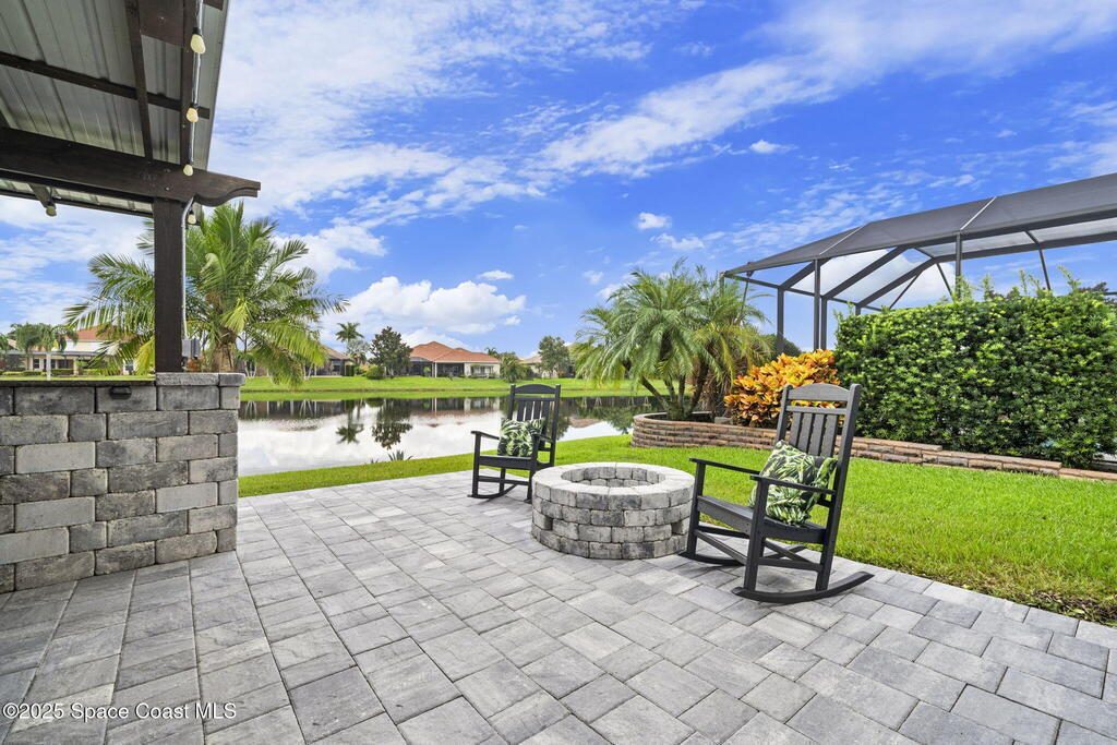 Nestled in a desirable, family-friendly neighborhood within Salerno Village's exclusive Ravencliff enclave, this custom 4-bedroom, 3-bath plus office home blends elegance and comfort with seamless indoor-outdoor living and peaceful lake views. The gourmet kitchen features quartz countertops, stainless appliances, double ovens, and a commercial-grade refrigerator, complemented by a wine bar with fridge. Expansive sliding glass doors open to a screened patio with a sparkling freeform pool and full summer kitchen overlooking the water. The luxurious owner's suite includes dual walk-in closets and a spa-inspired bath with soaking tub and oversized shower. Residents enjoy resort-style amenities including a swim club with Olympic-size pool, tennis and basketball courts, playground, pavilions, and scenic trails. Move-in ready, this home offers the perfect balance of relaxation and entertainment.