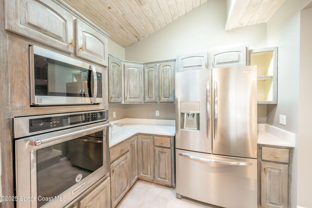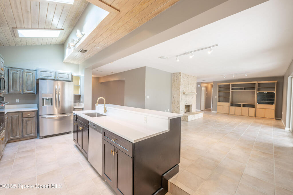 Golf course pool home in a highly desirable neighborhood. Large lot and open views of golf course in this serene, sought-after Country Club subdivision. Screened, private pool with large deck and lanai. Pool room for storage of pool toys. Short drive to the beach but far enough away to enjoy a peaceful lifestyle. Newer roof, wind rated garage door, and A/C in 2021. Newer luxury vinyl plank flooring in the bedrooms and ceramic tile throughout the rest of the house. Quartz countertops and newer kitchen island, newer stainless steel appliances and cooktop. Double sided coquina stone fireplace, skylights in the master bathroom and kitchen. Tongue and groove vaulted wood ceiling in kitchen and on the porch. Large, oversized windows providing light in every room. Large laundry room with storage. Short distance to schools and public recreational facilities including golf, tennis, olympic size swimming pool, and parks. Underground utilities. The best of living in Cocoa Beach