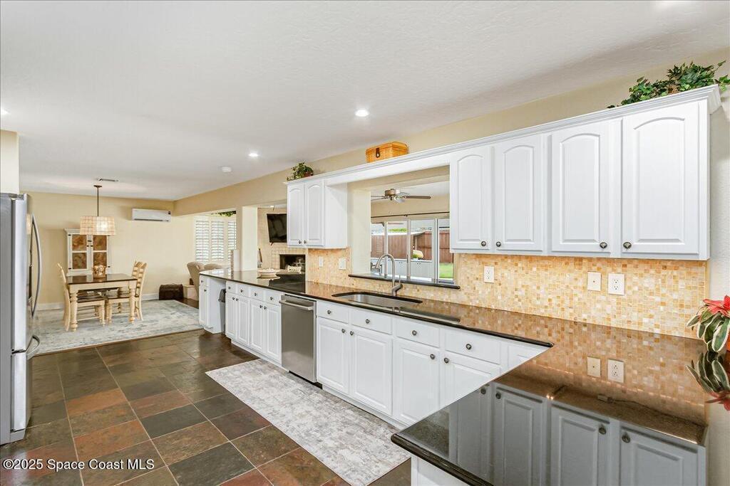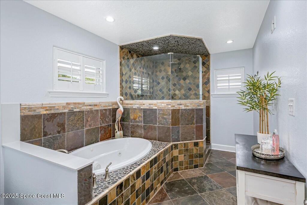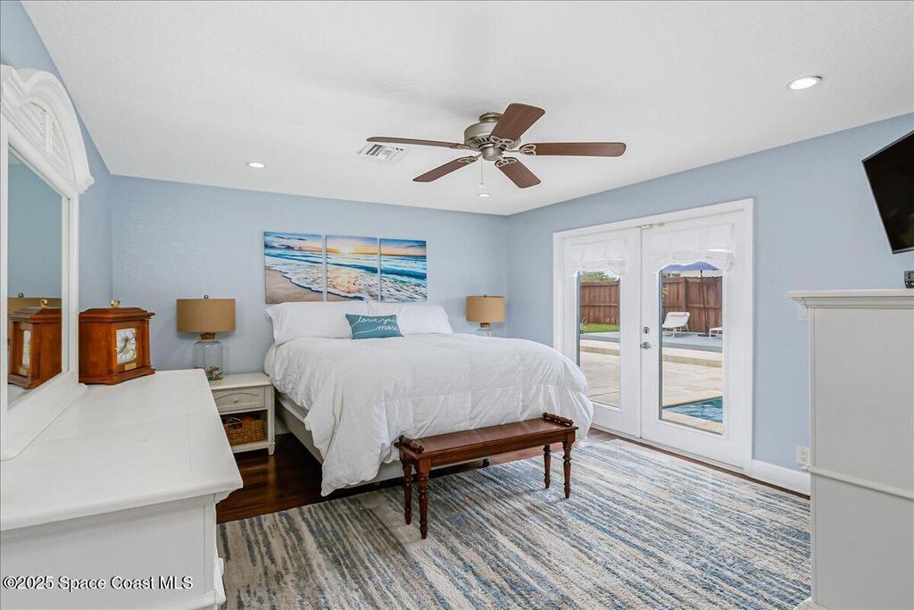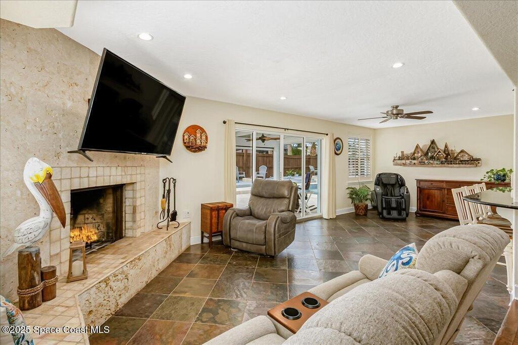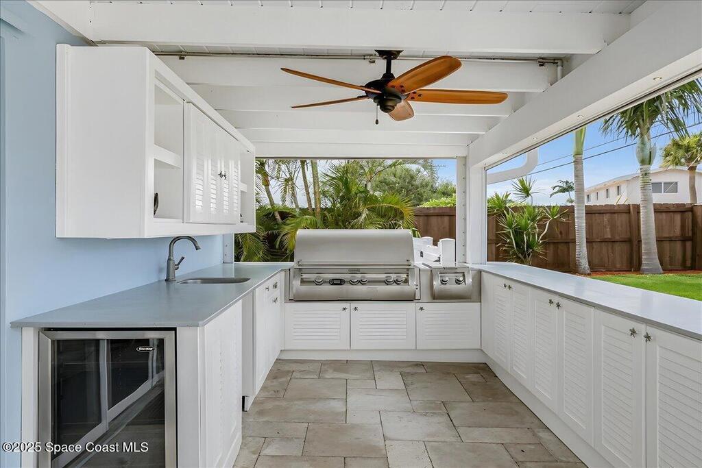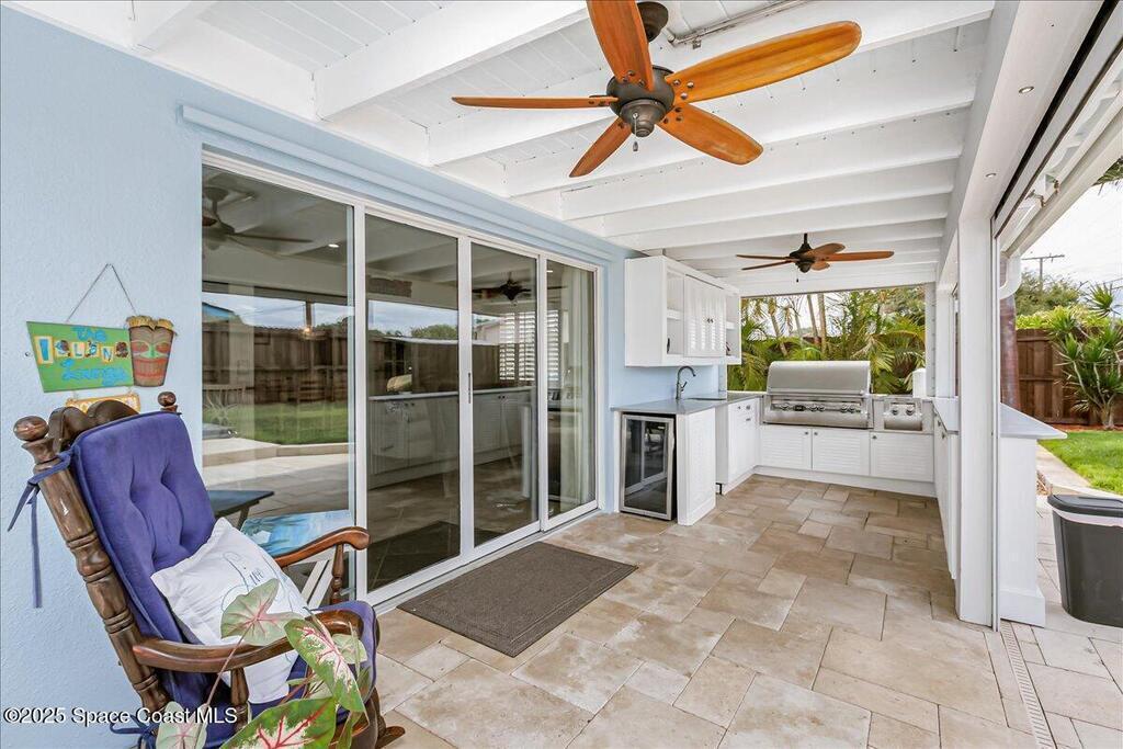 Beautifully updated Satellite Beach 4-bedroom pool home in move-in condition! The backyard is a tropical retreat featuring a large pool and spa, privacy fence, boat/RV parking, and a summer kitchen with TV, sink, fridge, grill, and electric hurricane screen. Enjoy the composite deck, firepit, and ideal entertaining space. Inside features wood and tile floors, plantation shutters, and a dream kitchen with granite, double ovens, gas range, stainless appliances, and bar with pull-out cabinets. Water filtration system under sink. The enclosed family room has a wood-burning fireplace and its own mini-split. Master suite includes French doors to the pool, walk-in closet, jetted tub, and walk-in shower. Major updates: new roof (2024), whole-house replumb, Cat 5 wiring, new pool/sprinkler pumps, tankless water heater. Close to beaches, A-rated schools, shopping, and dining. Simply a stunning beachside retreat you'll love to call home! Must see to appreciate.