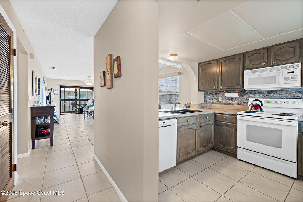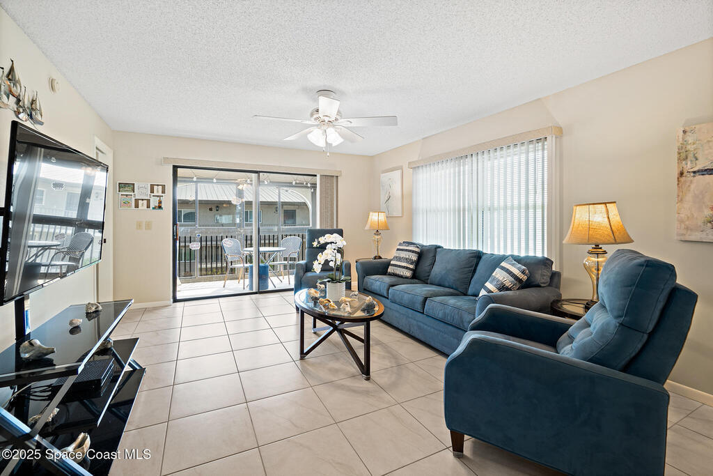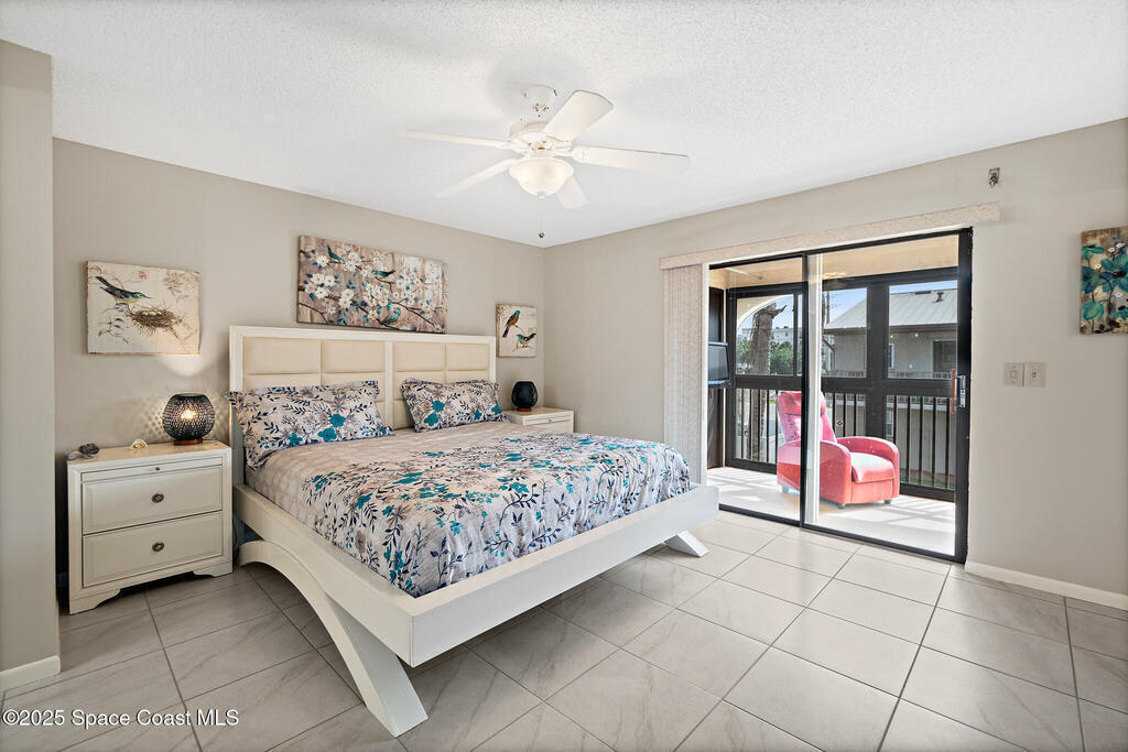 Minutes from the Atlantic Ocean and Port Canaveral, this FULLY FURNISHED 2-bed, 2-bath second-story condo offers the perfect beachside retreat. MOVE-IN READY and beautifully maintained, it features tile flooring throughout, impact windows, electric hurricane shutters, and an open living/dining floor plan. This END-UNIT condo features extra windows and abundant natural light. The split-bedroom layout provides privacy, and the updated kitchen includes a breakfast bar and eat-in space, ideal for entertaining or extended stays. Relax on the private shaded balcony with views of rocket launches. The spacious primary suite features an updated shower and walk-in closet. A new AC unit was installed in 2022 for year-round comfort. Includes a one-car garage with built-in shelving for extra storage. Near vibrant restaurants, nightlife, and entertainment, this immaculate condo offers a rental opportunity or your chance to own a slice of paradise and enjoy the Florida lifestyle year-round.