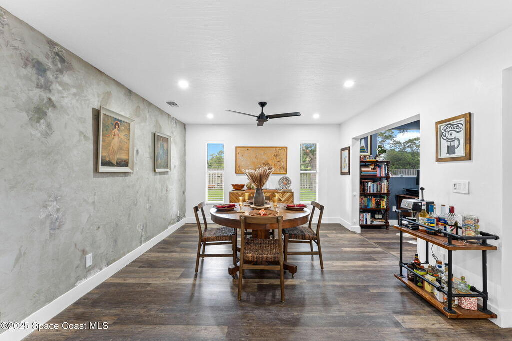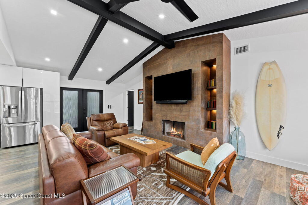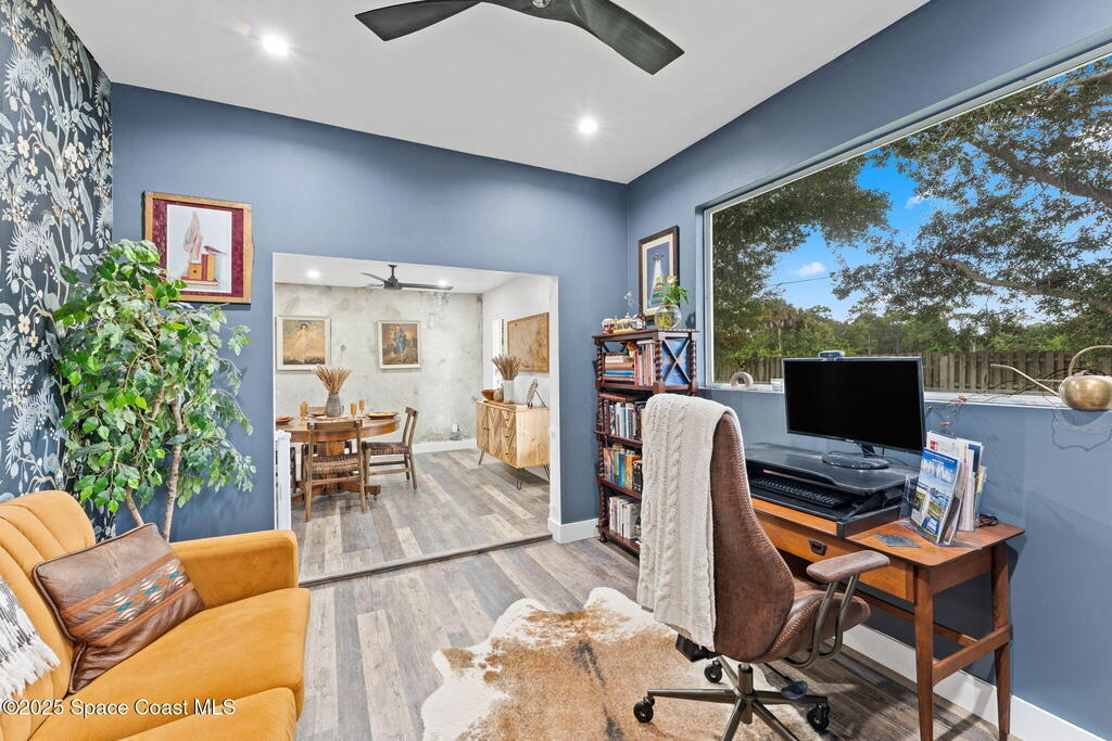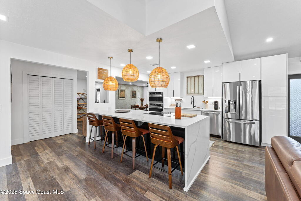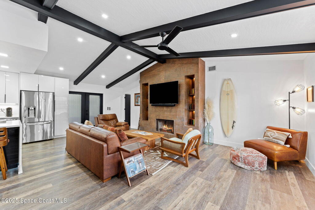 This Palm Bay gem brings all the vibes! With 3 bedrooms, 2 baths, and a 2-car garage, the open floorplan and vaulted ceilings make it feel light, bright, and wide open. The kitchen steals the show with a big island and wine cooler-perfect for cooking, sipping, or entertaining. Cozy up by the wood-burning fireplace, spread out with split bedrooms, and enjoy the convenience of LVT & tile floors throughout. Thoughtful updates include a tankless water heater, smart thermostat, and manual storm shutters for peace of mind. Outside, you'll love the screened patio, fenced yard, storage shed, and fire pit-perfect for gathering with friends under the stars. Stylish, functional, and move-in ready-this one checks all the boxes!