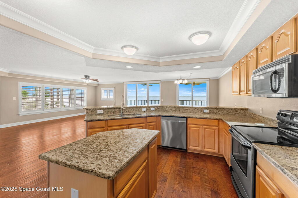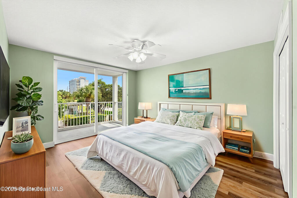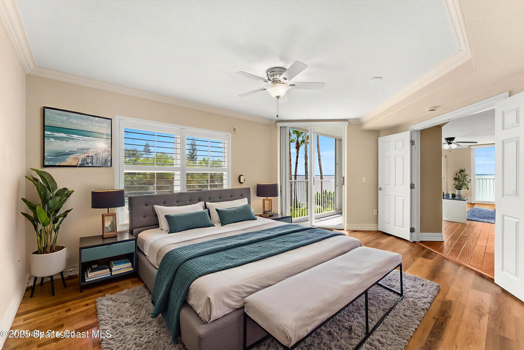 3 Bed, 3Bath + Office, South Corner Direct Condo. Dramatic panoramic views of the Banana River pull you in instantly, flooding the space with endless sky & shimmering water. Step outside & you're across the street from the beach, with front row access to both sunrise surf sessions & fiery river sunsets. Inside, hardwood floors, upgraded crown molding & an open layout w/ a central kitchen island create the perfect setting for gatherings that flow as easily as the view. With 3 beds, 3 baths & a French doored study, there is room to stretch out in style, while new impact sliders & hurricane shutters mean peace of mind comes built in. Beyond the residence, the lifestyle takes over as you dive into the pool, unwind in the spa, toast golden hour cocktails on the sunset dock, or host in the party room by the pool. When the night calls, Cocoa Beach is your playground w/ eclectic dining, live music, boutique shopping & a laid back energy that never loses its spark.