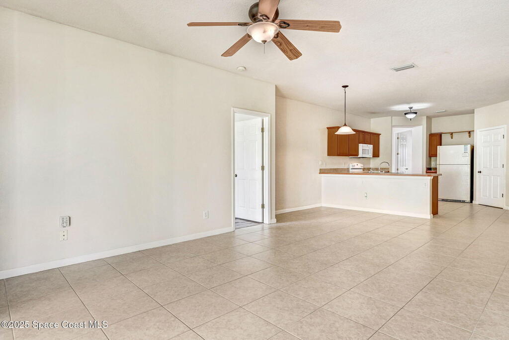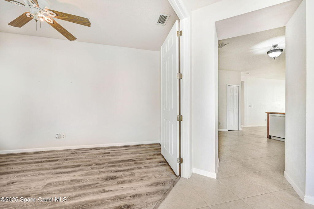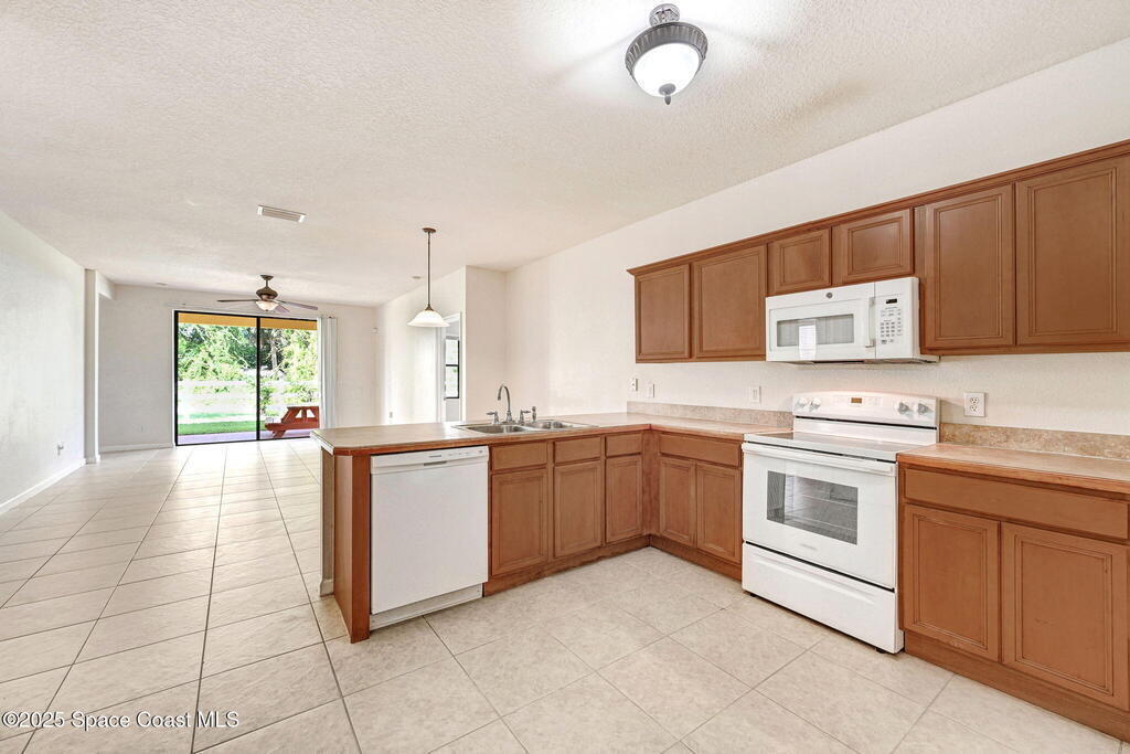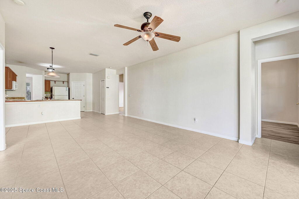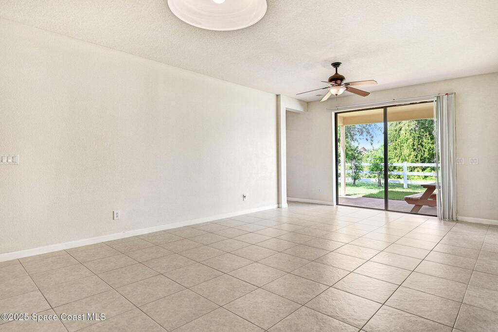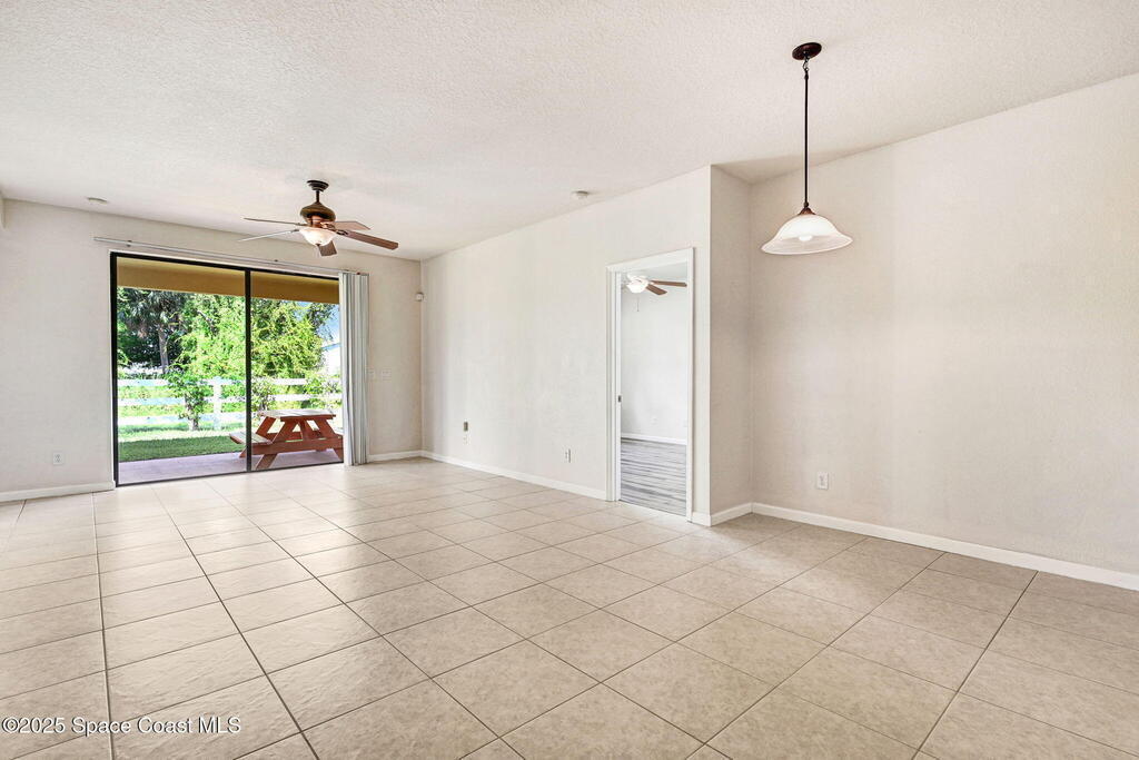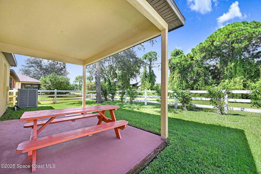 Four bedroom 2 bath home with a flex room looking out on the front lawn that could be used as a den, study, or 5th bedroom, if needed. Tile is installed in the main living areas and baths with luxury vinyl flooring in the bedrooms and great room. An open patio with picnic table at the back of the house is accessed thru the great room and looks out onto a green area with open vinyl fencing. Walk thru the interior laundry to access the 2 car garage equipped with a work area. Trees provide shading for the summer months. Convenient access to I95, the beaches, entertainment & Shopping. New roof will be installed, if needed after inspection, prior to closing.