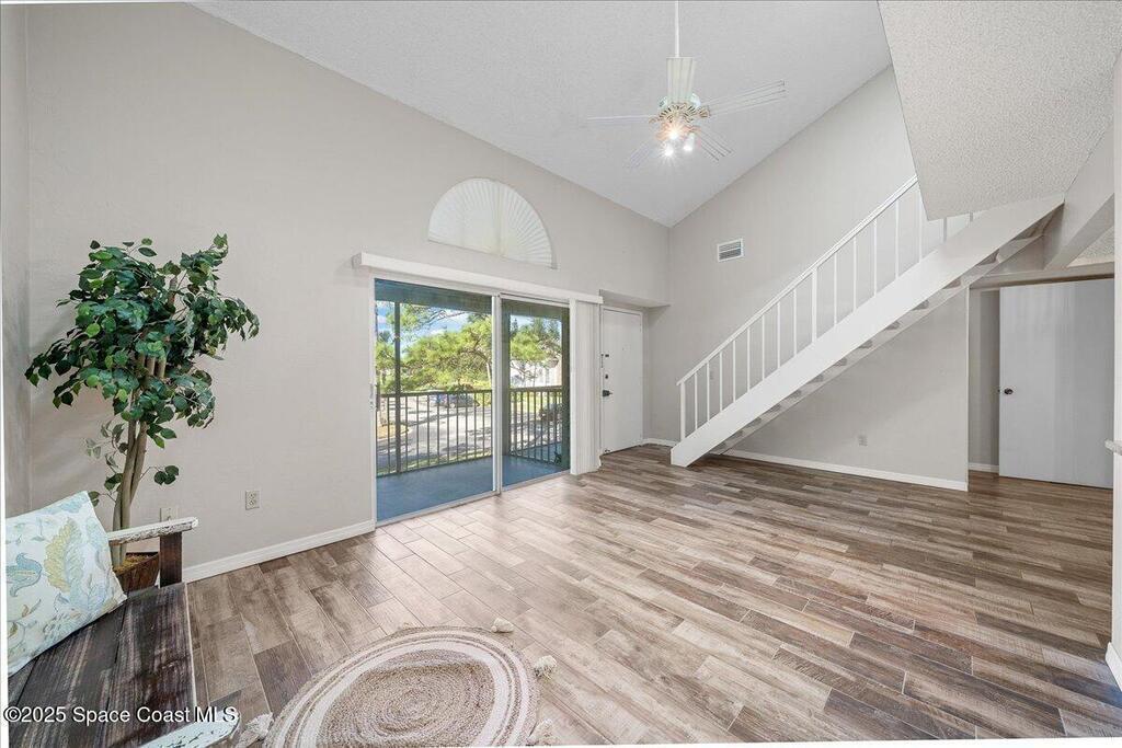 Perfect Location for easy access to I-95 , shopping, parks, downtown Melbourne & a short drive to area beautiful beaches. Welcome home to this ''move in ready condo'' (end unit) on 2nd level. Featuring an open plan design with family room, dining area, and newly updated kitchen with designer coastal color cabinets, granite countertops, tile backsplash, and a pass through / bar area. Main bedroom just off dining room with private bathroom and walk in closet. Wood look Tile plank flooring throughout. A quaint screened in front balcony has views of lake and faces community clubhouse / pool / tennis courts area. Access to laundry space is just off the balcony. Spacious Loft area can be used as 2nd bedroom, office or Flex space. Full bathroom just off the loft. Other features include: ceiling fans, window coverings, sky-lights, decorative mirror in dining area & storm door at entry. HOA includes: water, cable, i-net, roof, exterior paint. New A/C 2024 & breaker box with surge protector .