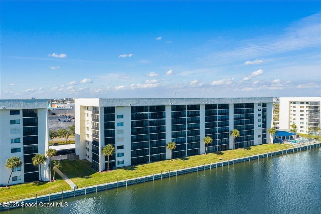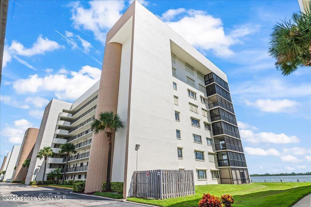 STILL TIME TO CLOSE BEFORE CHRISTMAS & CLAIM HOMESTEAD EXEMPTION. DIRECT WATERFRONT! Welcome home to Merritt Towers, a sought after waterfront community within walking distance to mall, dining, bank, Veterans Memorial Park, & new Health First hospital under construction. Centrally located on the Space Coast. Well funded & maintained association with approved 2026 budget the monthly condo fee will be 635.00. Active social committee. Water aerobics, cards, pickleball, 2 pools, sauna, hot tub, tennis, dog park! Enjoy the sunrise on your screened balcony. Watch dolphins play, step outside for the next rocket launch! So much to do. New paint & carpet in bedrooms. Kitchen features granite countertops and tiled backsplash with loads of cabinets. Waterfront primary suite with double vanities, custom built in walk in closet. Mirrored entry shows the shimmer of water from the moment you open the door. EZ commute to SpaceX, Blue Origin, NASA, Port Cruise Ships, Beaches, OIA, Cocoa Village.