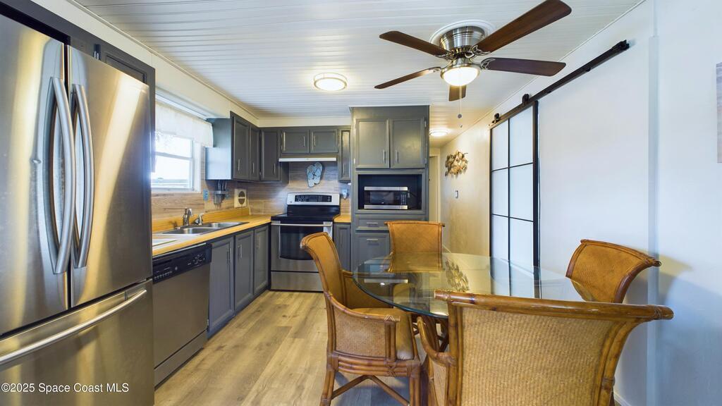 Turnkey and fully furnished, this updated Barefoot Bay home sits on a rare oversized corner lot and features 2 bedrooms plus a private bonus room, perfect as a 3rd bedroom or flex space and a second living room. Combining rustic charm with a coastal vibe, this beauty features an eat-in kitchen with stainless steel appliances, hard-surface flooring, a big bay window, and wood accent walls. Enjoy Florida coastal living with access to pools, clubhouse, tennis, pickleball, fishing pier, and more. Recent upgrades include a 2020 roof, repiping, new ductwork, vapor barrier, new ceilings, modern lighting, and the 2023 room addition (with central AC). Property also boasts hurricane shutters, indoor laundry, pantry, and workshop/storage. This pet- and golf-cart-friendly community has no age restrictions, with HOA fees conveniently included in your ad valorem taxes. Close to beaches, shopping, and dining, it's perfect for year-round living or a charming vacation retreat!
