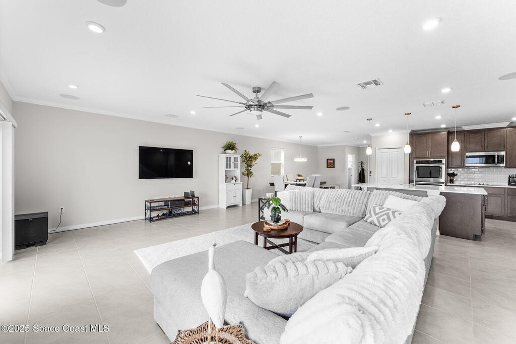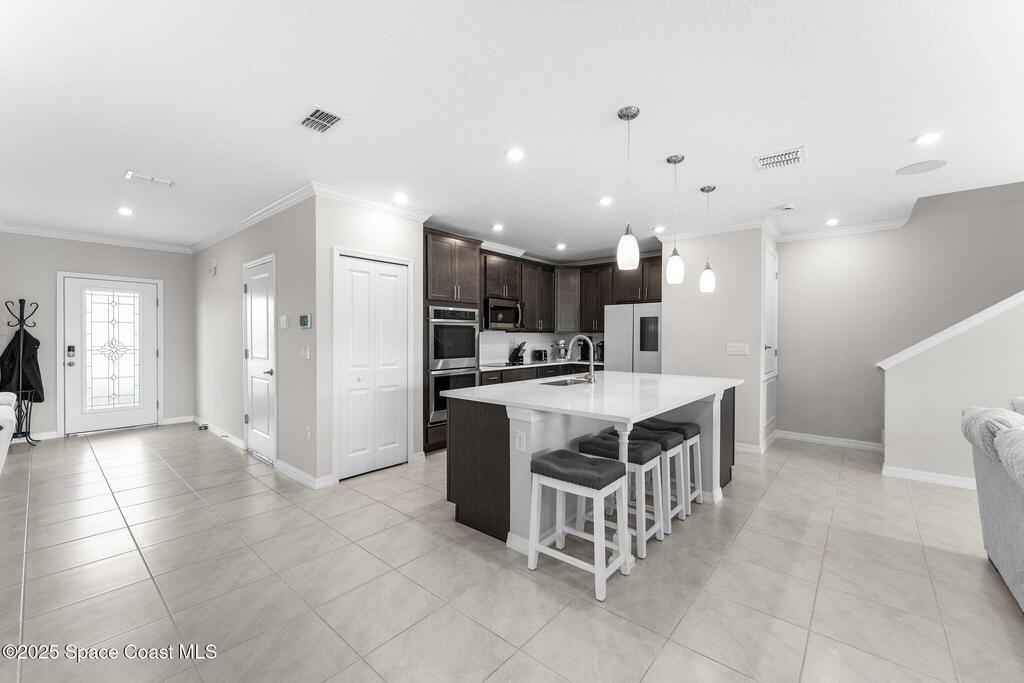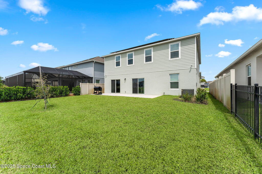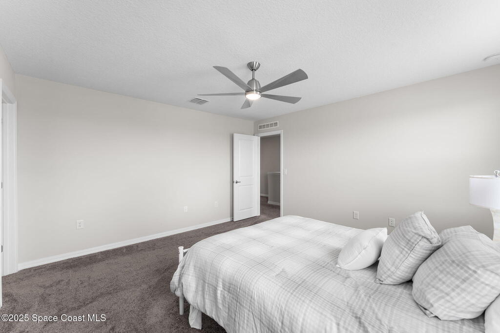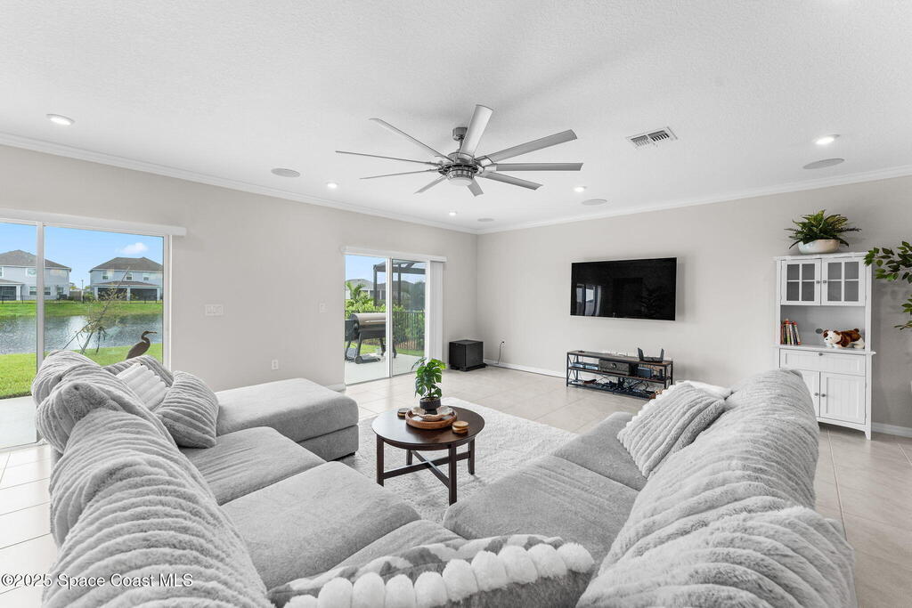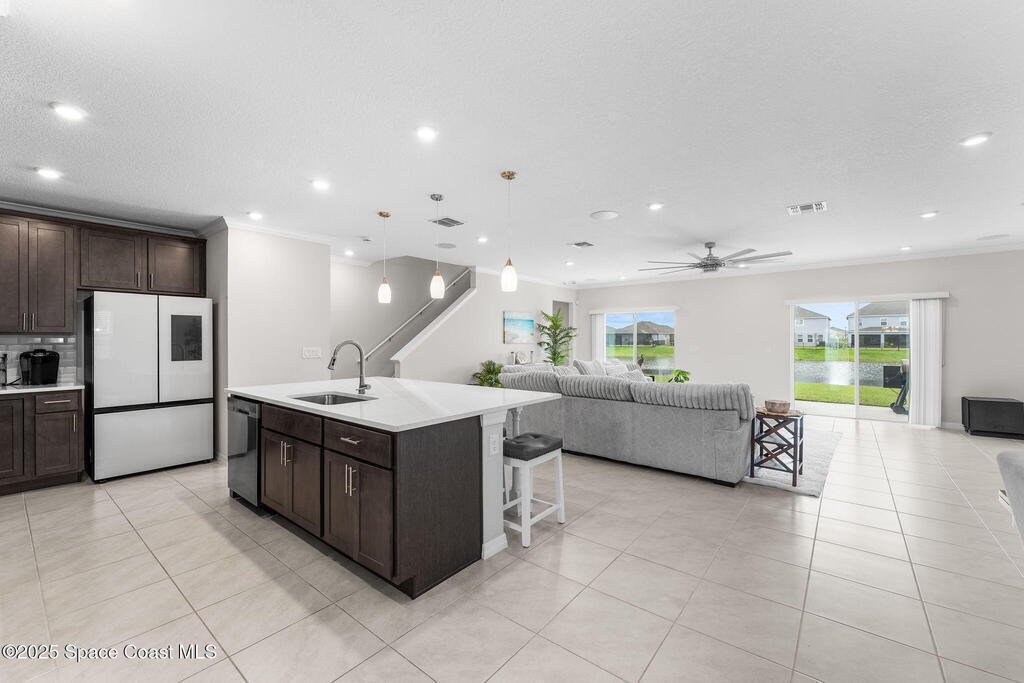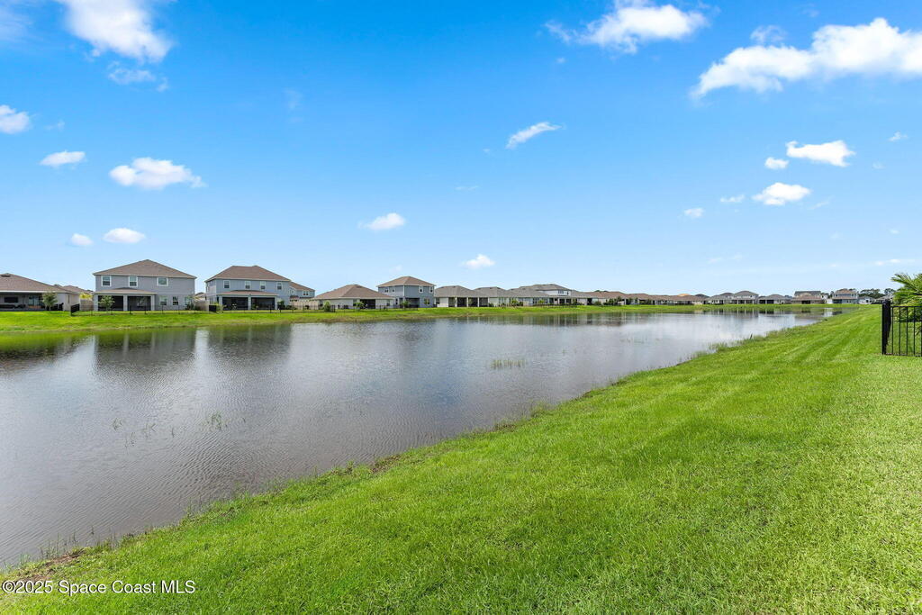 Step into the WOW FACTOR - a 2023-built lakefront stunner in Palm Bay's gated enclave. This 6-bedroom, 4.5-bath, 2-story home has space for everyone plus a 3-car garage to match. From the covered front porch to the open-concept island kitchen with quartz counters and surround sound system, every detail is dialed for modern living. Upstairs, retreat to your primary suite with a spa-worthy walk-in shower, walk-in closet, and laundry just steps away (yes, laundry upstairs-game changer!). Bonus: a full guest suite downstairs for visitors or multi-gen living. Tile and carpet flooring, a full security system, manual storm shutters, and a backyard lake view worth lingering over round out the perks. Big family? Big dreams? Big vibes? This one's got you!