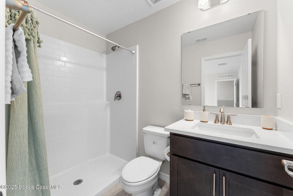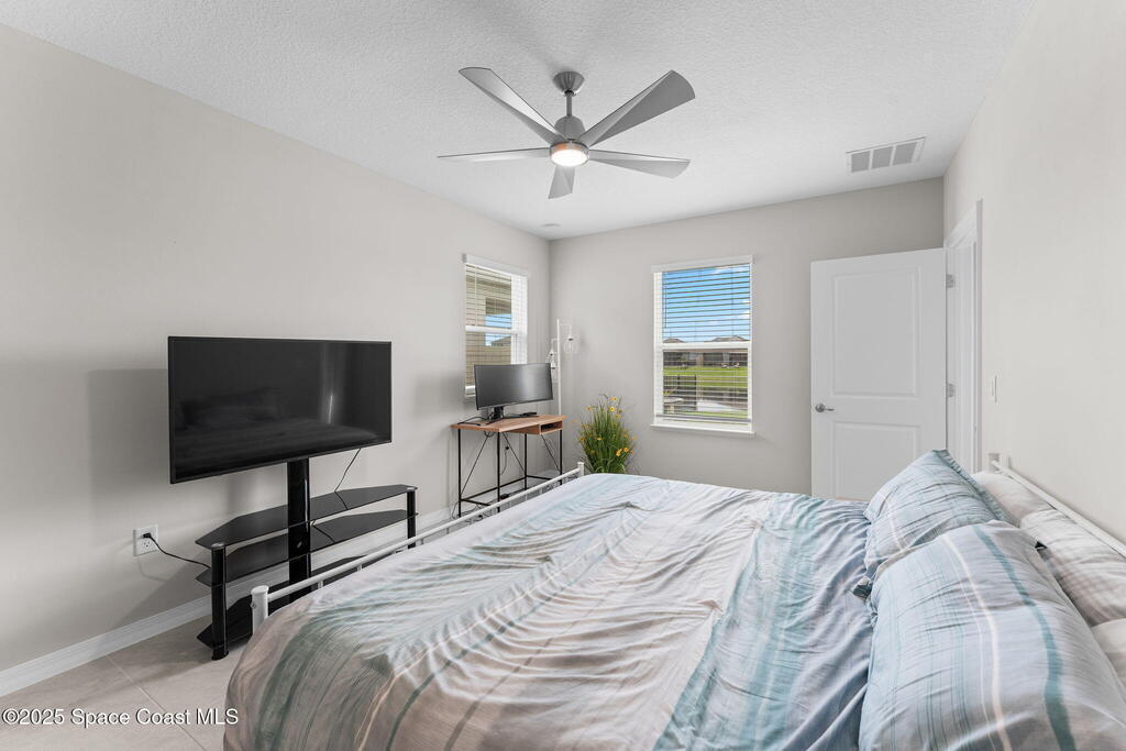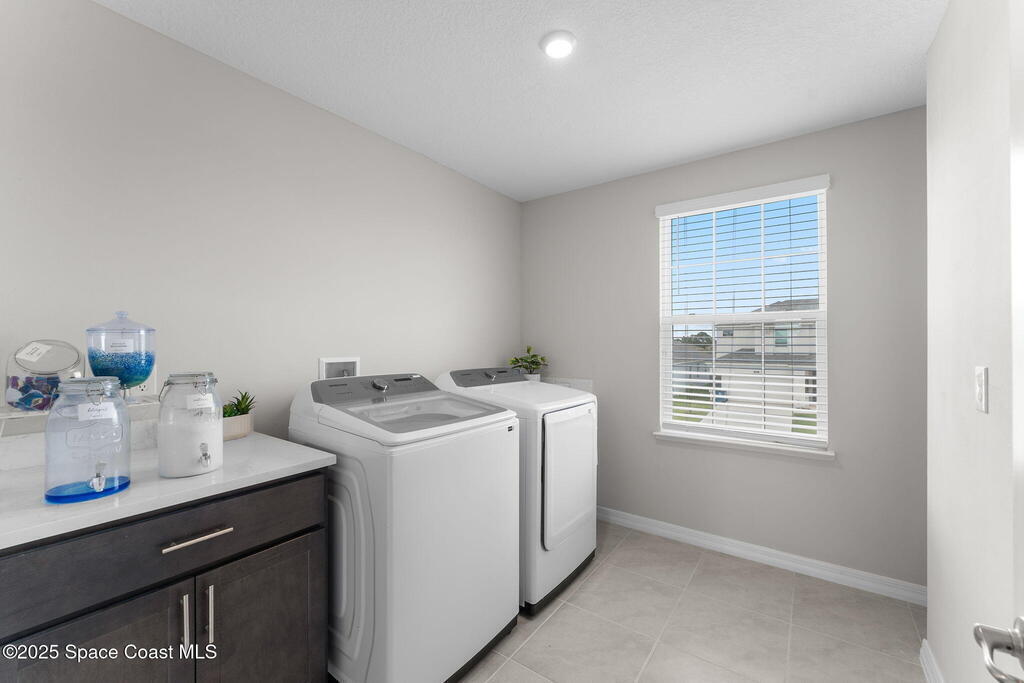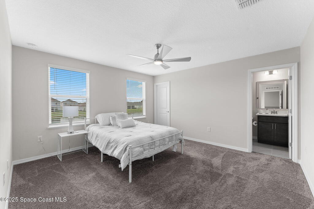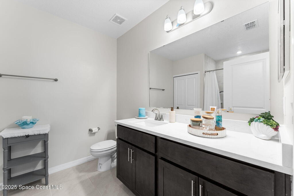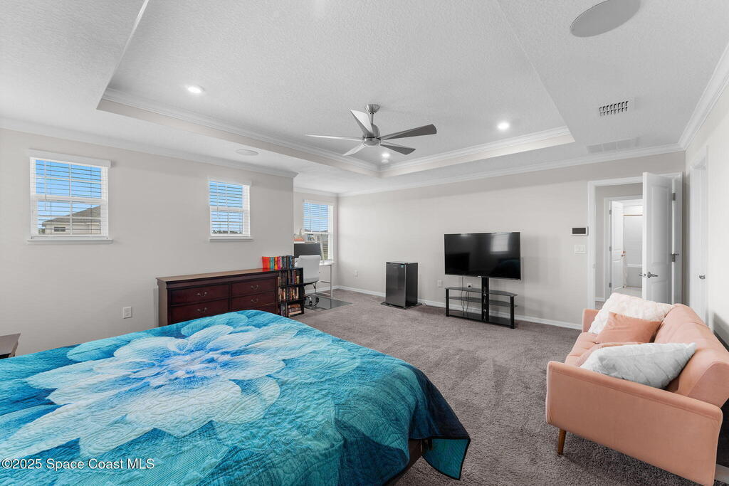 Step into the WOW FACTOR - a 2023-built lakefront stunner in Palm Bay's gated enclave. This 6-bedroom, 4.5-bath, 2-story home has space for everyone plus a 3-car garage to match. From the covered front porch to the open-concept island kitchen with quartz counters and surround sound system, every detail is dialed for modern living. Upstairs, retreat to your primary suite with a spa-worthy walk-in shower, walk-in closet, and laundry just steps away (yes, laundry upstairs-game changer!). Bonus: a full guest suite downstairs for visitors or multi-gen living. Tile and carpet flooring, a full security system, manual storm shutters, and a backyard lake view worth lingering over round out the perks. Big family? Big dreams? Big vibes? This one's got you!