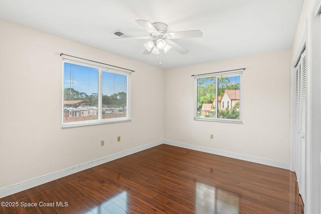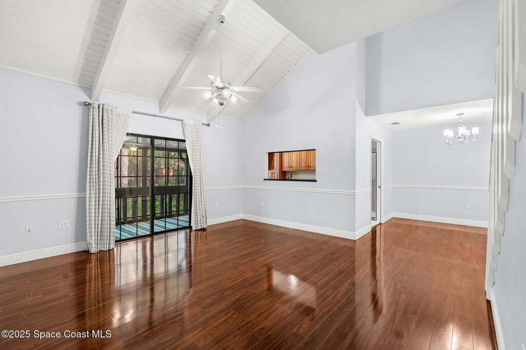 This rare end unit offers exceptional privacy and a versatile layout, complete with a cozy carpeted loft that can serve as a home office, guest lounge, or creative lifestyle space. Rich hardwood floors, a covered lanai and soaring vaulted ceilings create an open, inviting atmosphere, while the convenience of an in-unit washer & dryer adds everyday ease. Just minutes from Melbourne Square Mall and quick access to I-95, the location balances peaceful living with effortless connectivity. Within Greenwood's gated community, residents enjoy resort-style amenities including a sparkling pool, hot tub, sauna, tennis & racquetball courts, shuffleboard, fitness center, and a vibrant clubhouse. Association fees cover essentials like cable, internet, lawn care, pest control, insurance, and even roof replacement, ensuring worry-free ownership.